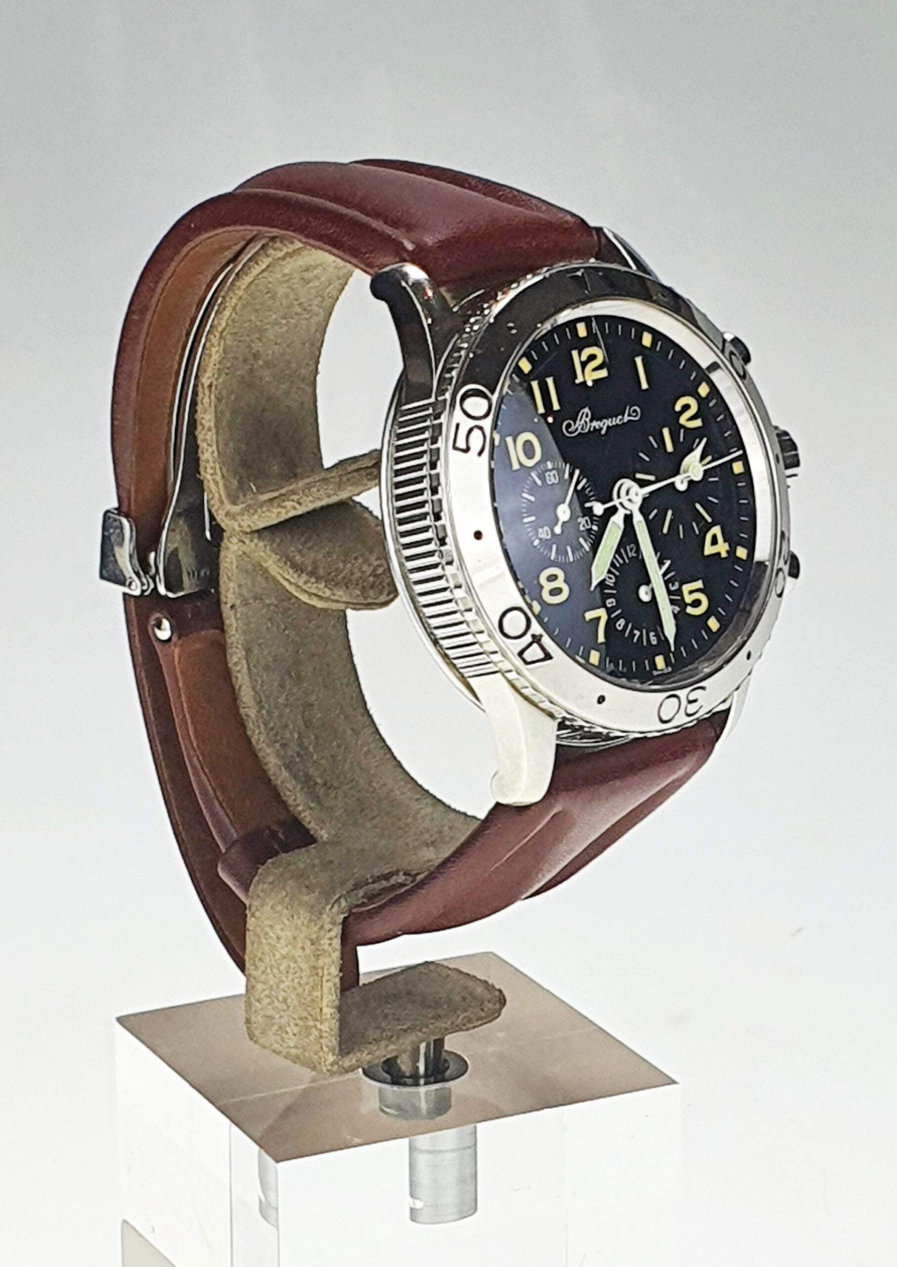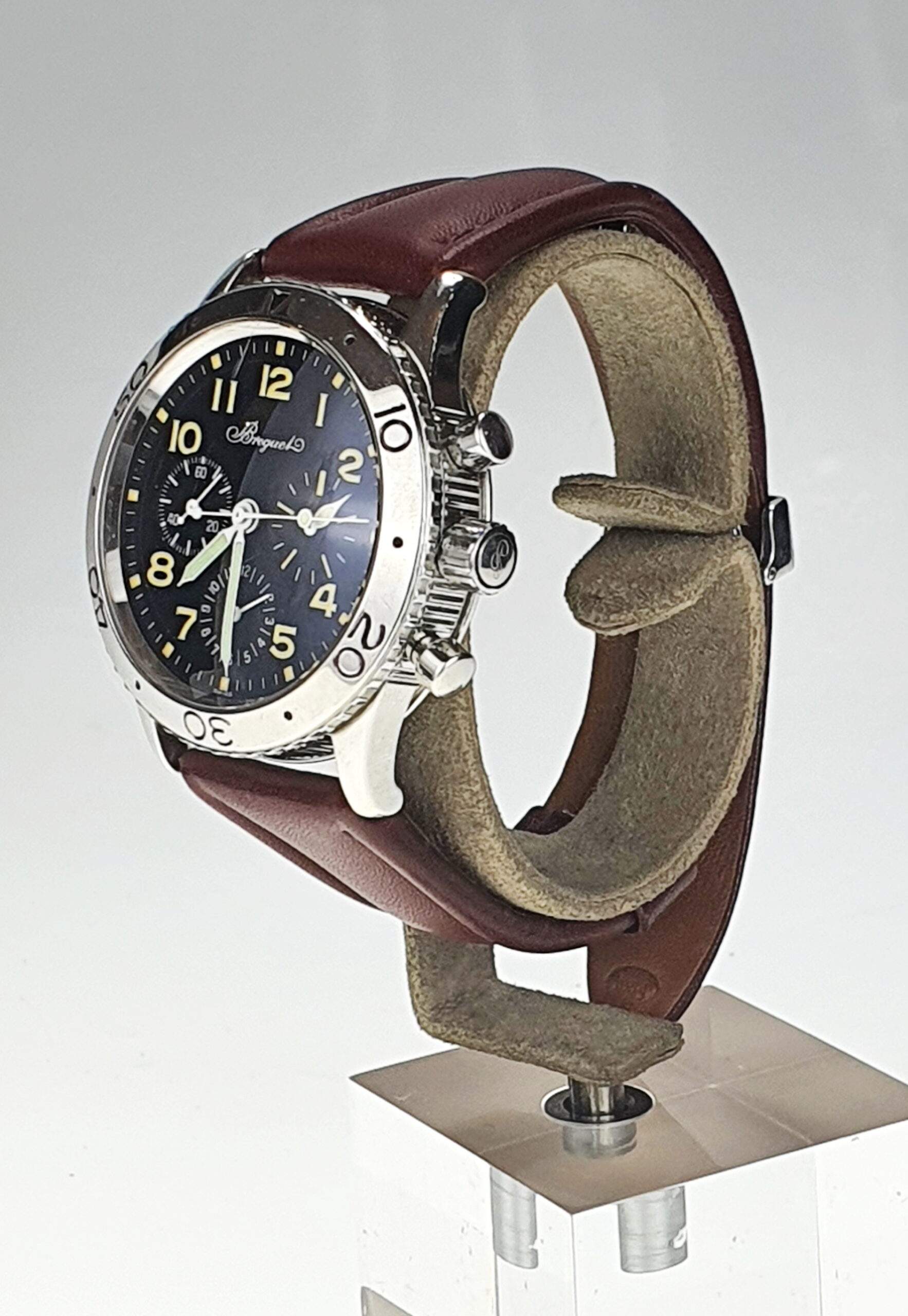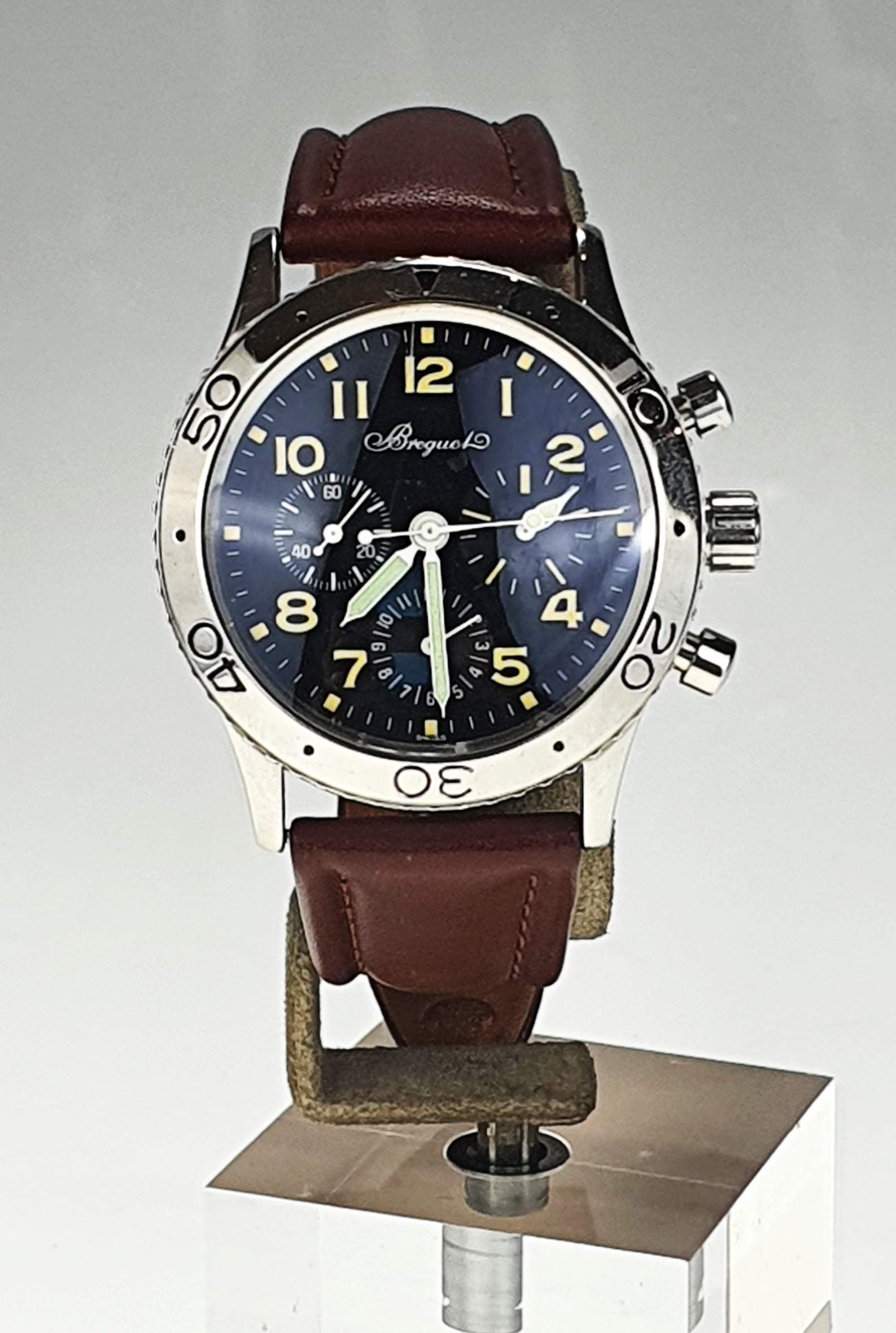 Il Breguet Aéronavale Type XX è un orologio cronografo automatico del 1990, progettato per l’aeronautica militare. Con una cassa in acciaio da 39 mm, vetro zaffiro antigraffio, e impermeabilità fino a 100 metri, combina robustezza e stile elegante. Il quadrante nero con numeri arabi e indici luminosi garantisce leggibilità ottimale. Dotato di movimento flyback e riserva di carica di 48 ore, questo modello unisce funzionalità avanzate e design raffinato, ideale per collezionisti.
