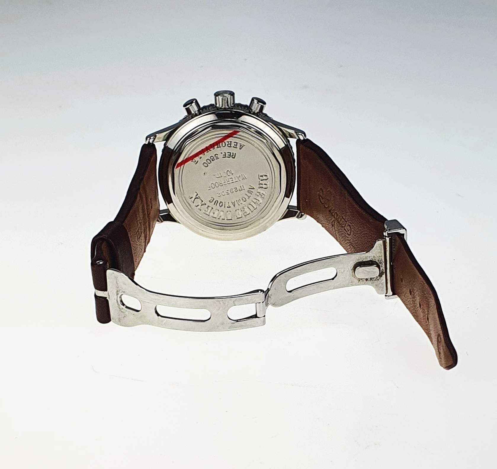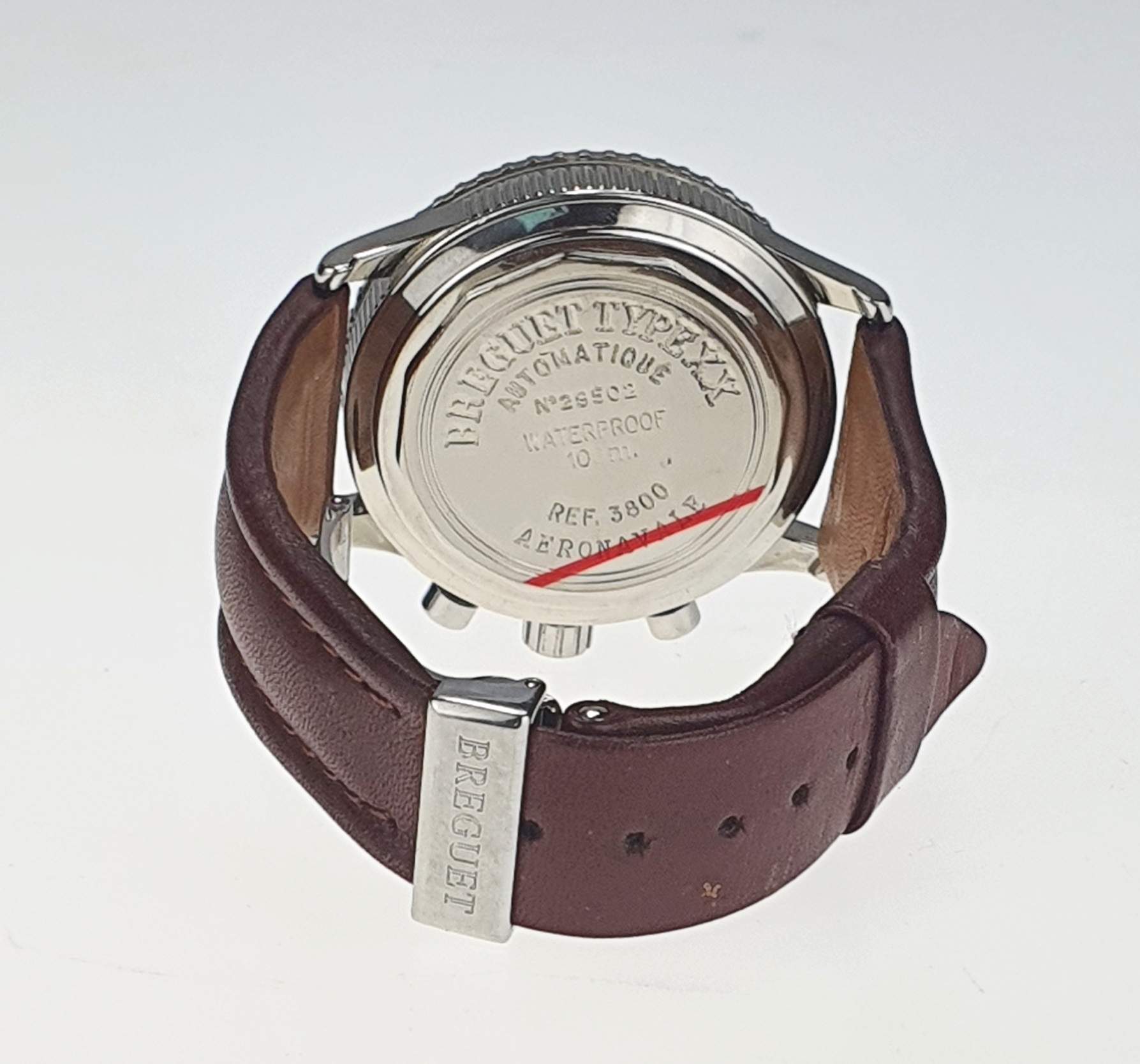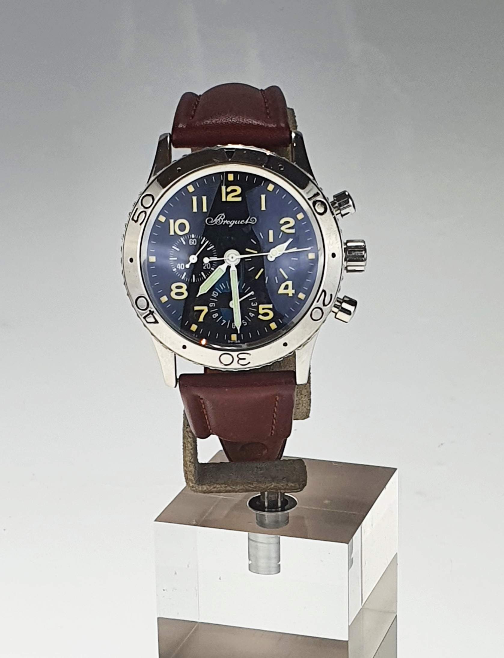 Il Breguet Aéronavale Type XX è un orologio cronografo automatico del 1990, progettato per l’aeronautica militare. Con una cassa in acciaio da 39 mm, vetro zaffiro antigraffio, e impermeabilità fino a 100 metri, combina robustezza e stile elegante. Il quadrante nero con numeri arabi e indici luminosi garantisce leggibilità ottimale. Dotato di movimento flyback e riserva di carica di 48 ore, questo modello unisce funzionalità avanzate e design raffinato, ideale per collezionisti.
