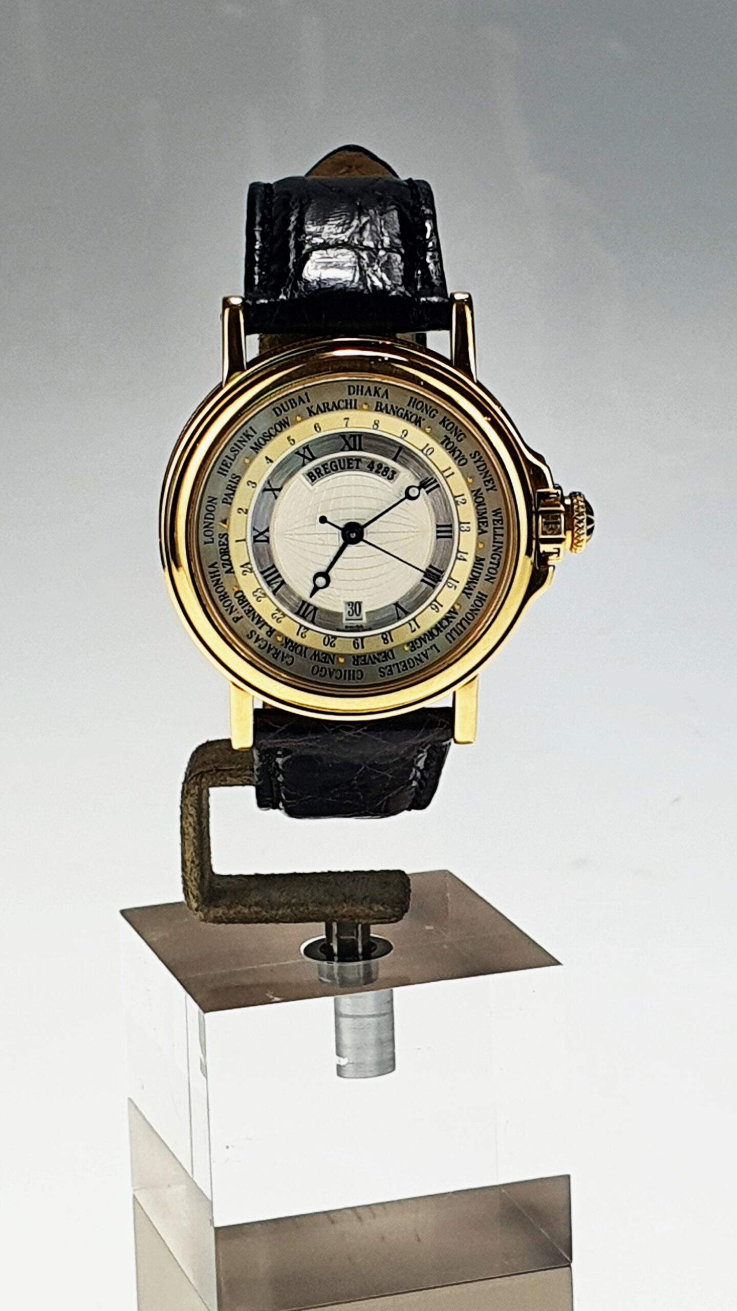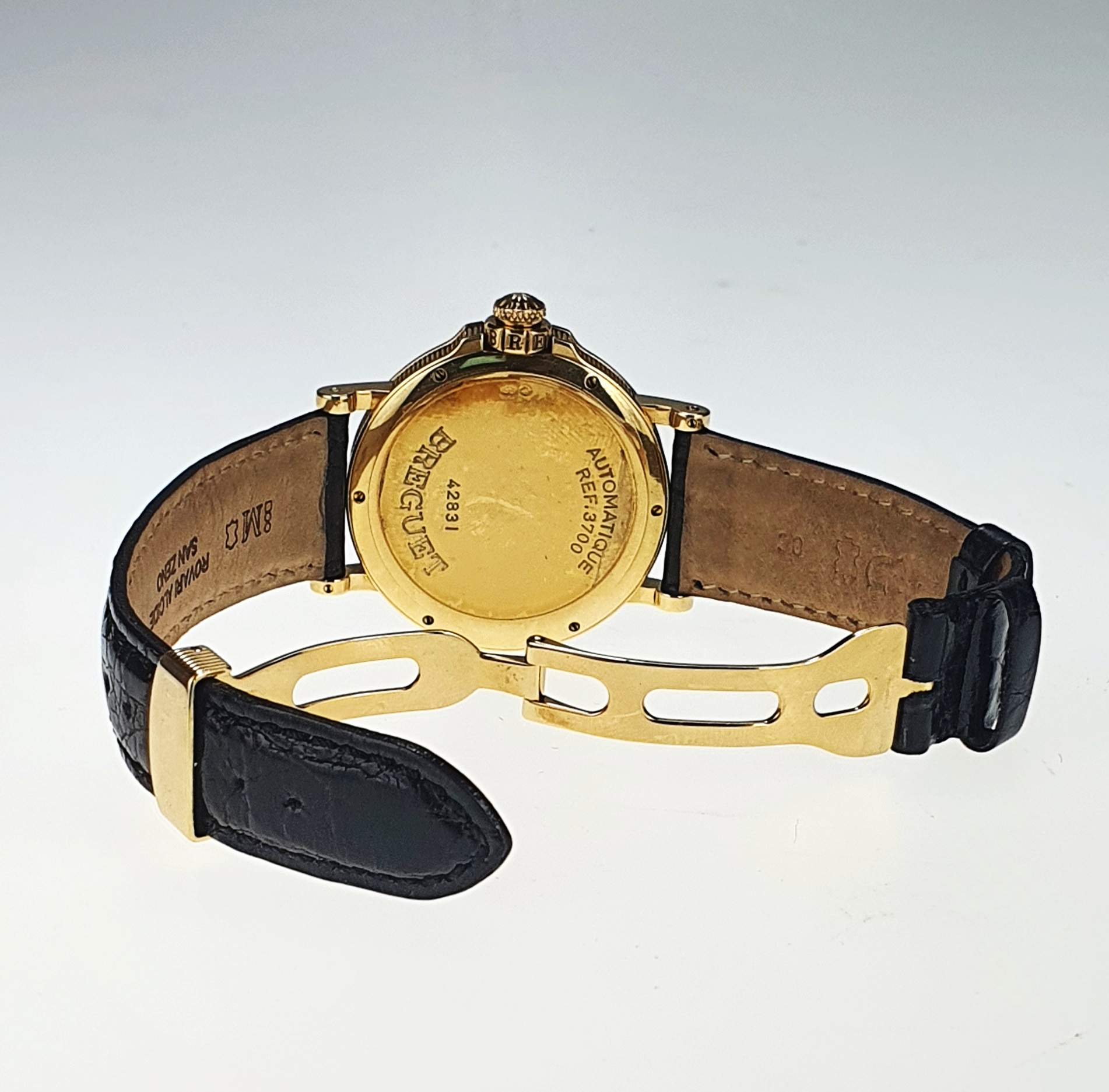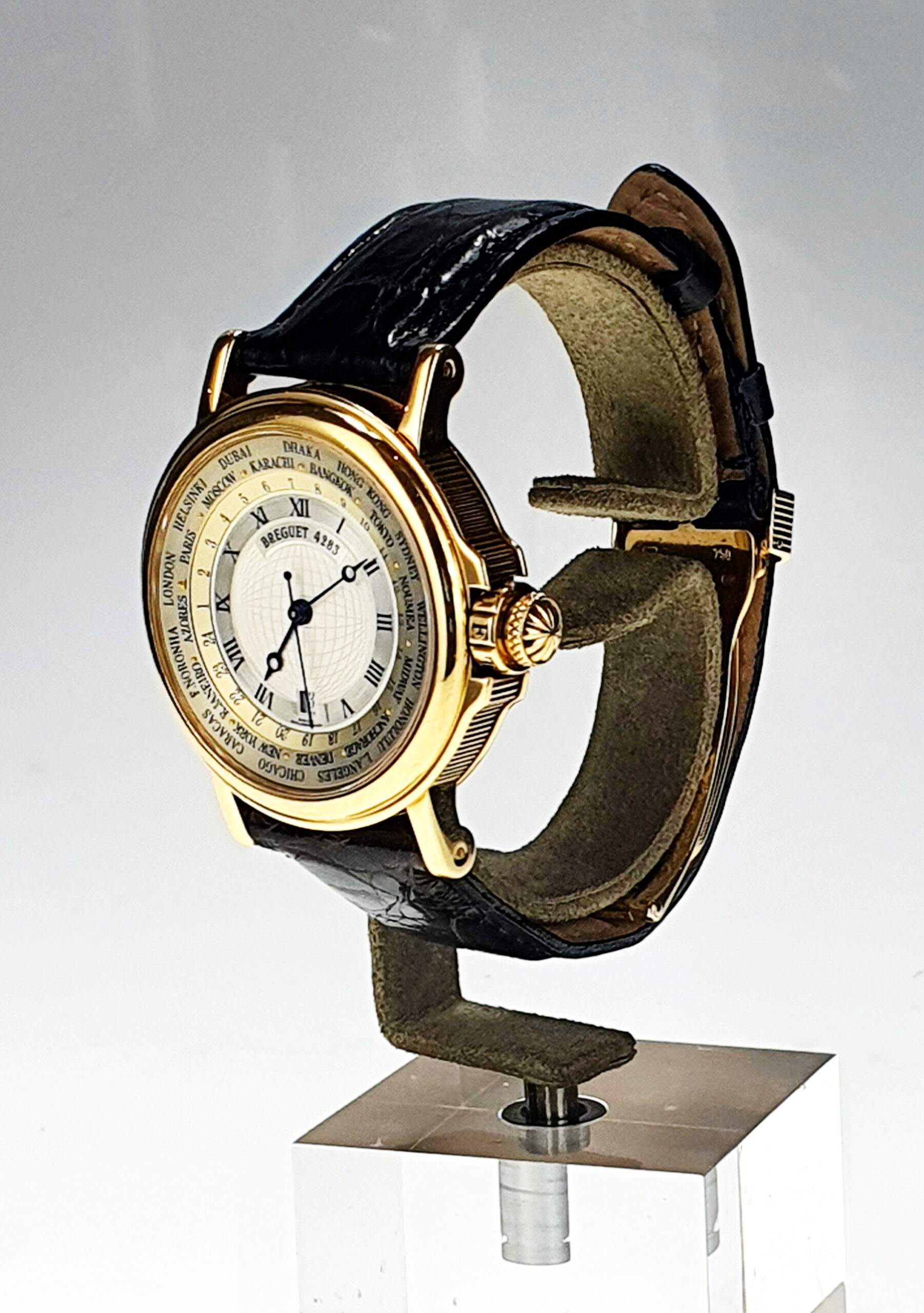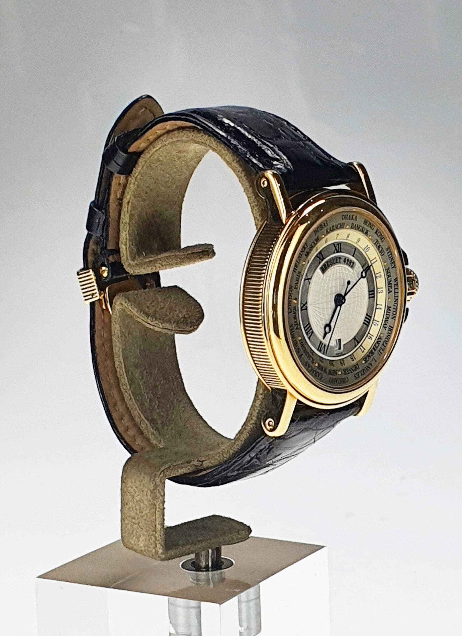 Il Breguet Hora Mundi Marina è un orologio del 2000 in oro giallo con cassa da 38 mm, caratterizzato da una funzione GMT con indicazione delle 24 ore e città del mondo sul quadrante esterno. Presenta un datario a ore 6, quadrante dorato e numeri romani e arabi. Impermeabile fino a 30 metri, è corredato dalla scatola e garanzia originali. Il cinturino in pelle nera ha una chiusura deployante in oro.