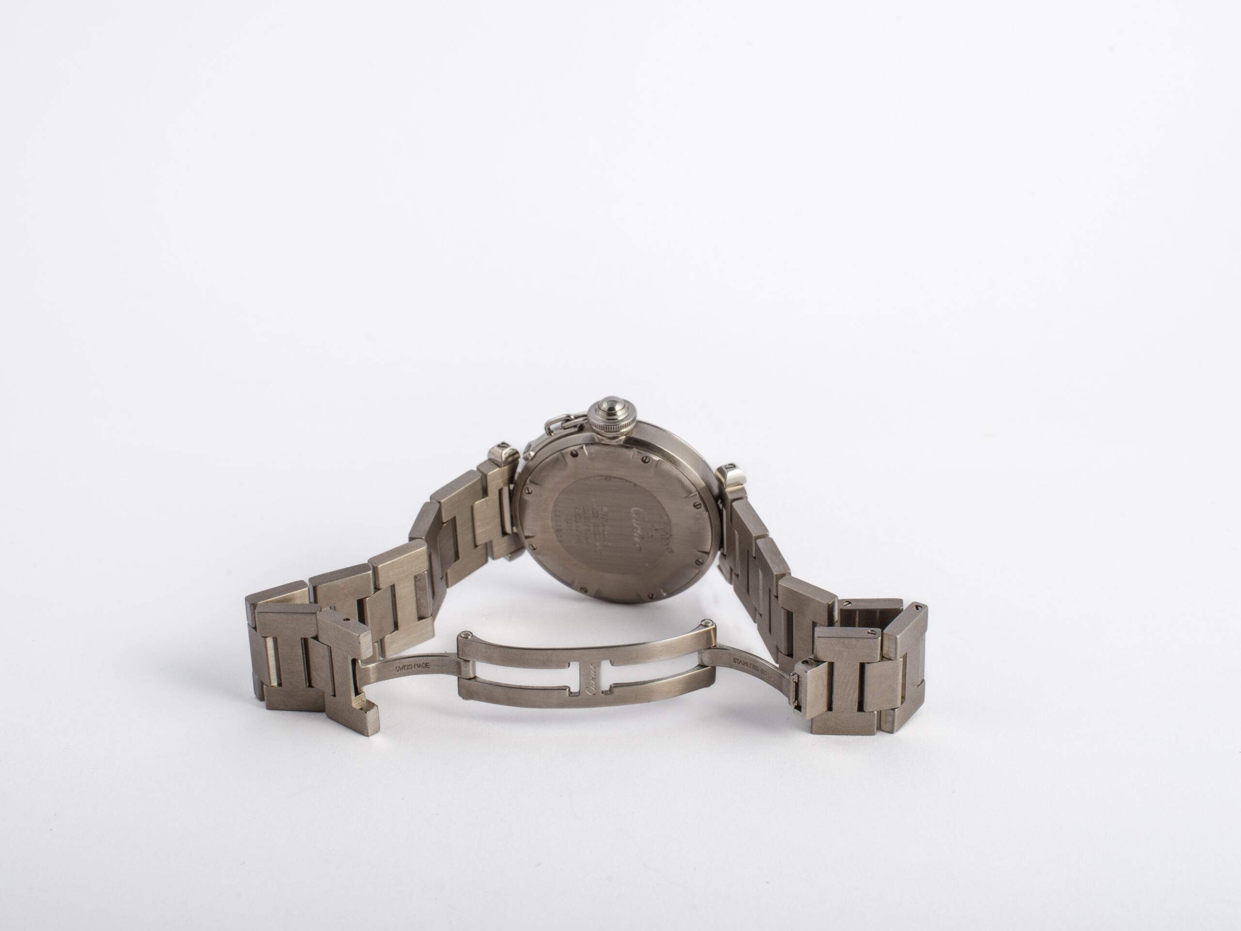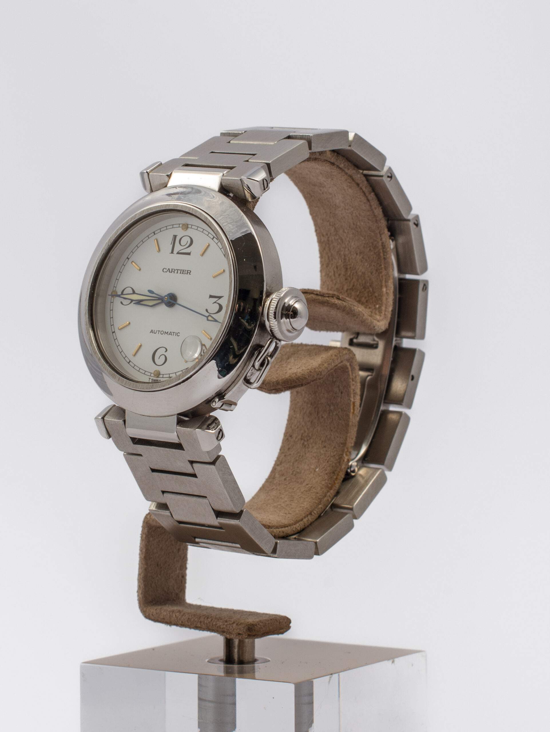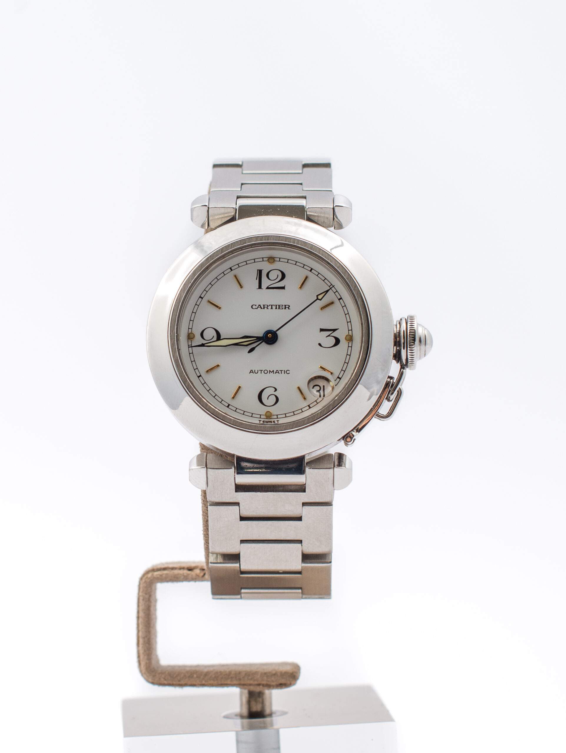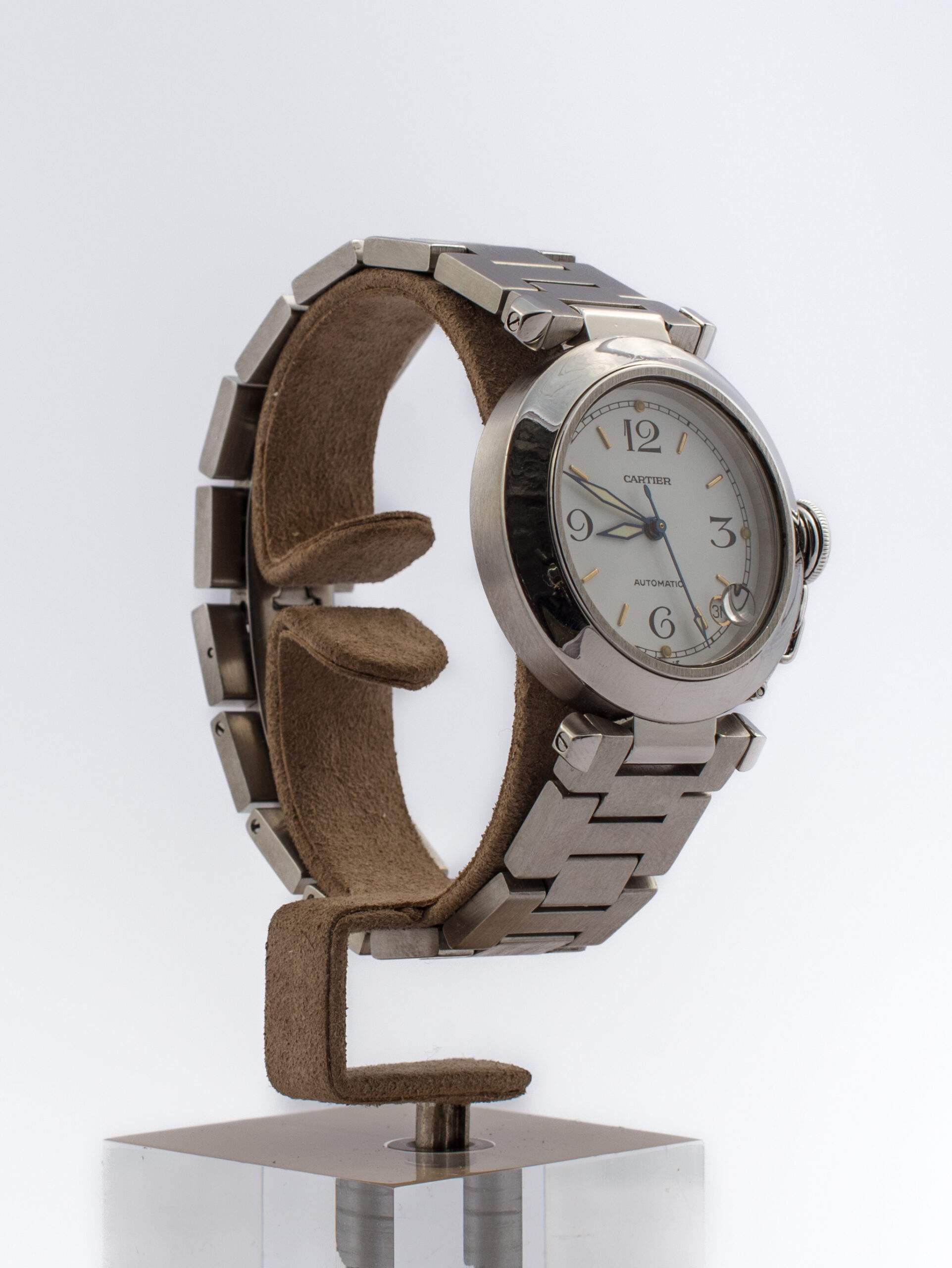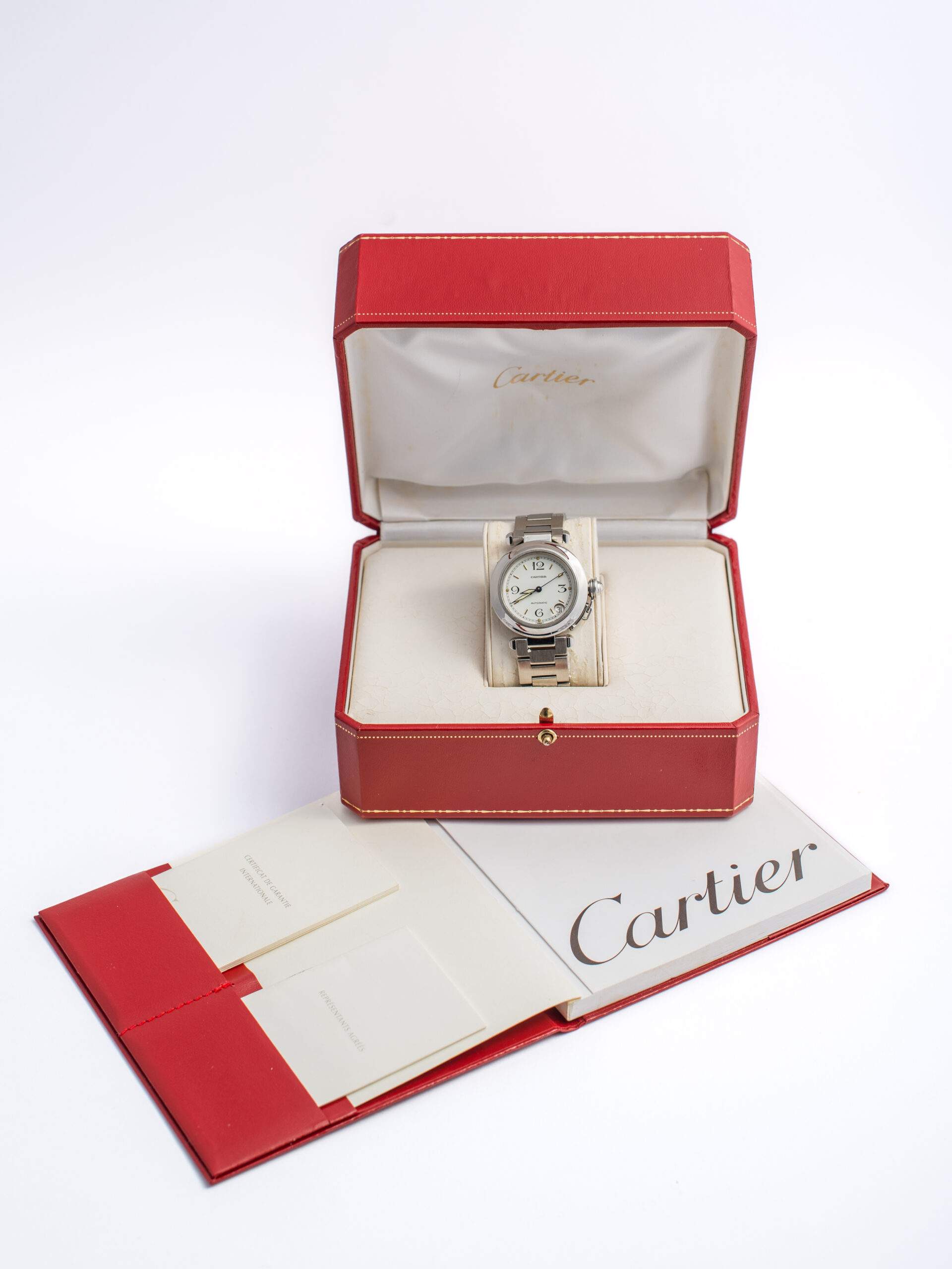 Il Cartier Pasha del 1999 ha una cassa in acciaio da 35 mm, quadrante bianco con numeri arabi ai quarti e indici a bastone. È dotato di movimento automatico con riserva di carica di 42 ore, vetro zaffiro, cinturino e chiusura in acciaio. È impermeabile fino a 100 metri e si presenta in ottime condizioni di conservazione, completo di scatola e garanzia originali.