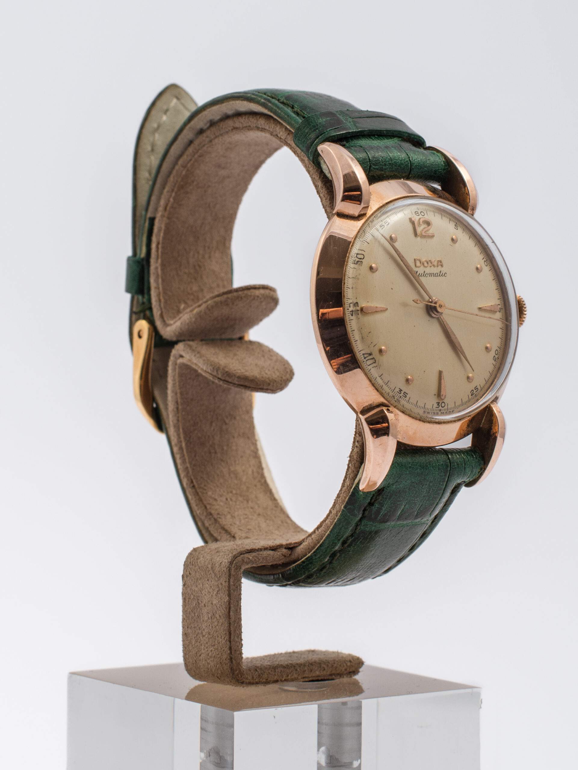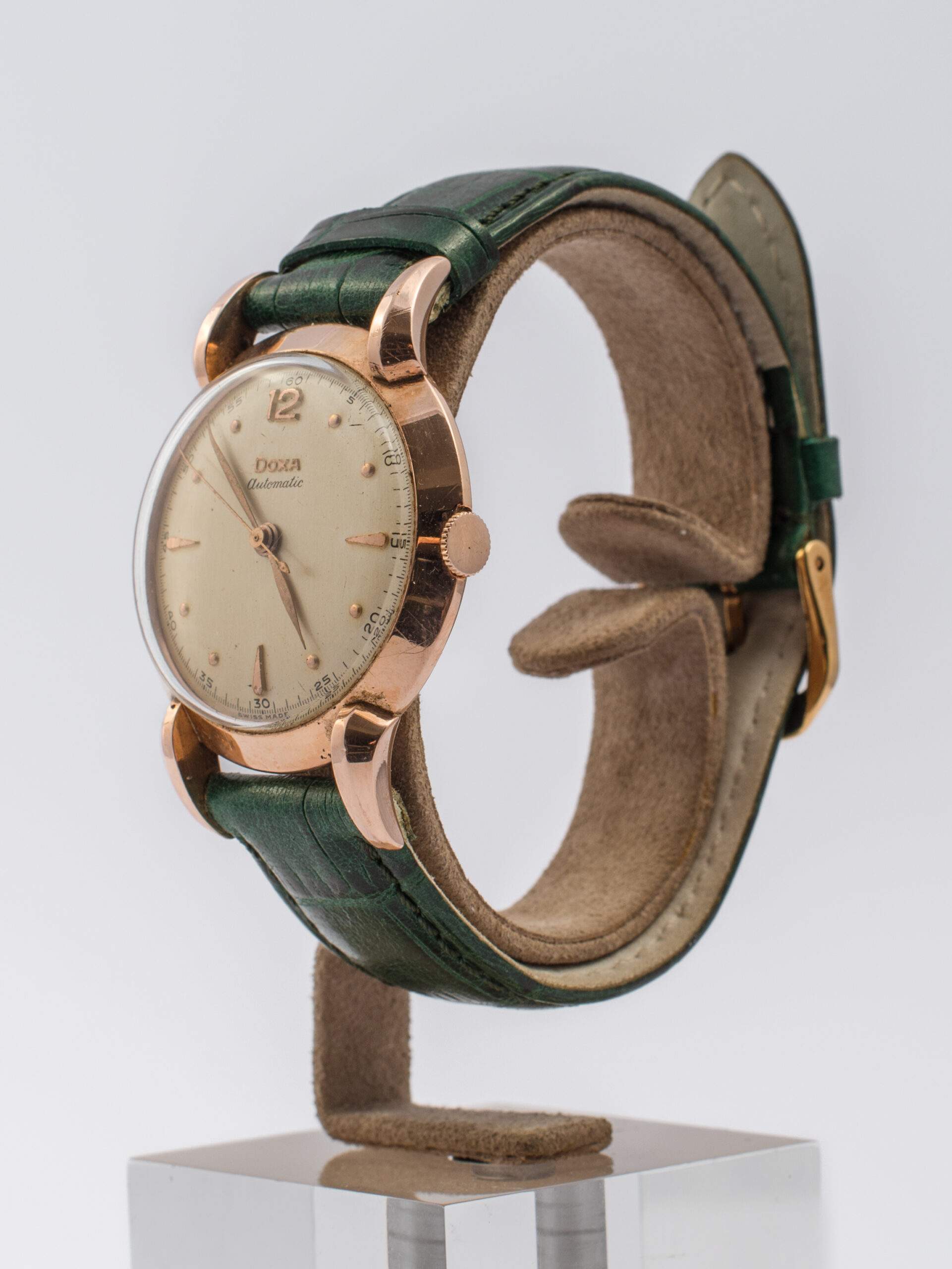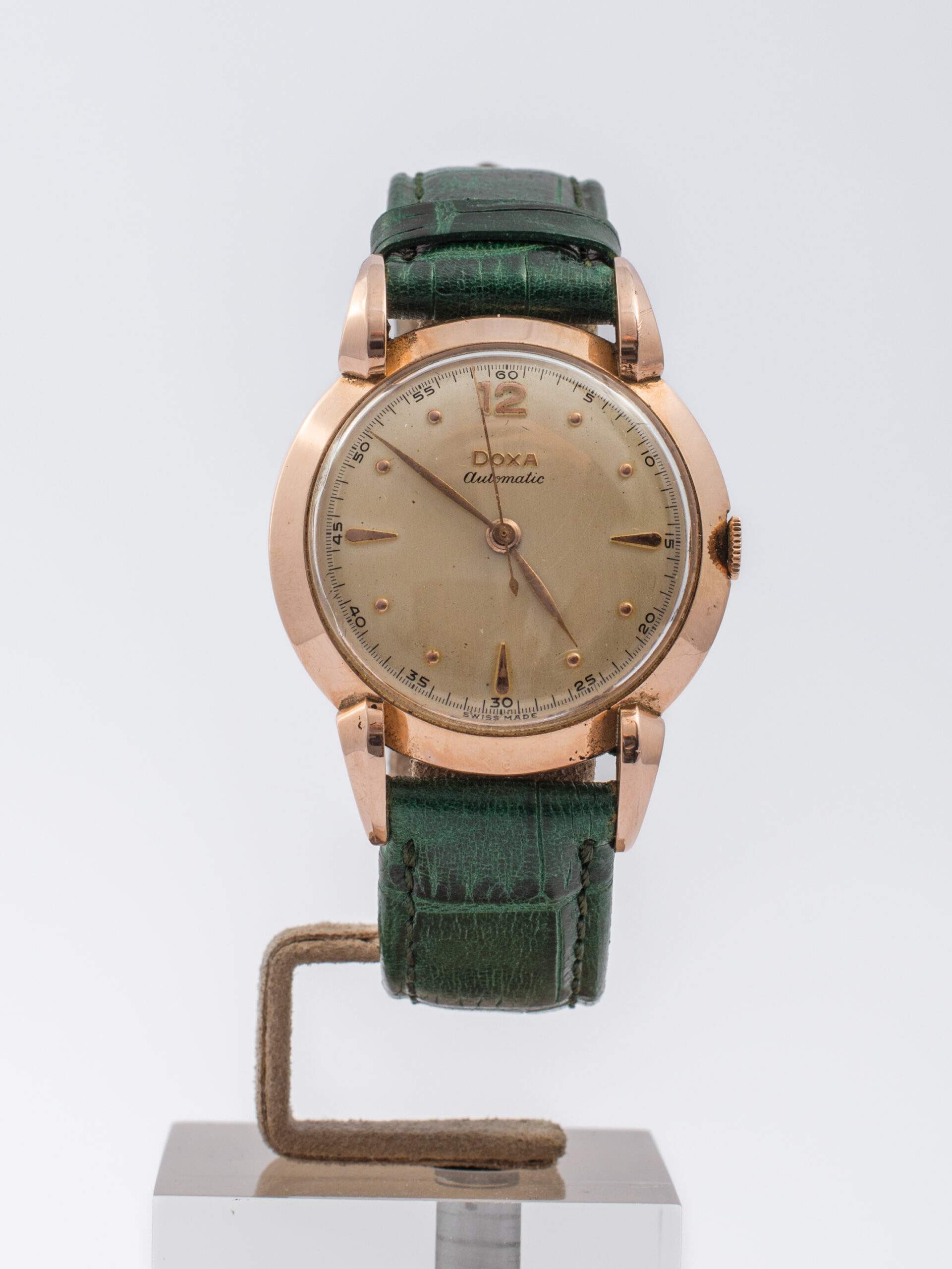 Il Doxa Bumper degli anni ’50 è un orologio vintage in ottimo stato di conservazione. Presenta una cassa in oro rosa 14 kt da 35 mm, con vetro Esalite e quadrante dorato, numeri arabi e indici a pallettoni. È dotato di un movimento automatico “Bumper” e un cinturino in pelle verde con fibbia ad ardiglione in metallo placcato.