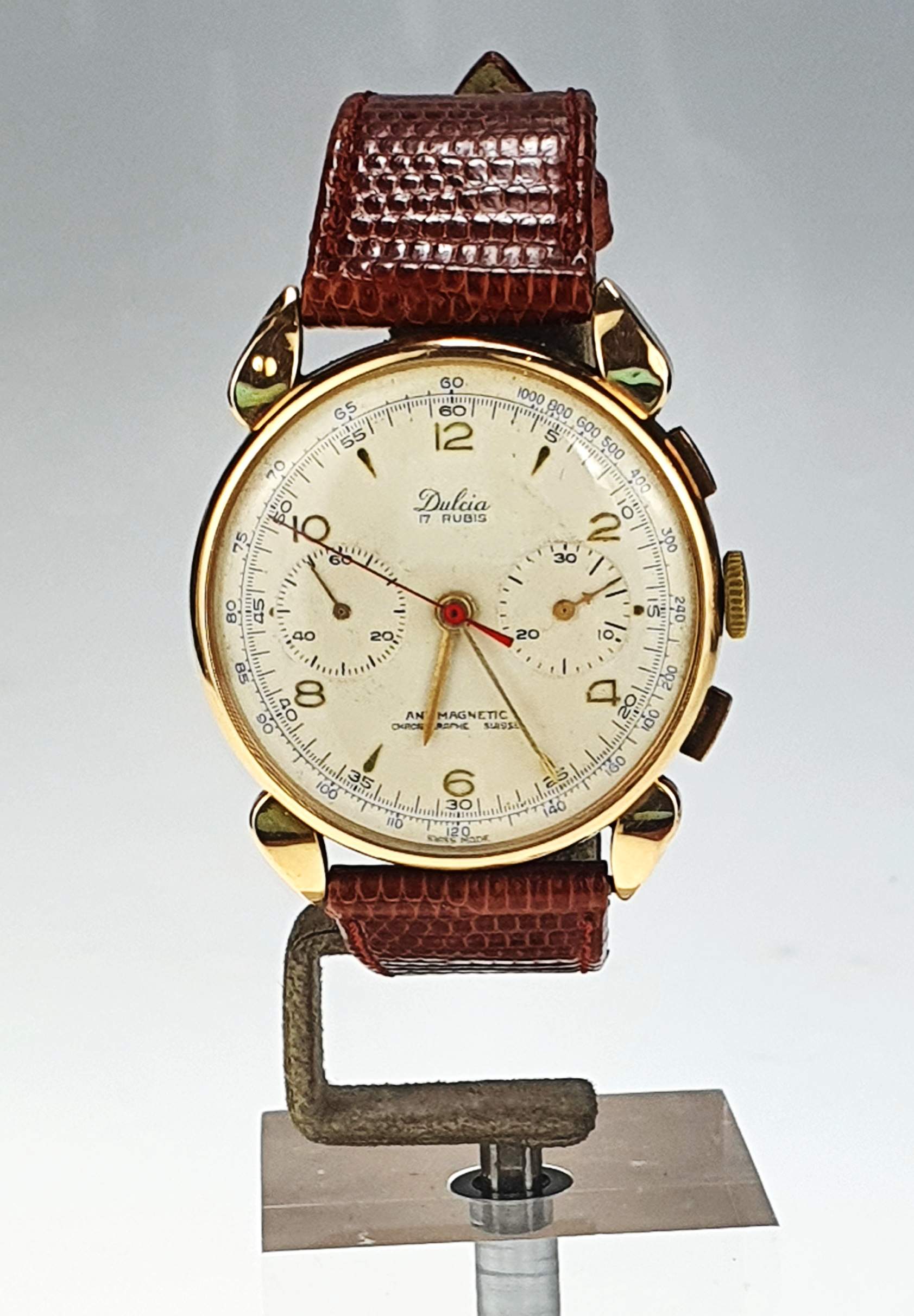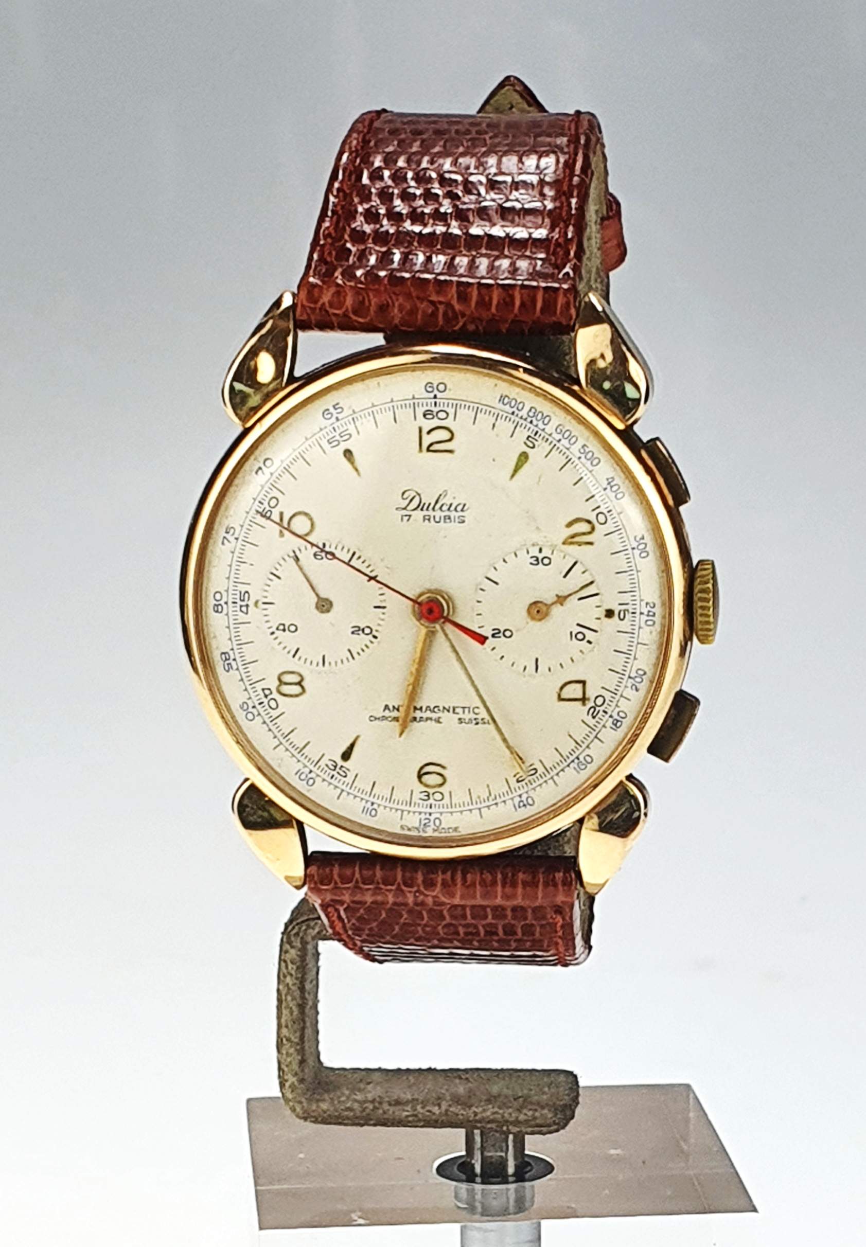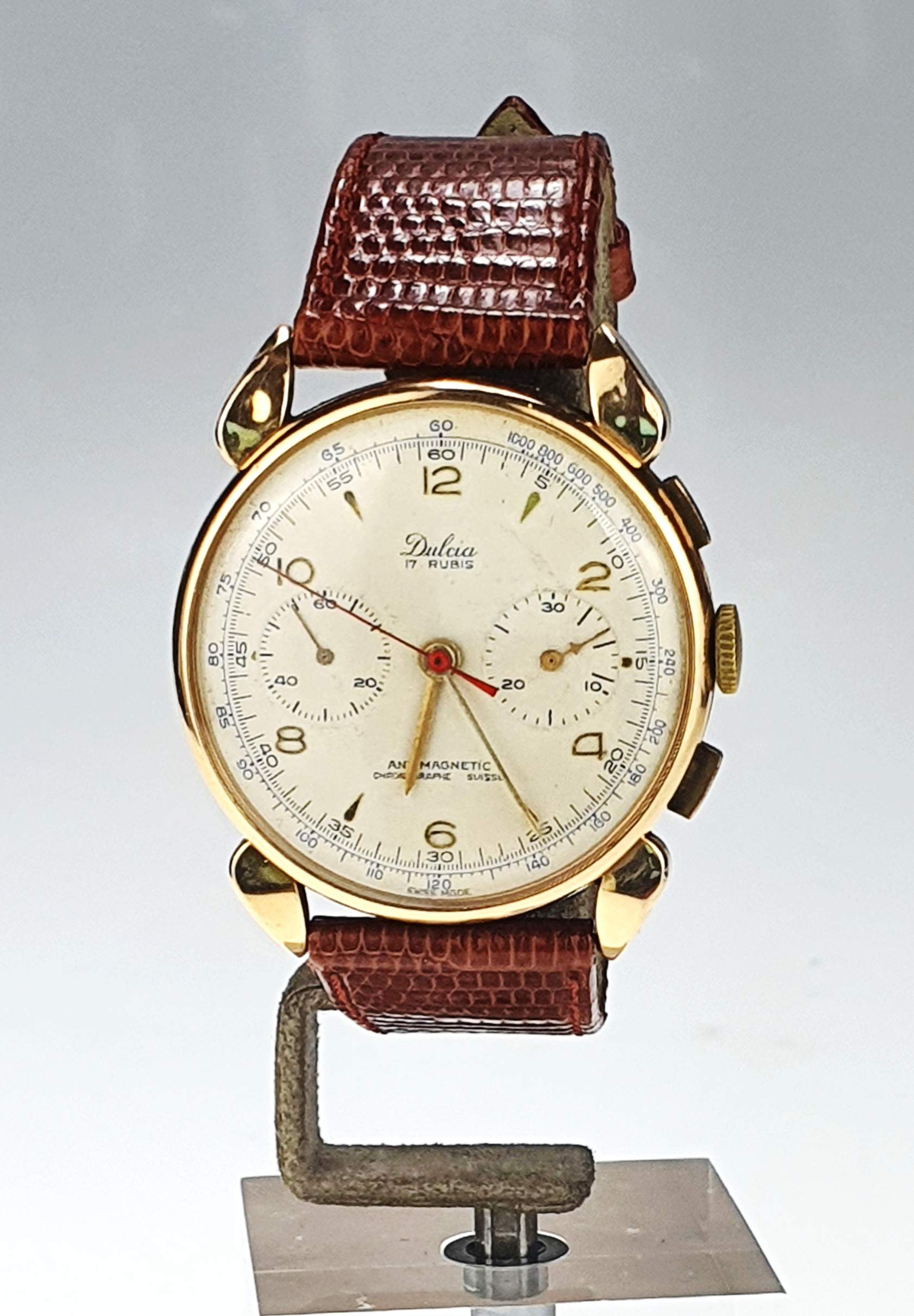 Il Dulcia Suisse vintage è un elegante orologio degli anni ’50, caratterizzato da una cassa in oro giallo di 38 mm e vetro Esalite. Dotato di cronografo con doppio contatore e numeri arabi su un raffinato quadrante perlato, si distingue per il suo stile classico e intramontabile. Con un cinturino in pelle marrone e fibbia in metallo placcato, offre comfort e praticità. Questo modello presenta un movimento antimagnetico con 17 pietre, combinando estetica vintage e precisione tecnica, perfetto per gli amanti degli orologi di lusso d’epoca.
