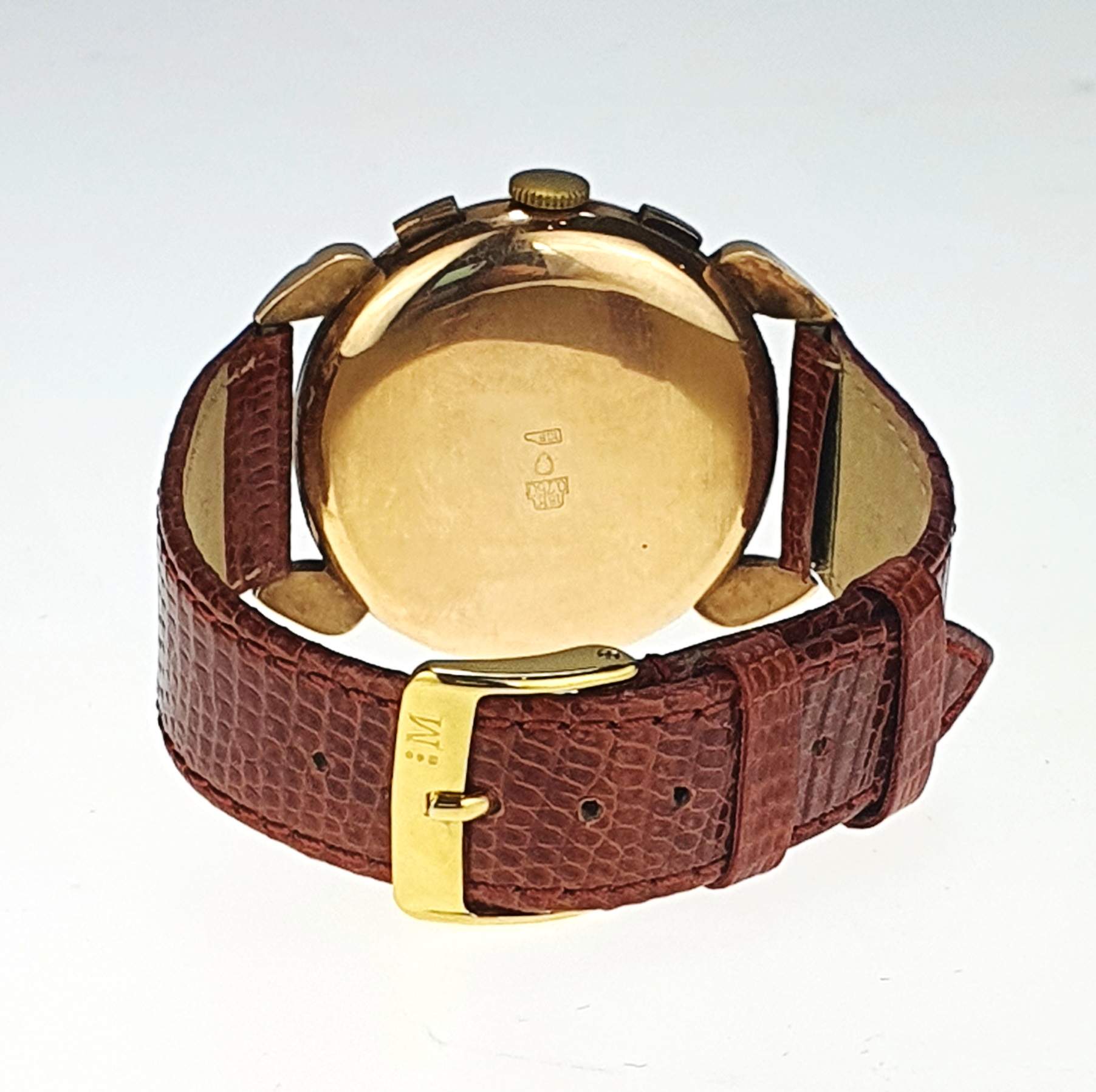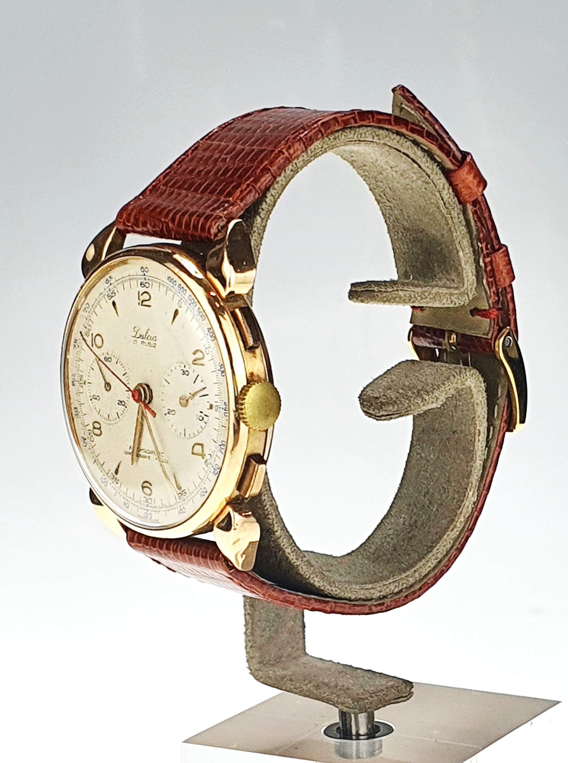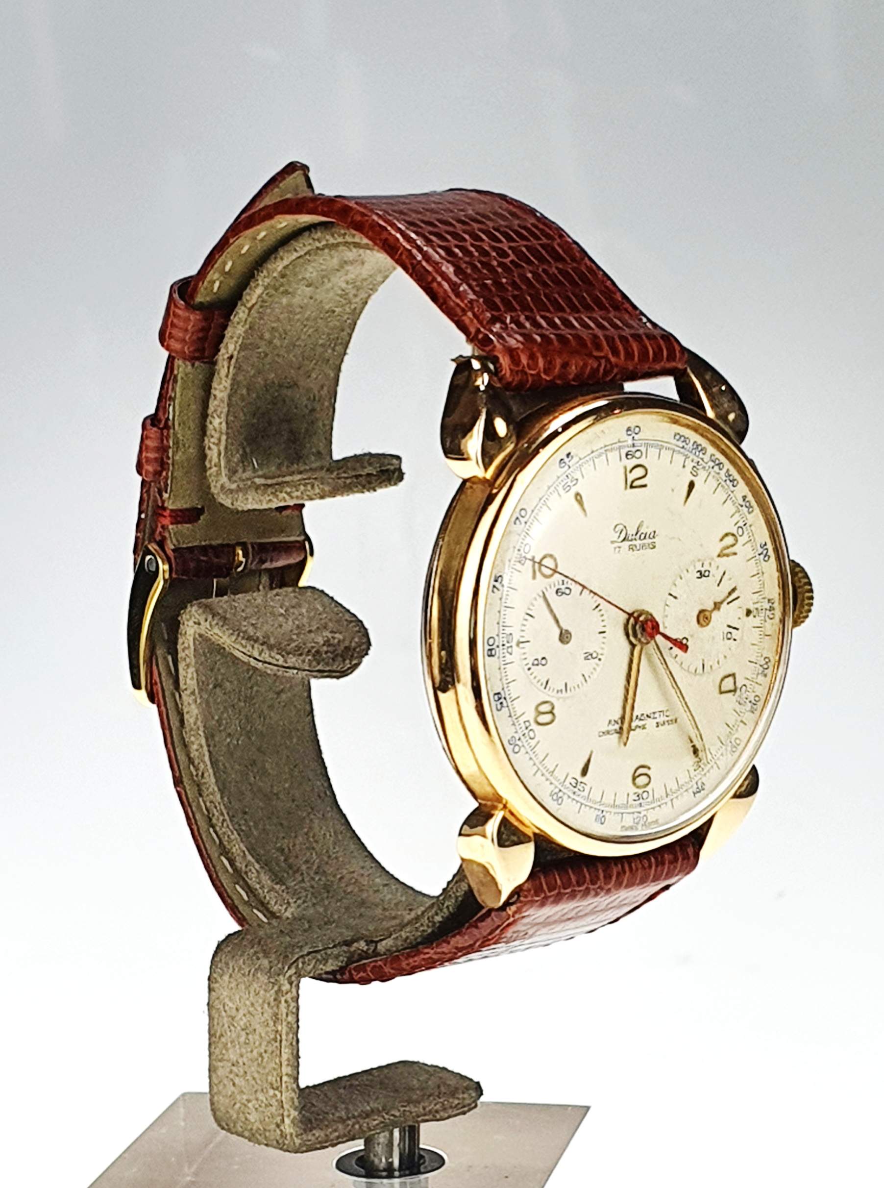 Il Dulcia Suisse vintage è un elegante orologio degli anni ’50, caratterizzato da una cassa in oro giallo di 38 mm e vetro Esalite. Dotato di cronografo con doppio contatore e numeri arabi su un raffinato quadrante perlato, si distingue per il suo stile classico e intramontabile. Con un cinturino in pelle marrone e fibbia in metallo placcato, offre comfort e praticità. Questo modello presenta un movimento antimagnetico con 17 pietre, combinando estetica vintage e precisione tecnica, perfetto per gli amanti degli orologi di lusso d’epoca.