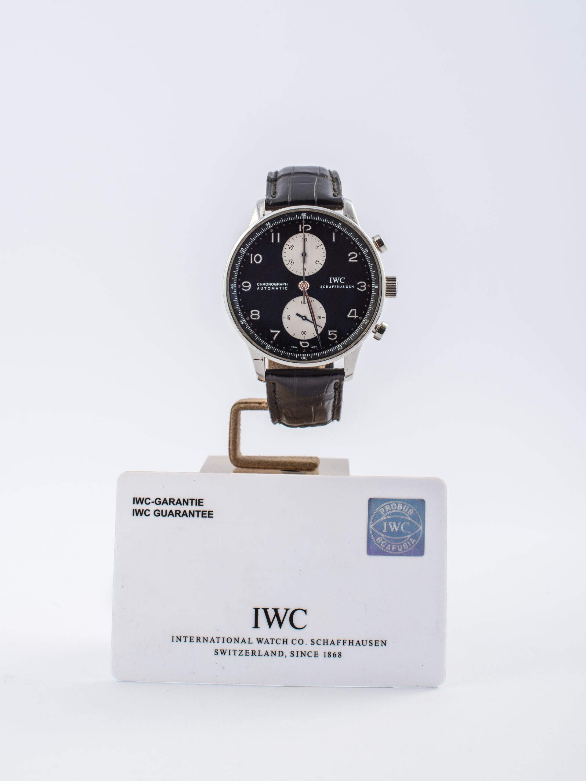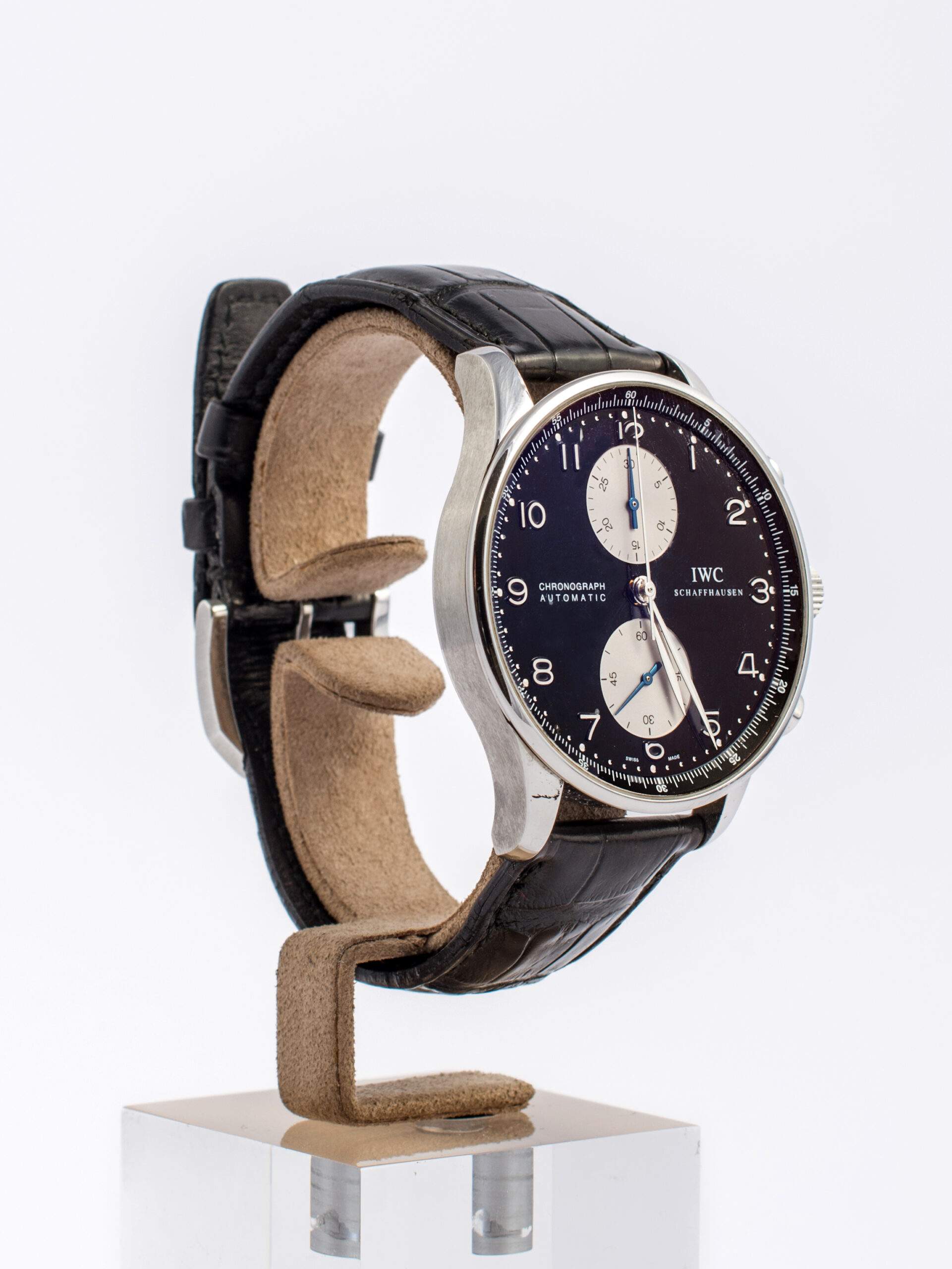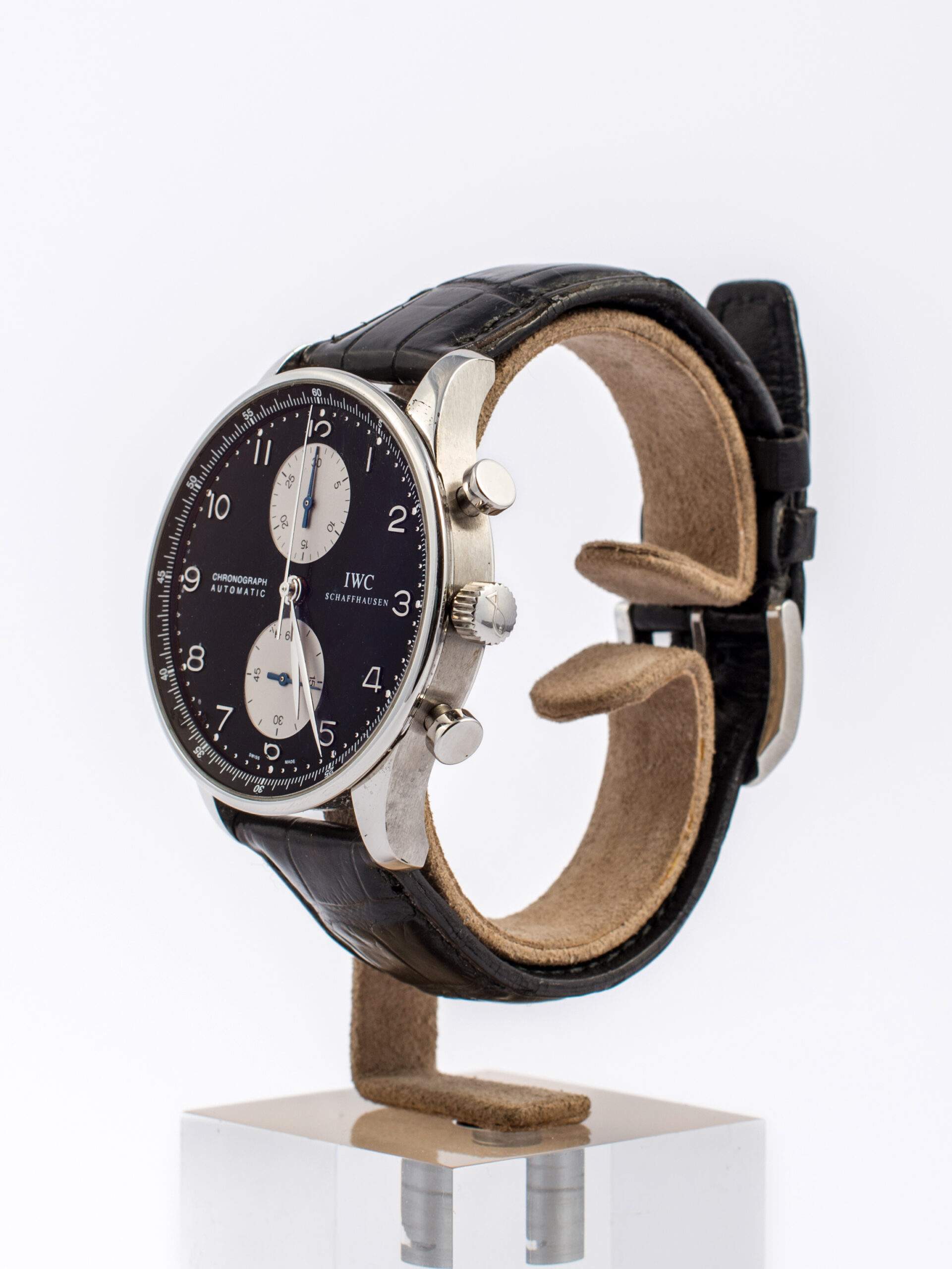 Il IWC Portoghese del 2005 è un cronografo con cassa in acciaio da 41 mm e vetro zaffiro. Il quadrante nero con numeri arabi presenta due contatori cronografici e tasti crono posti sopra e sotto la corona. Equipaggiato con movimento automatico calibro 79350 e una riserva di carica di 44 ore, l’orologio è in ottime condizioni e corredato di garanzia originale.
