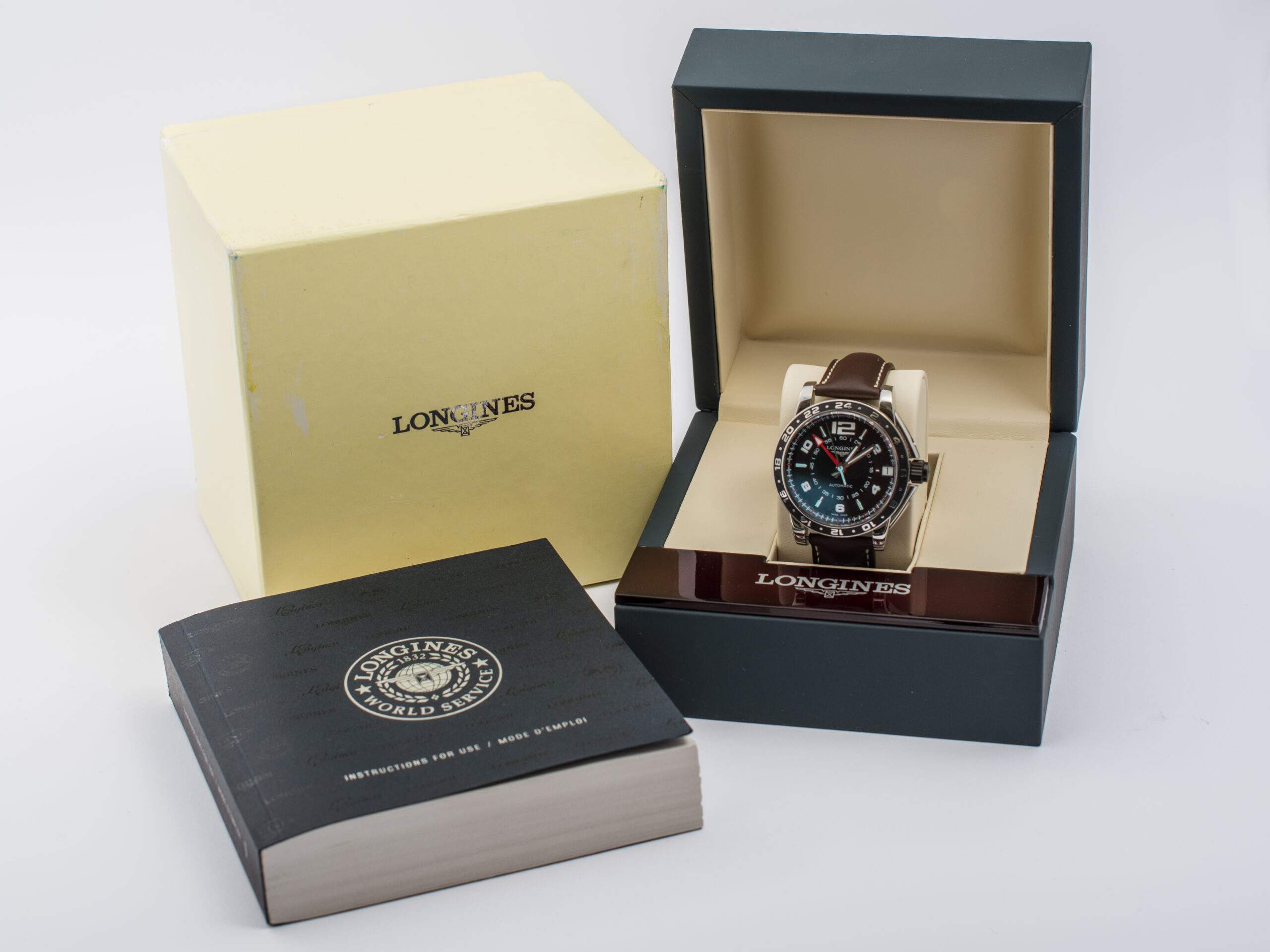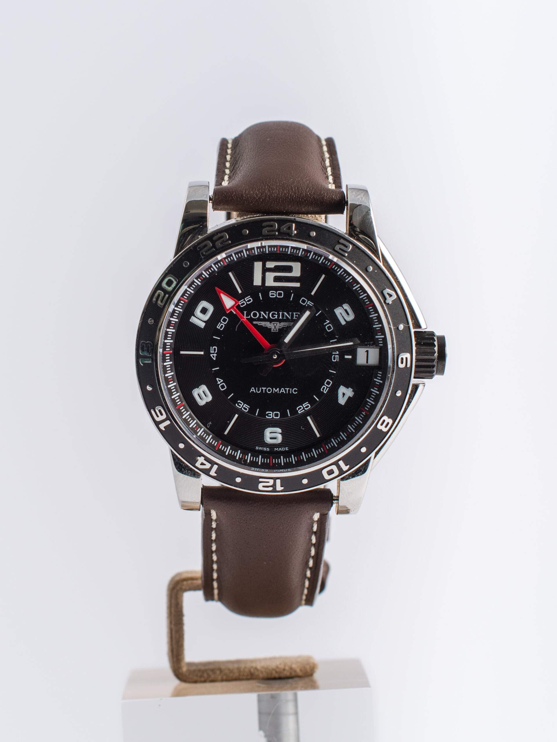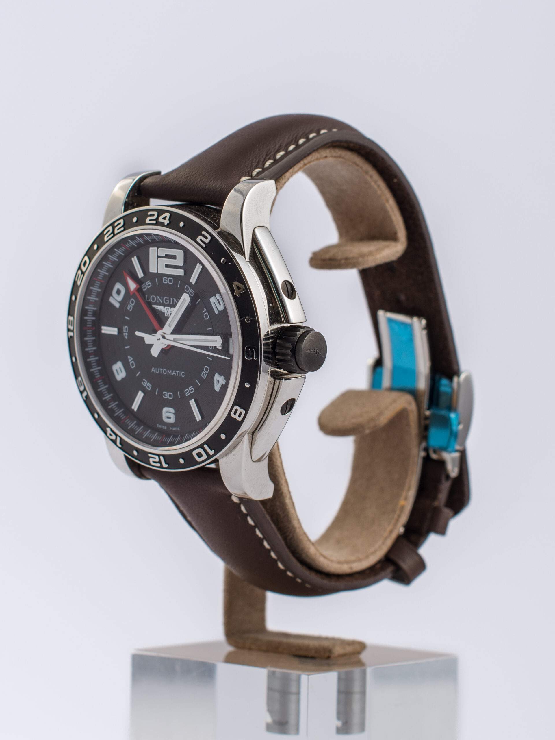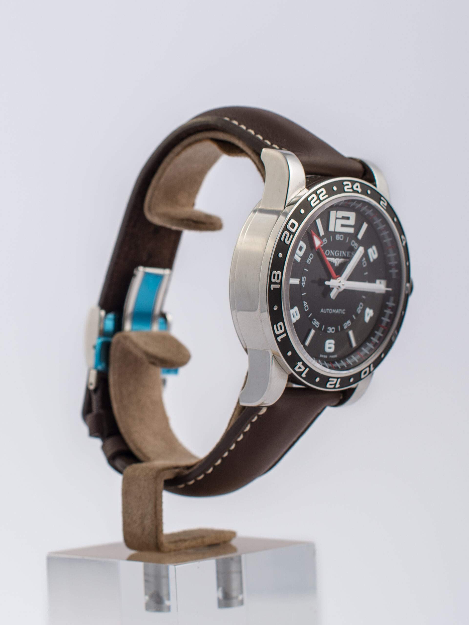 Il Longines Admiral GMT è un orologio con cassa in acciaio da 42 mm, vetro zaffiro e quadrante nero con numeri arabi e indici a bastone. Dotato di funzione GMT e datario alle ore 3, è alimentato da un movimento automatico. Il cinturino in pelle marrone originale ha una chiusura deployante in acciaio. L’orologio, in condizioni pari al nuovo, è completo di scatola e garanzia originali.