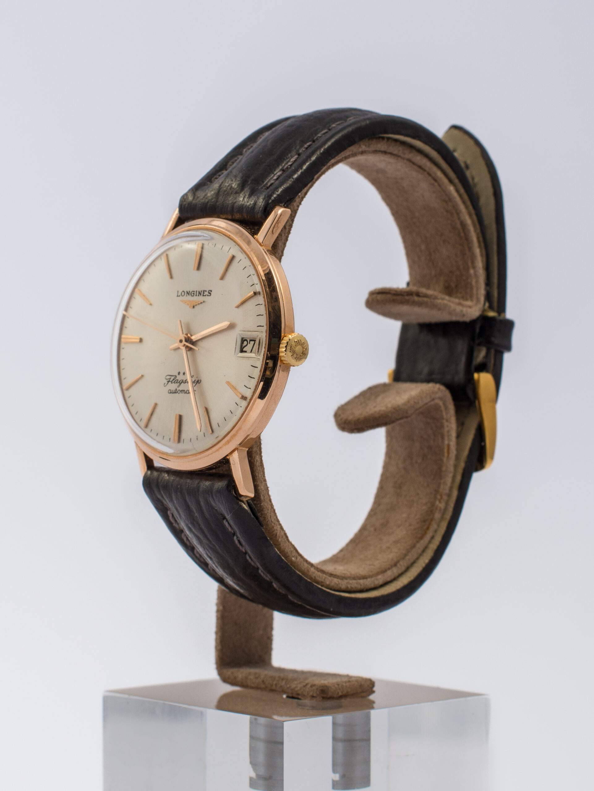 Il Longines Flagship del 1965 ha una cassa in oro giallo da 34 mm con quadrante perlato e indici in oro applicato. Presenta un vetro Esalite e un cinturino in pelle nera con chiusura ad ardiglione. È dotato di un movimento automatico calibro 343 e viene fornito con la scatola originale e un estratto dagli archivi Longines. In ottime condizioni, rappresenta un modello vintage di grande fascino.