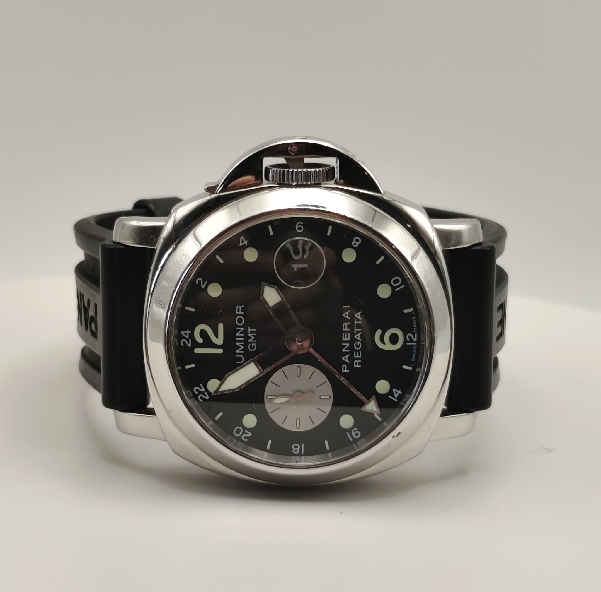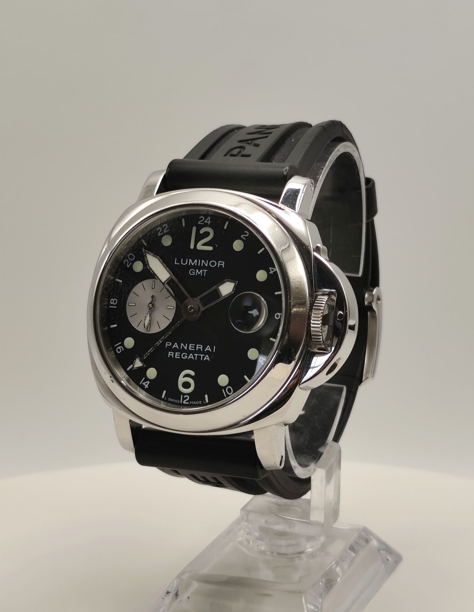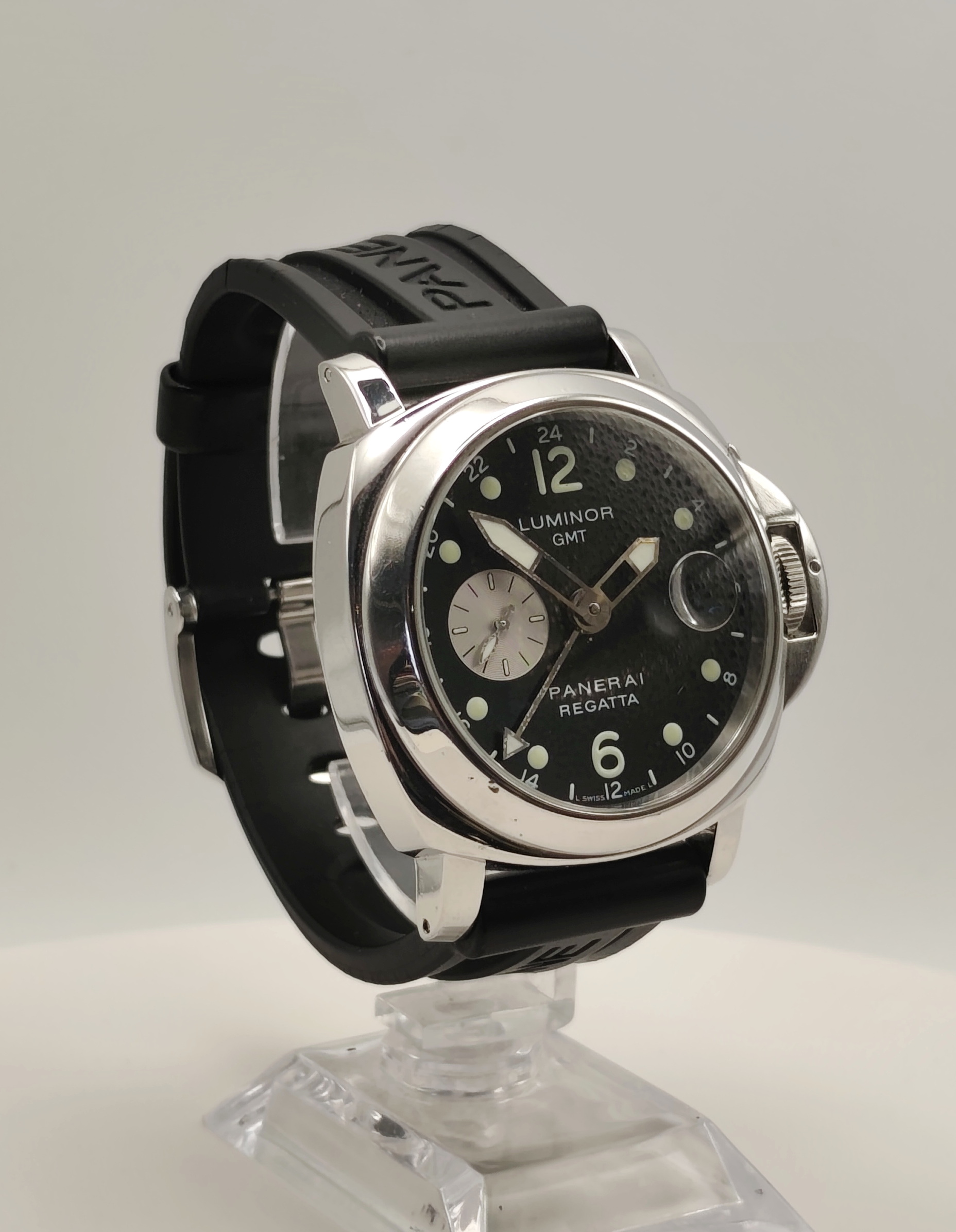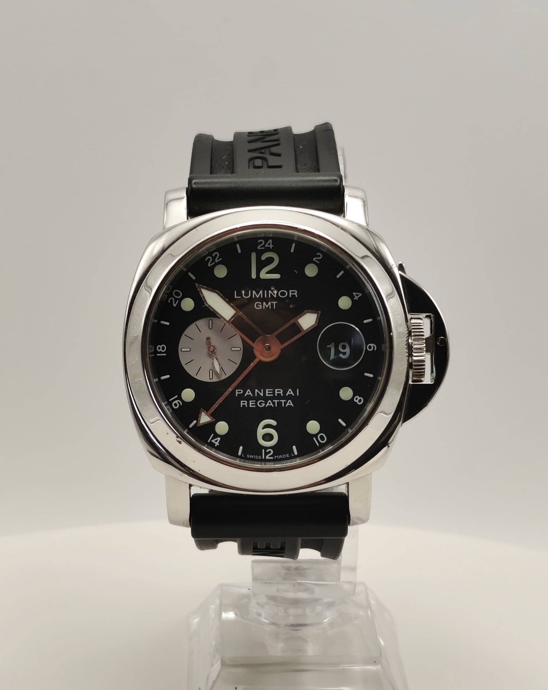 Proponiamo in vendita questo affascinante Panerai Luminor GMT Regatta, referenza OP 6587, un modello raro e ricercato prodotto nel 2002 in edizione limitata di soli 300 esemplari. L’orologio si presenta in buono stato di conservazione (cinturino in caucciù da sostituire a nostre spese) ed è corredato di full set, elemento sempre più difficile da trovare su pezzi di questa serie. La cassa da 44 mm in acciaio mantiene tutto il carattere iconico Panerai, con la tipica robustezza e presenza al polso. Il quadrante nero è altamente leggibile, con numeri arabi e indici a bicchierino, impreziosito da:
