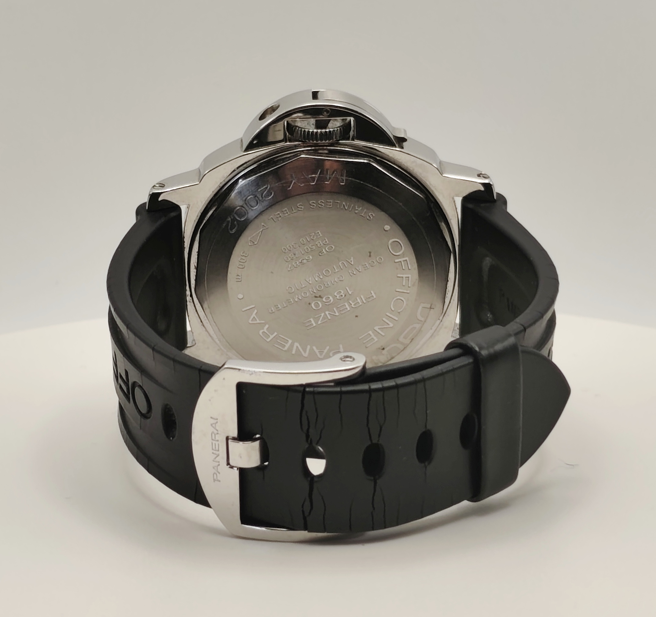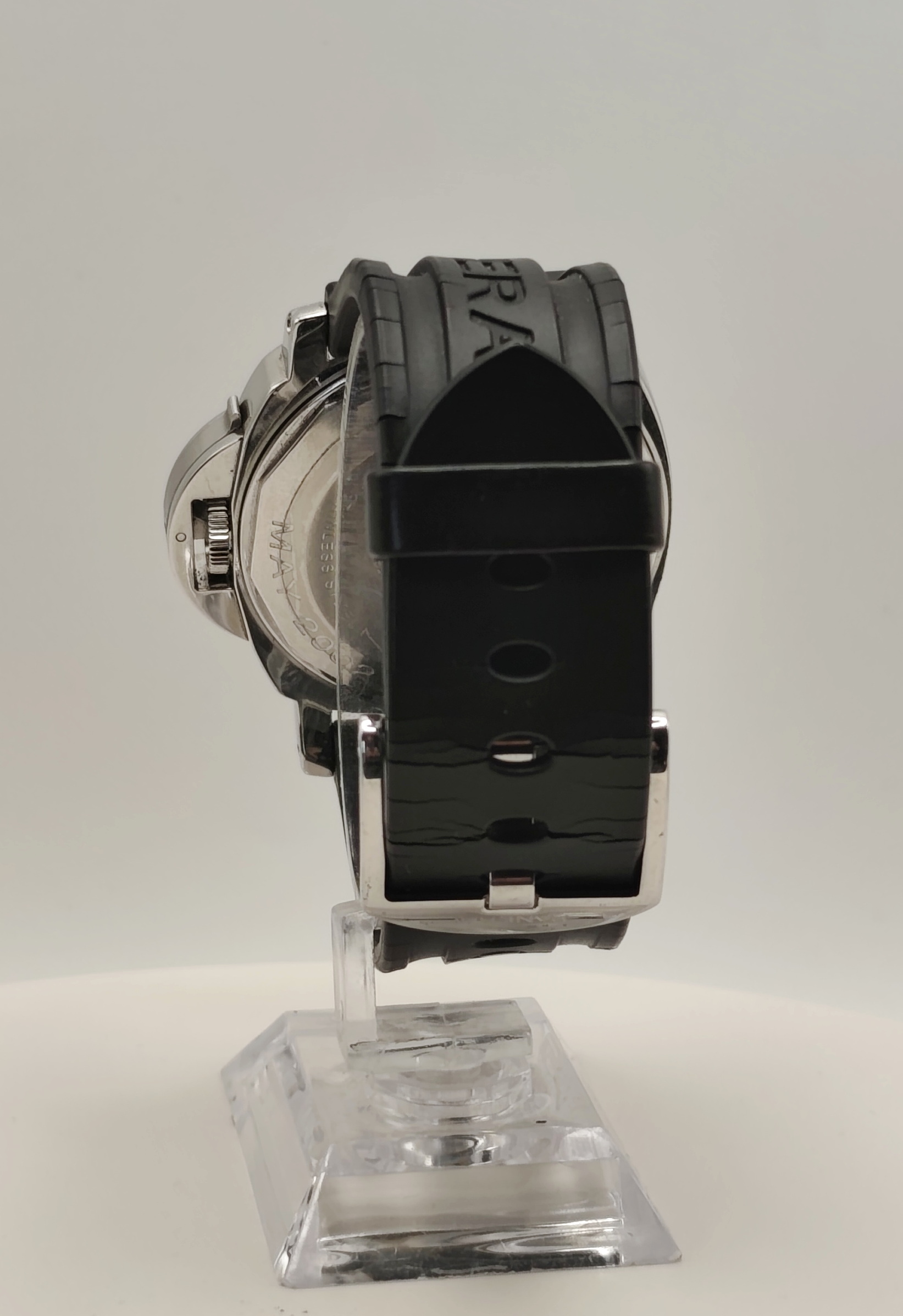 Il movimento è un automatico calibro OP VIII, affidabile e collaudato. Il vetro è in zaffiro, mentre il cinturino è in caucciù nero (verrà sostituito a nostre spese, così da consegnare l’orologio in condizioni ottimali anche sotto questo aspetto). Un segnatempo che unisce sportività e collezionismo, perfetto sia per uso quotidiano che per arricchire una collezione Panerai con un modello non comune.