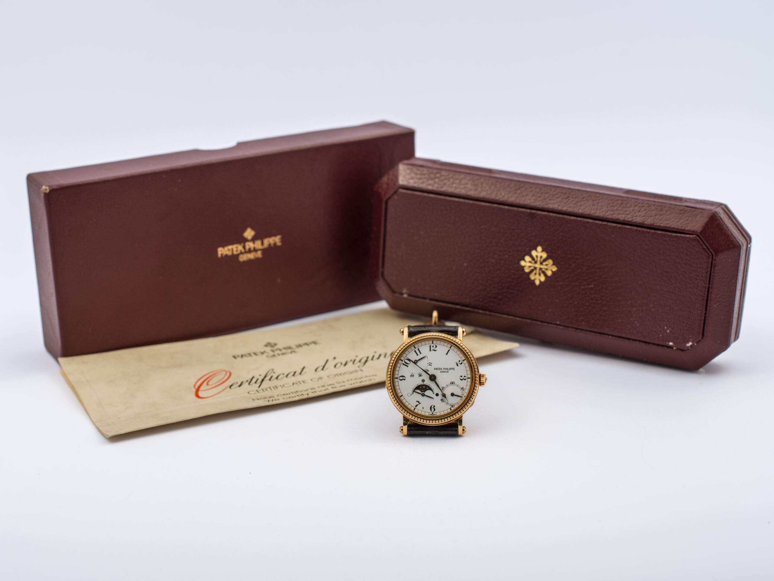 Il Patek Philippe Calatrava Moon Watch del 1994 ha una cassa in oro giallo 18 kt, da 35 mm e vetro zaffiro, con fondello a vista. Presenta complicazioni come le fasi lunari, piccoli secondi e riserva di carica. È alimentato da un movimento automatico calibro 240PS IRM C LU. Completo di scatola e garanzia originali, si trova in ottimo stato di conservazione.