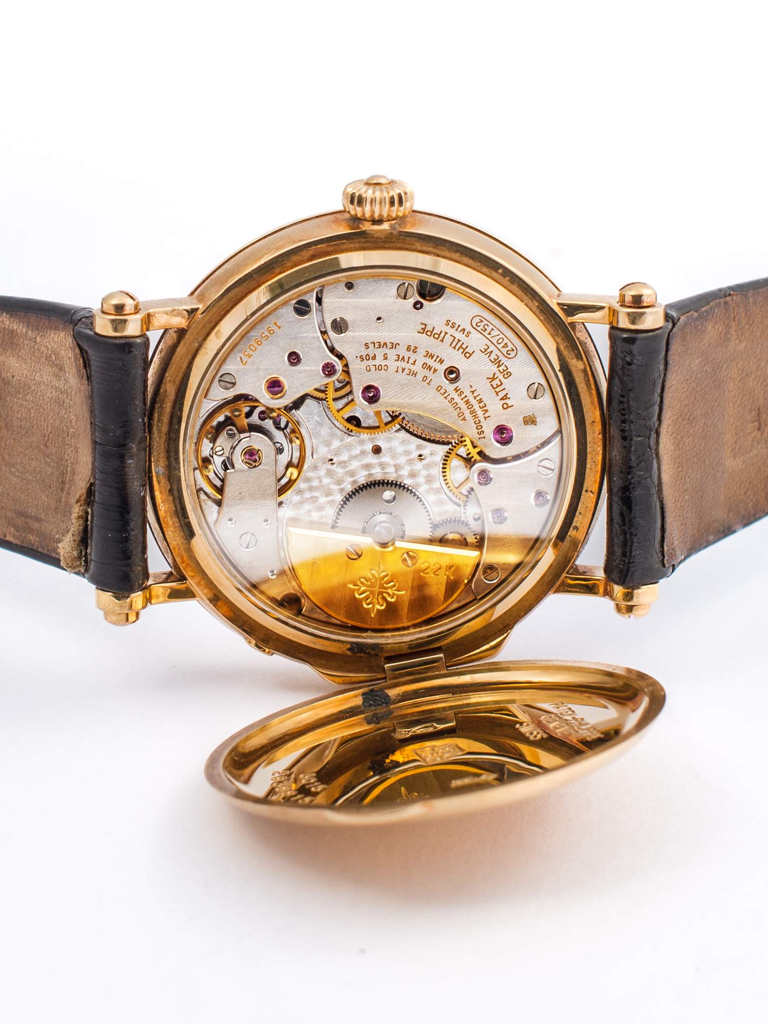 Fondello a vista nascoto dal copri fondello, fasi luna, riserva di carica e piccoli secondi