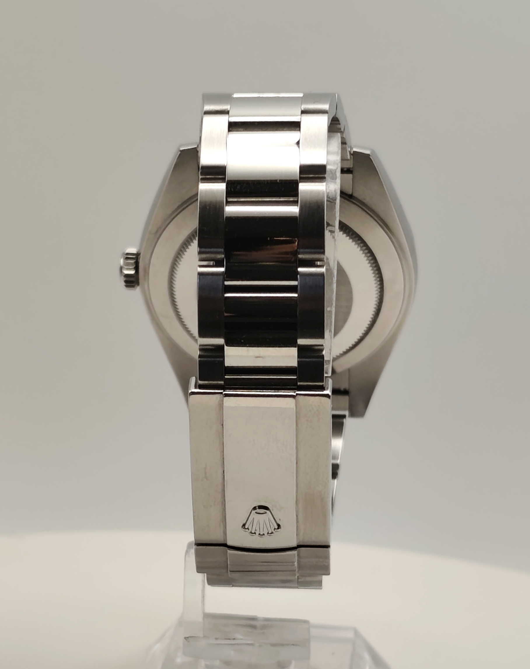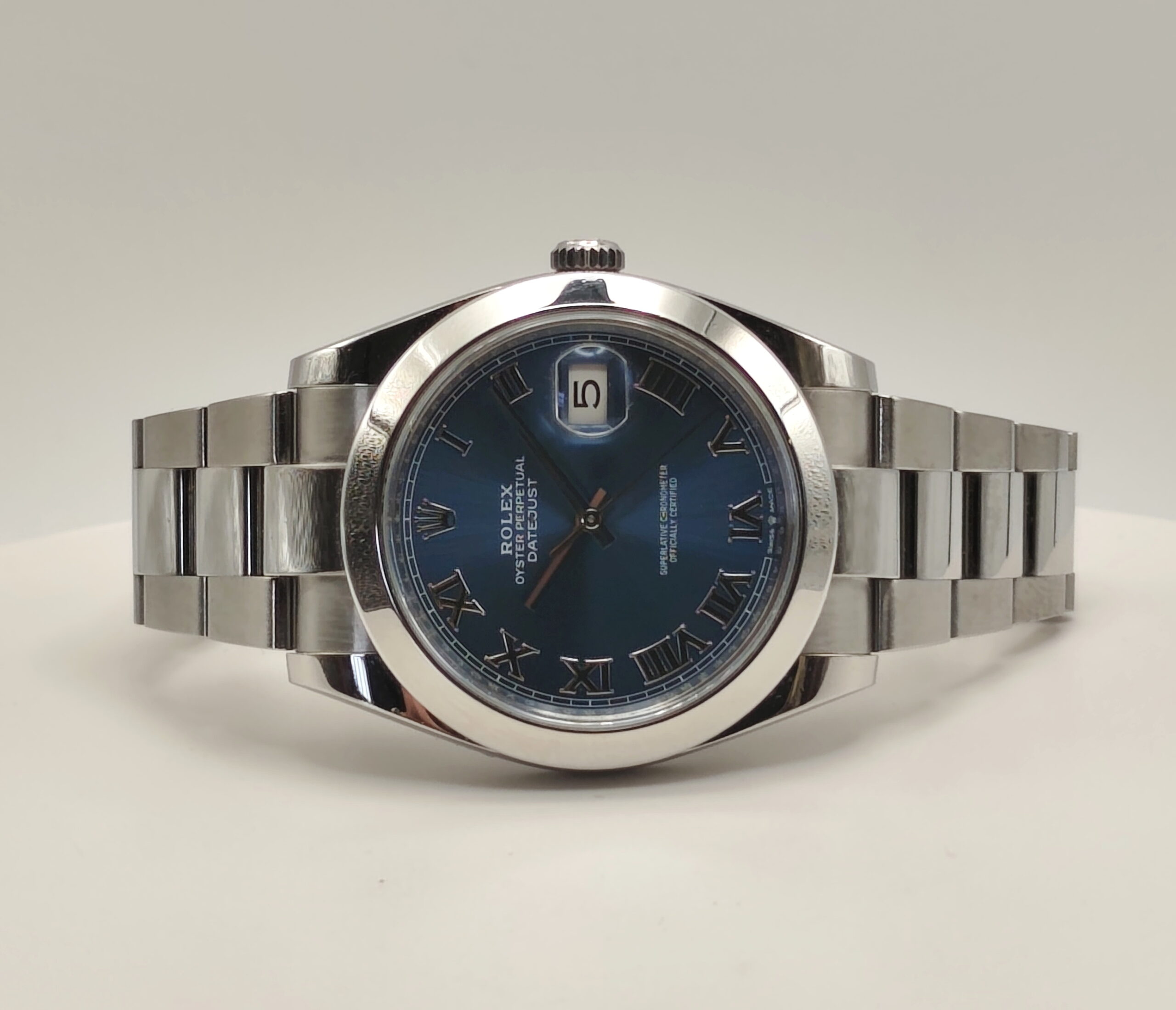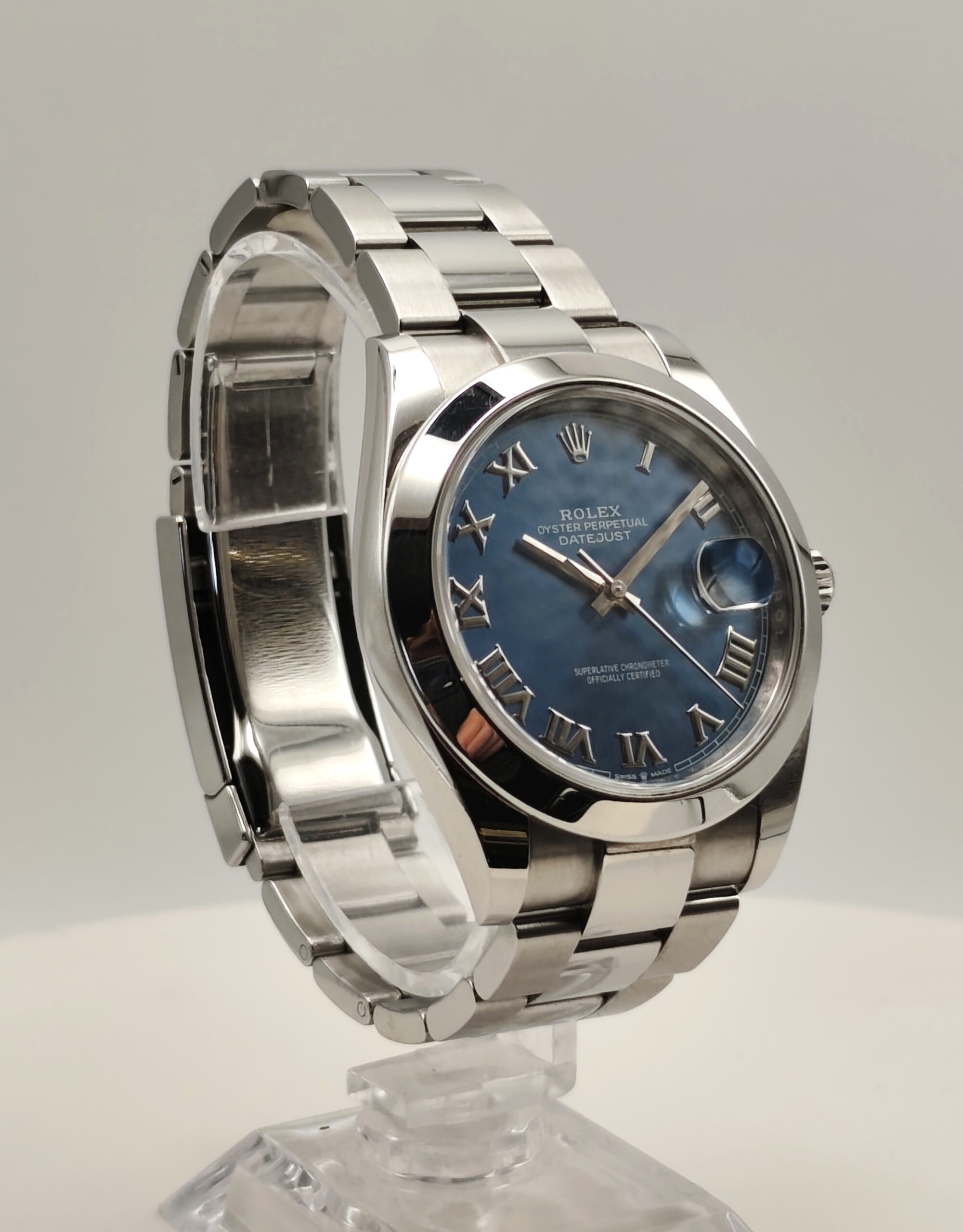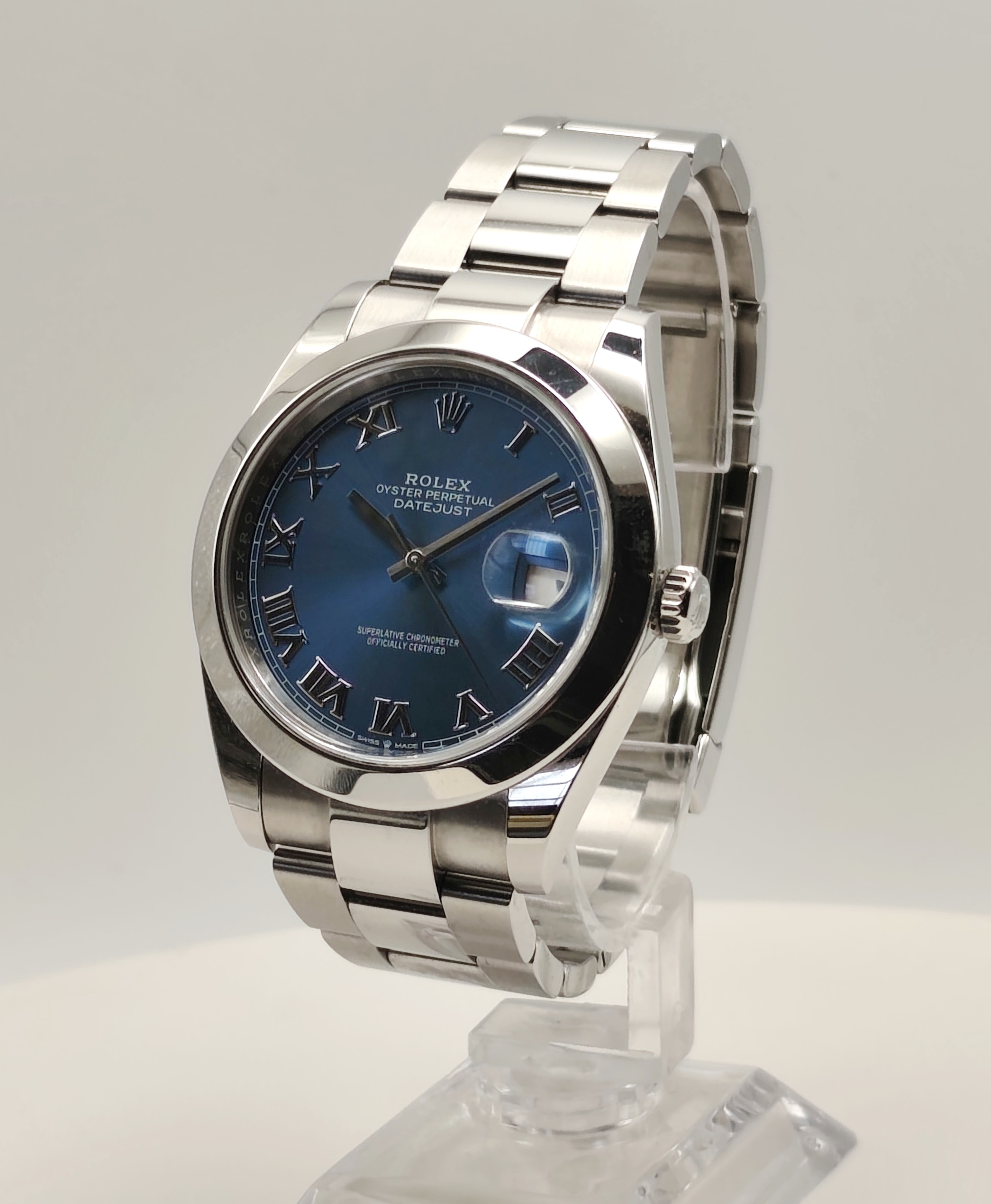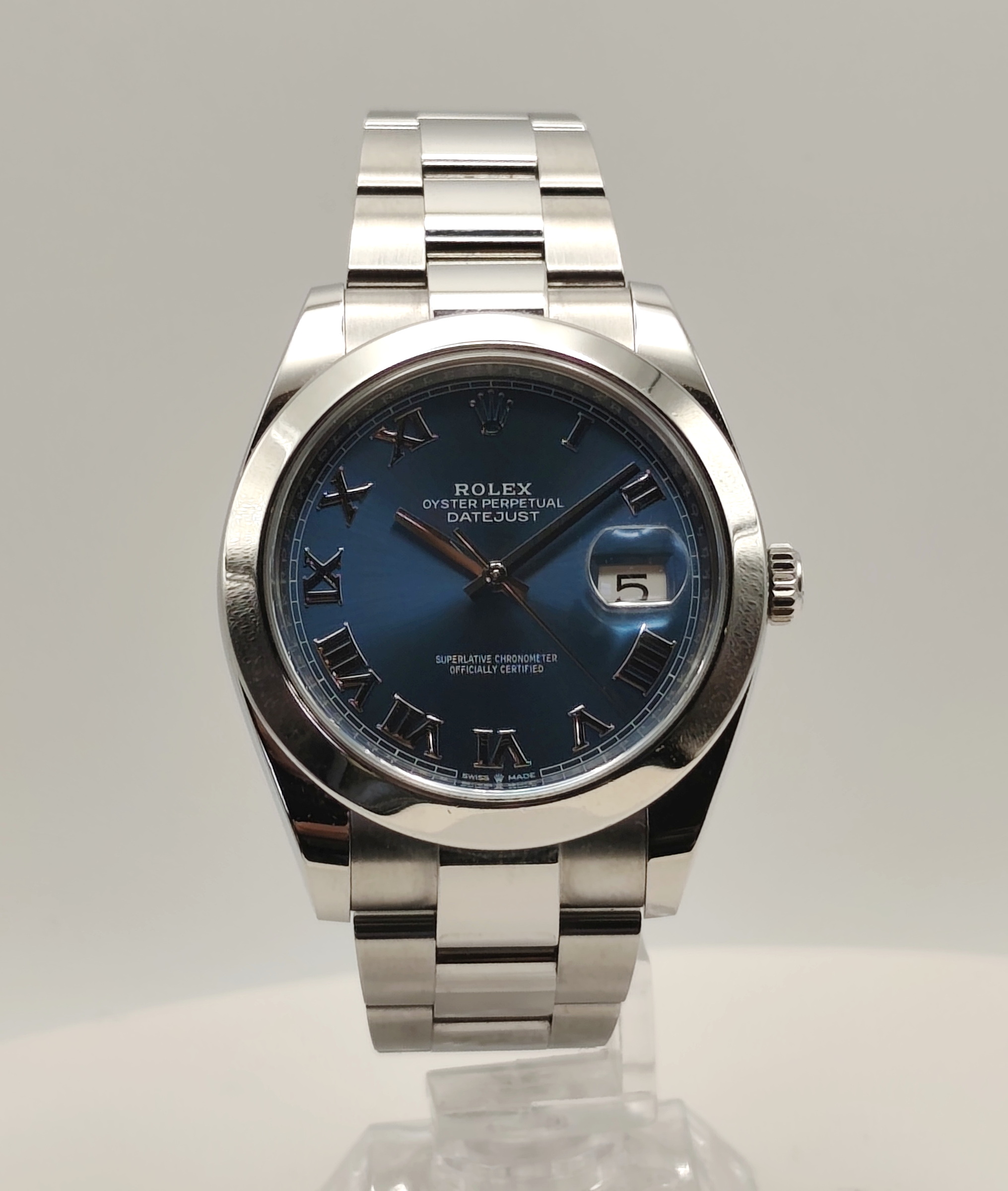 Proponiamo questo elegante Rolex Datejust 41, referenza 126300, acquistato nel 2021 e mantenuto in ottimo stato di conservazione. L’orologio è completo di full set, un plus importante sia per utilizzo personale che in ottica collezionistica. La cassa da 41 mm in acciaio rappresenta l’equilibrio perfetto tra eleganza e presenza al polso. La lunetta liscia in acciaio esalta il design pulito e contemporaneo del modello. Il quadrante blu con numeri romani dona grande raffinatezza e distingue questo Datejust da configurazioni più comuni, mantenendo al contempo eccellente leggibilità. Presente il datario ad ore 3 con lente Cyclope, firma iconica Rolex. Il movimento è il calibro Rolex 3235 automatico, di ultima generazione, noto per precisione, affidabilità e ottime prestazioni. Il bracciale interamente in acciaio con chiusura deployante garantisce comfort e solidità, rendendolo perfetto per un utilizzo quotidiano. Un classico intramontabile della casa Rolex, ideale per chi cerca un orologio versatile, elegante e sempre attuale.