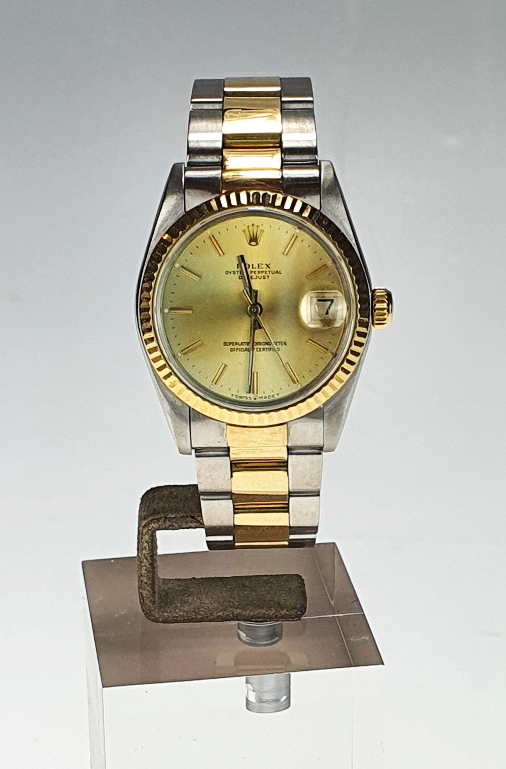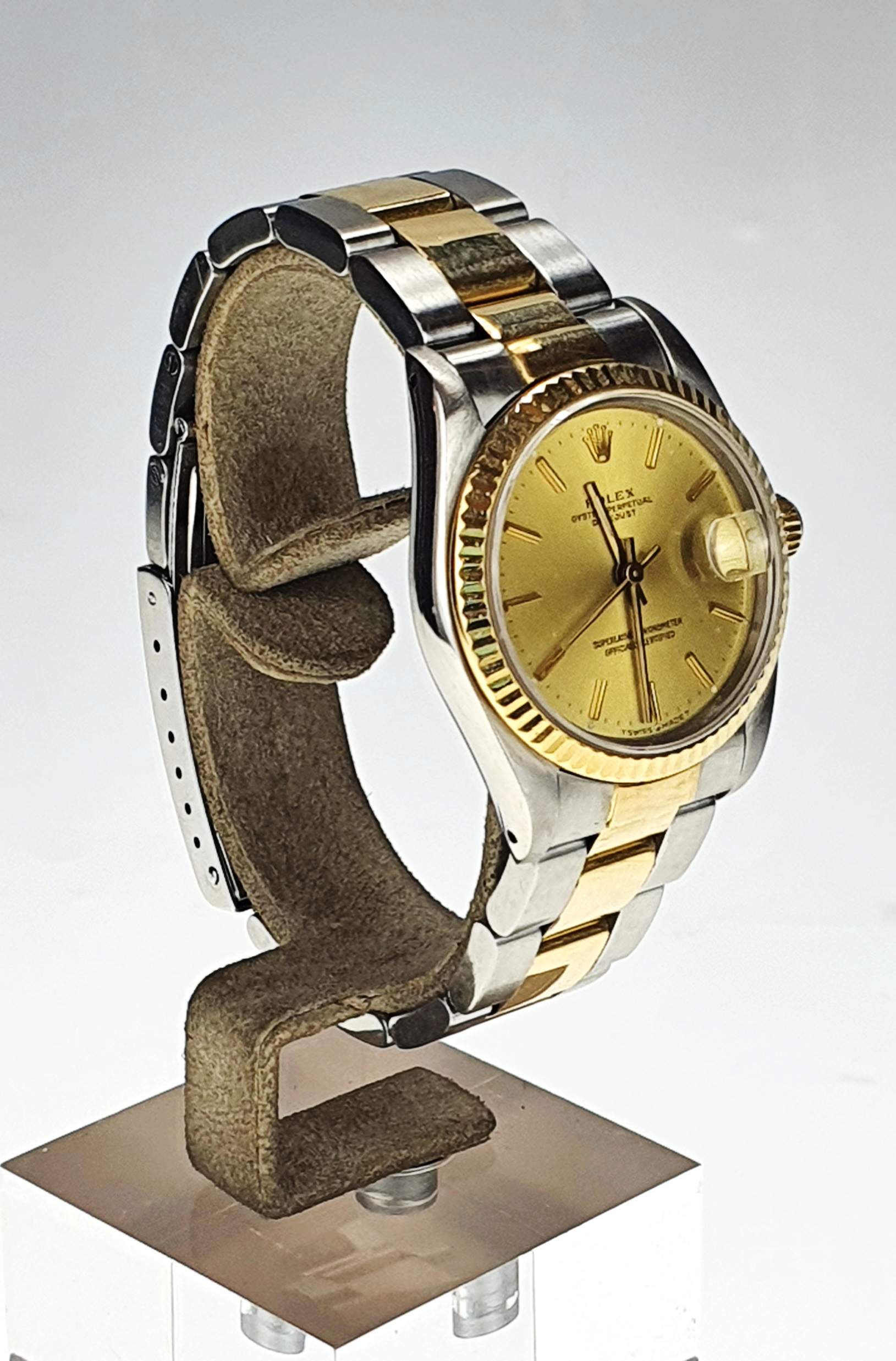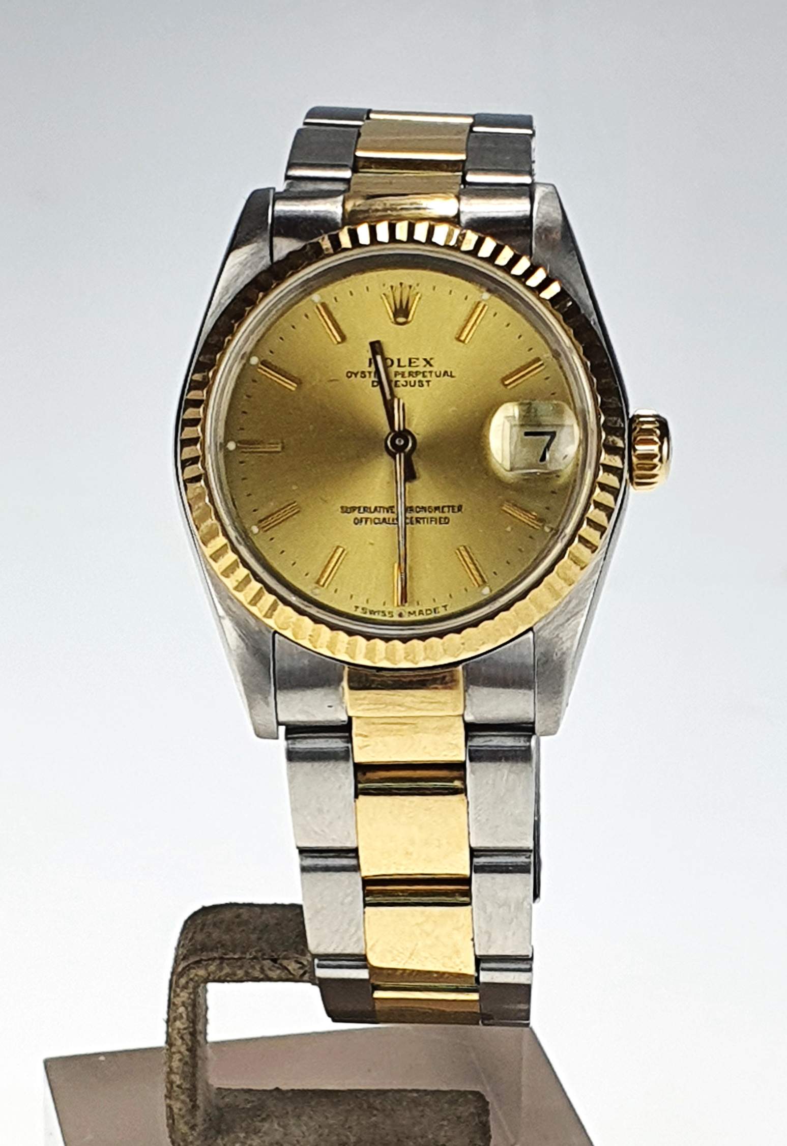 Il Rolex Date Just del 1991 è un orologio elegante con cassa in acciaio e oro, diametro di 31 mm, impermeabile fino a 100 metri. È dotato di movimento automatico Calibro 2135 con riserva di carica di 42 ore e quadrante dorato con indici a bastone, datario ad ore 3. Il vetro è in esalite, la lunetta in oro giallo zigrinato, e il cinturino in acciaio con chiusura deployante. L’orologio è in ottime condizioni, accompagnato da una garanzia di 12 mesi.