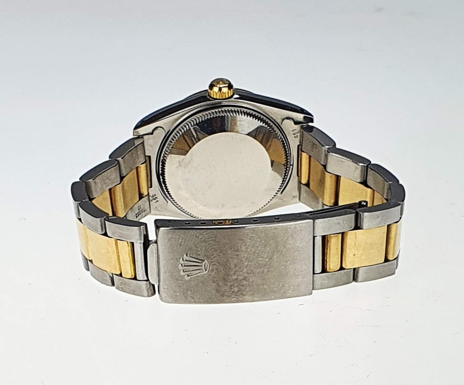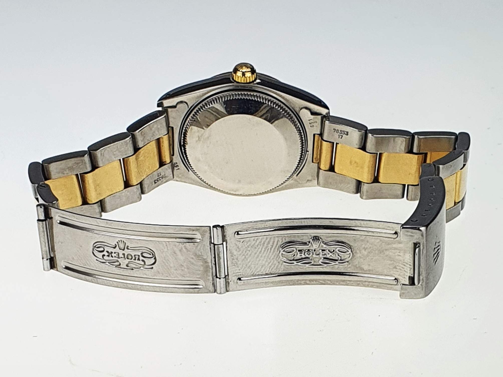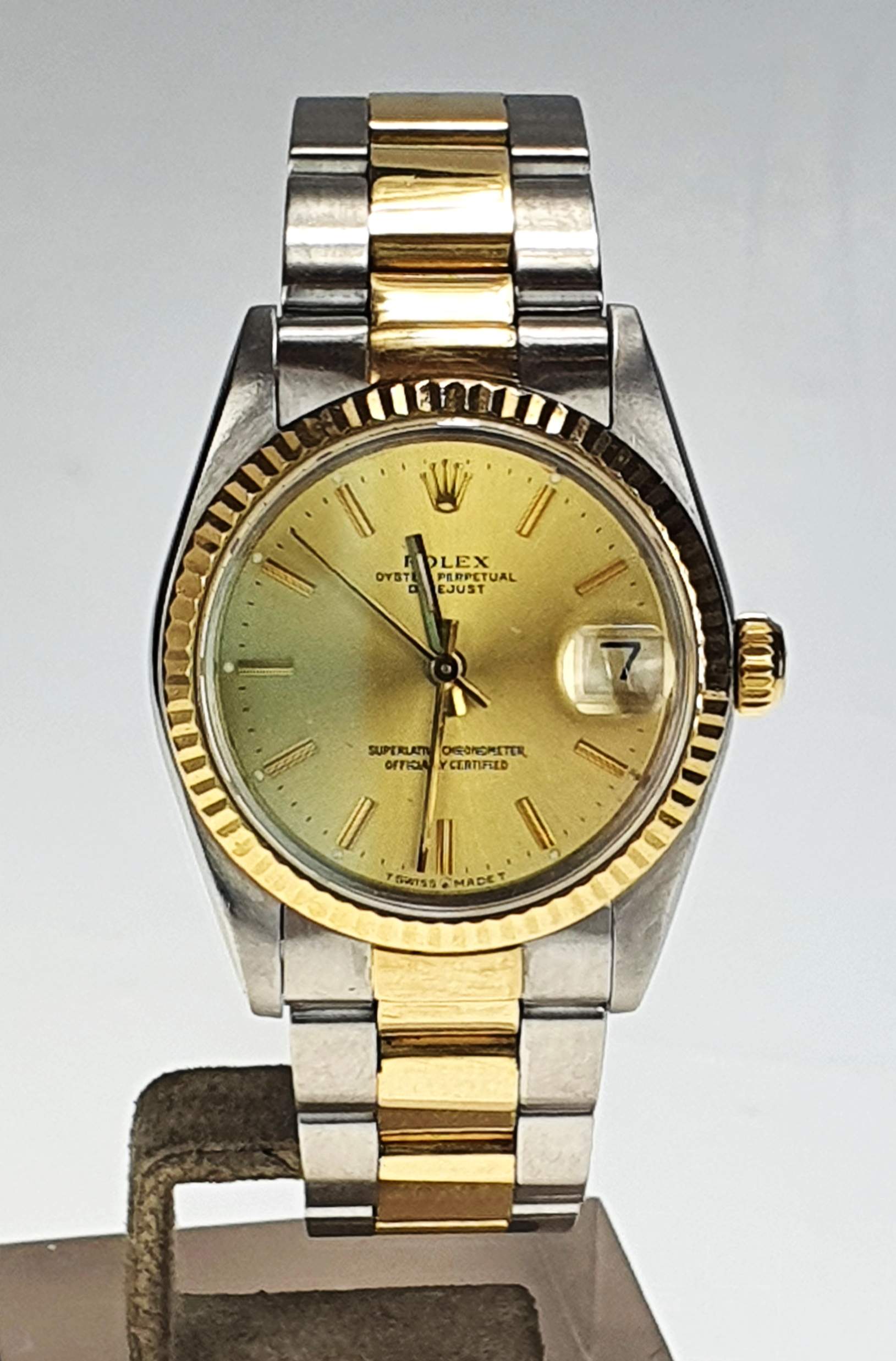 Il Rolex Date Just del 1991 è un orologio elegante con cassa in acciaio e oro, diametro di 31 mm, impermeabile fino a 100 metri. È dotato di movimento automatico Calibro 2135 con riserva di carica di 42 ore e quadrante dorato con indici a bastone, datario ad ore 3. Il vetro è in esalite, la lunetta in oro giallo zigrinato, e il cinturino in acciaio con chiusura deployante. L’orologio è in ottime condizioni, accompagnato da una garanzia di 12 mesi.