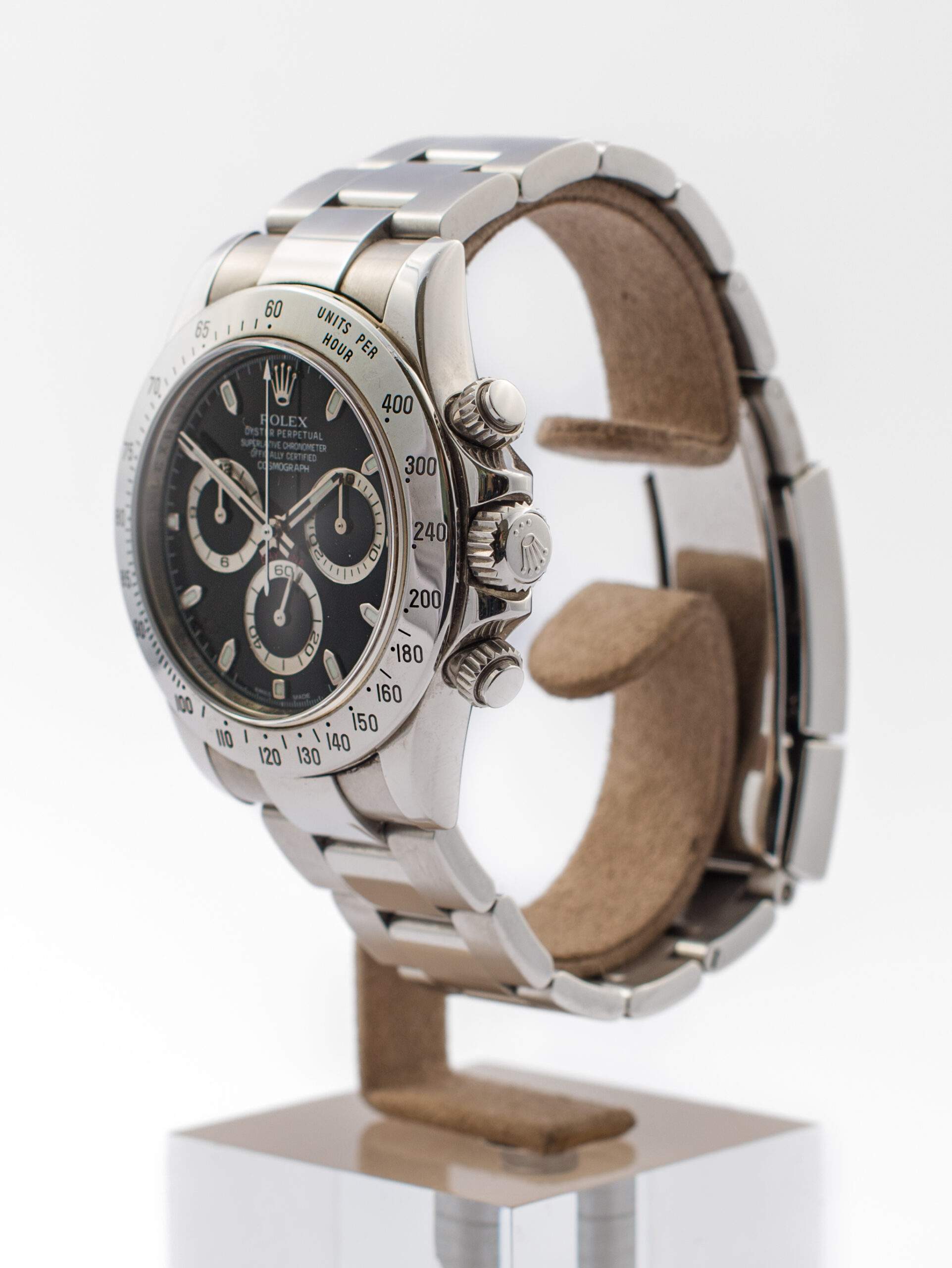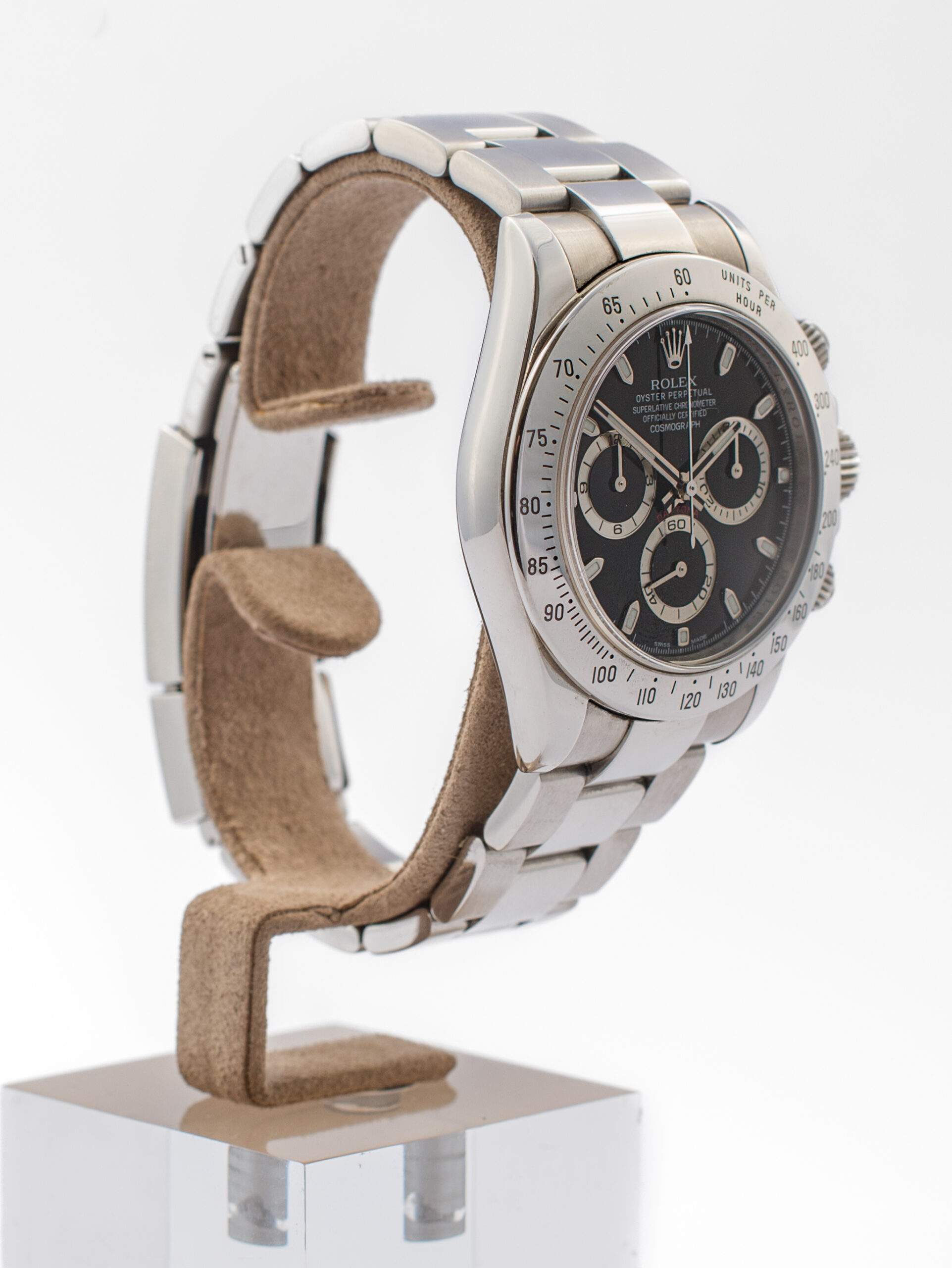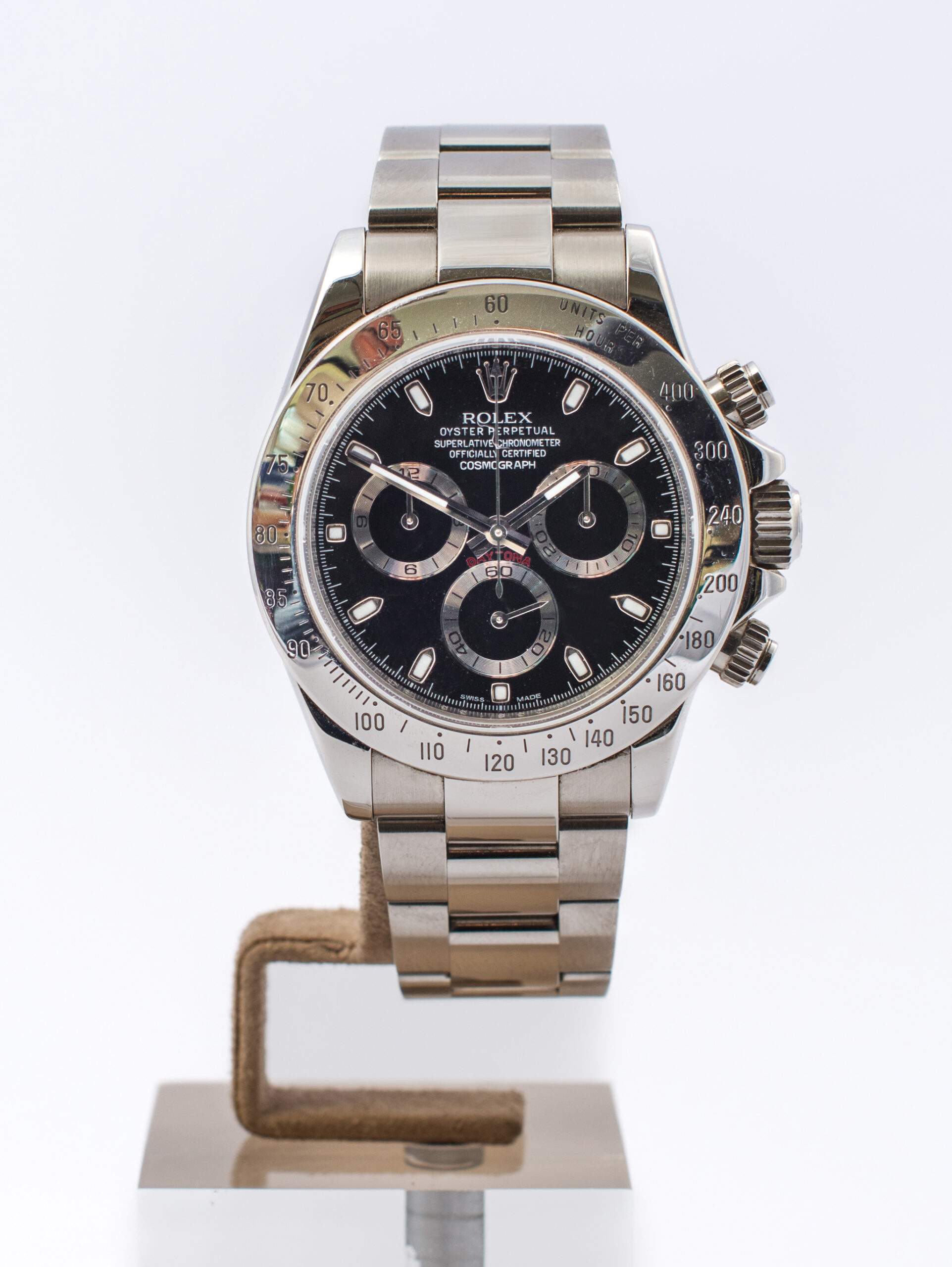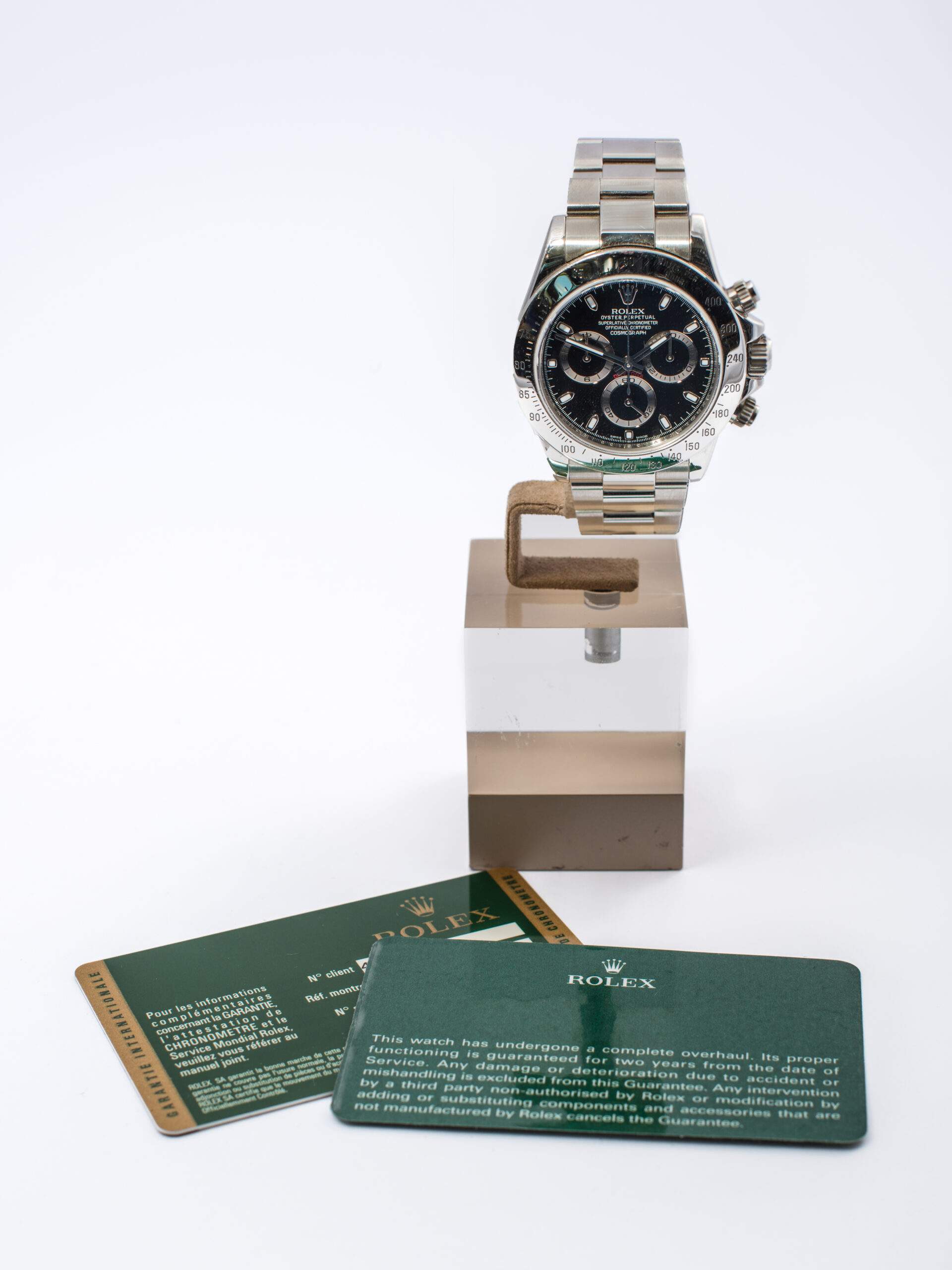 Il Rolex Daytona Cosmograph del 2009 è in ottimo stato e non è mai stato lucidato. Questo cronografo presenta un quadrante nero e una lunetta in acciaio, con una cassa di 40 mm e impermeabilità fino a 100 metri. Il meccanismo automatico è il Rolex 4130, con una riserva di carica di 72 ore. Viene offerto completo di garanzia originale e servizio Rolex.
