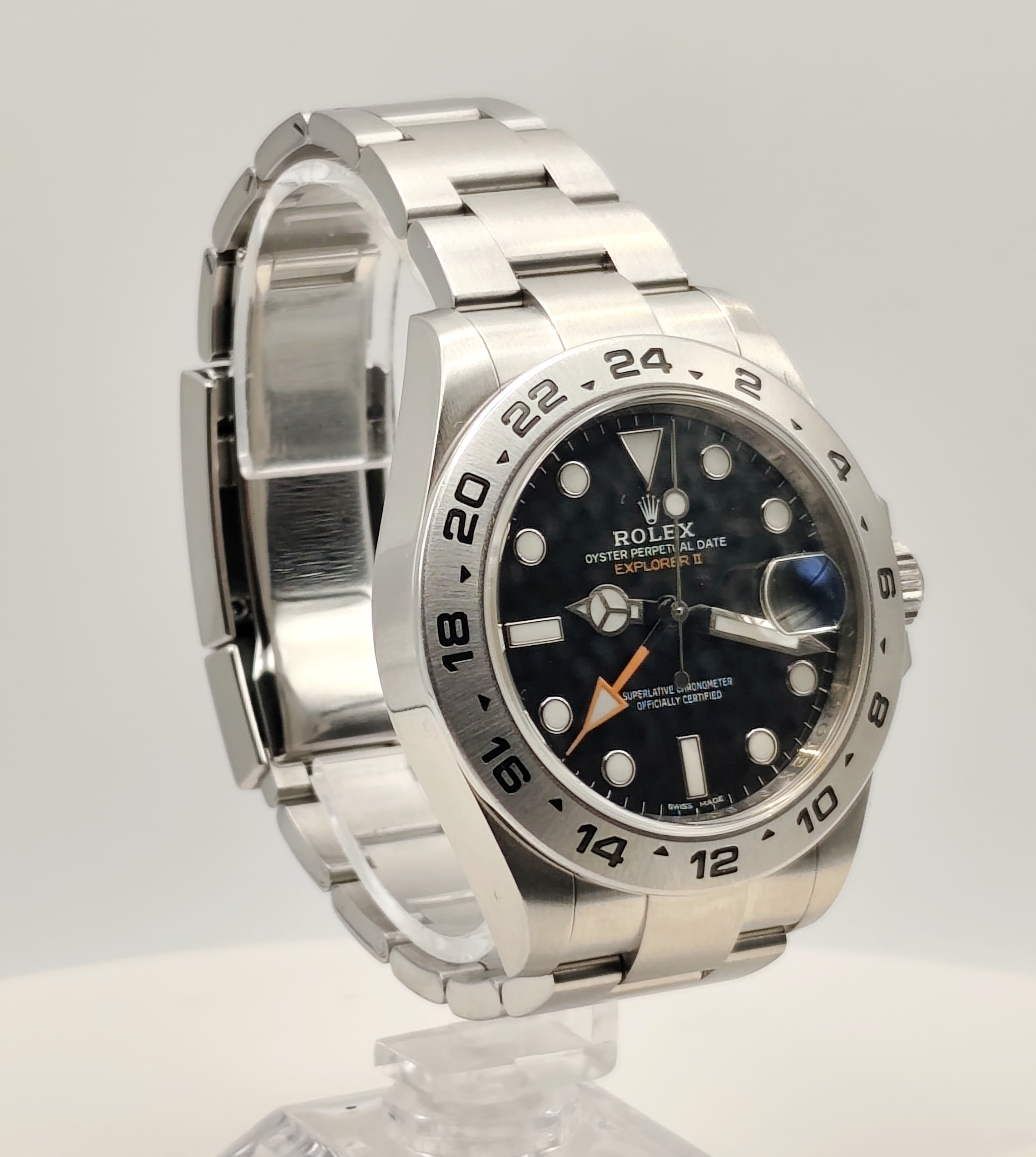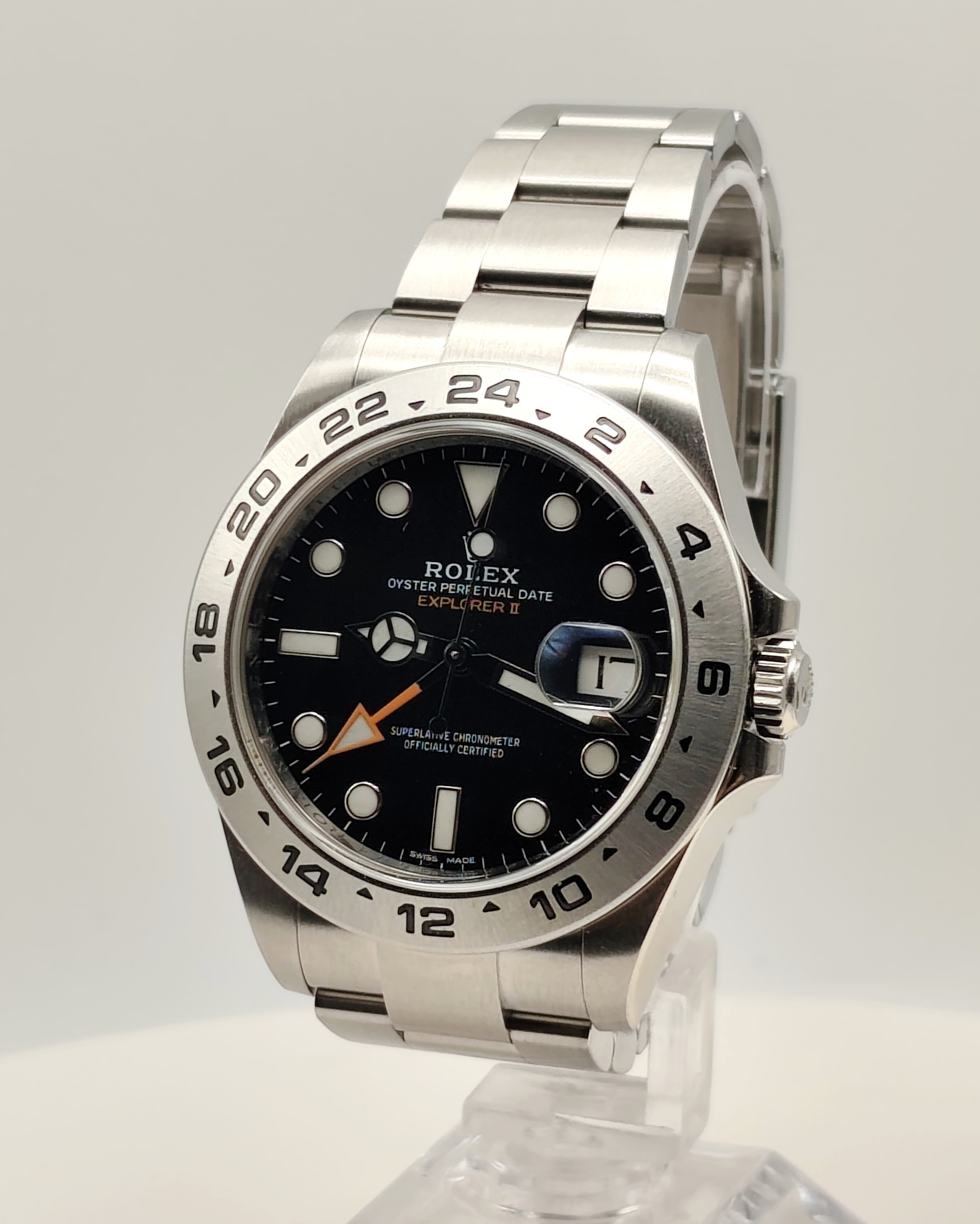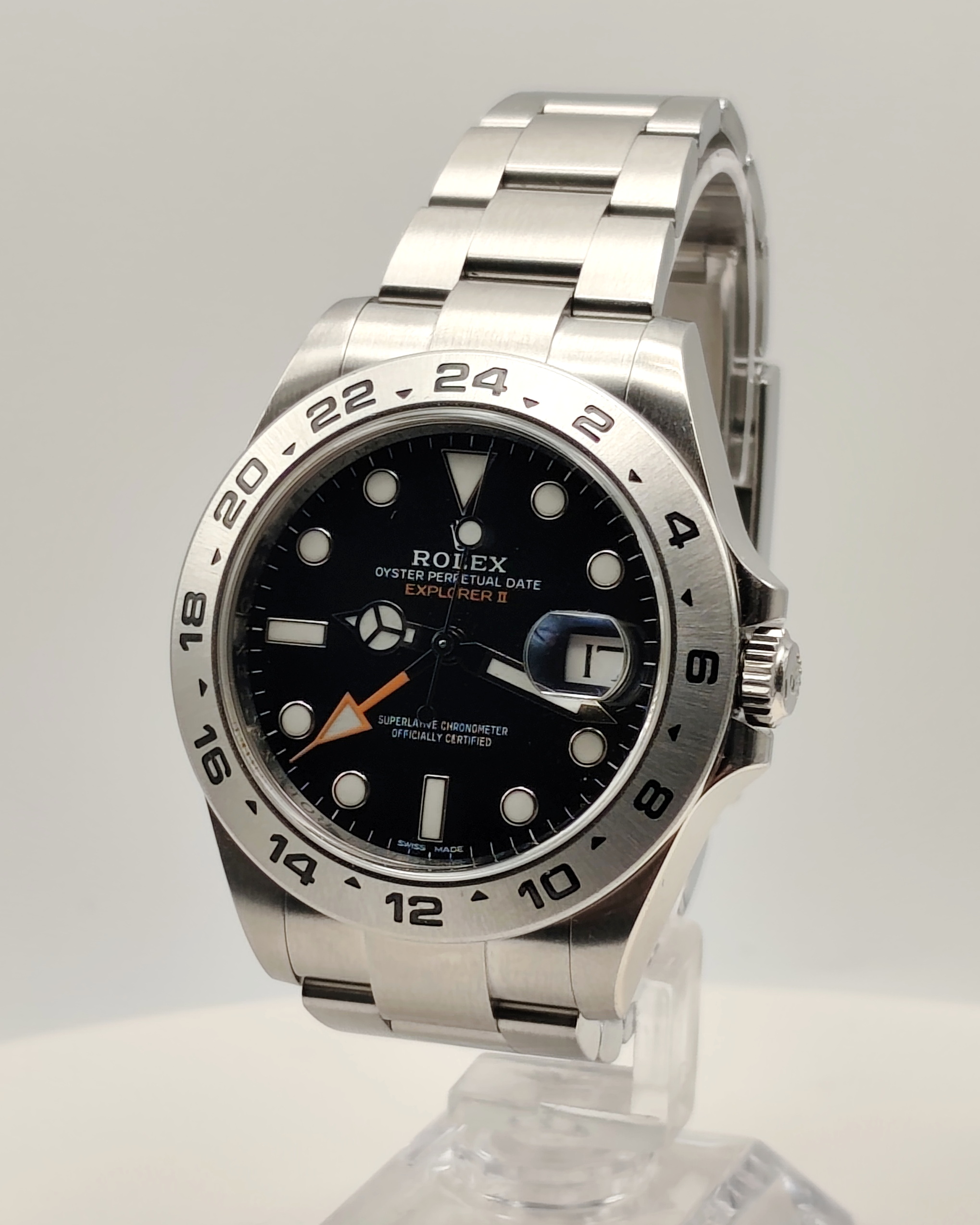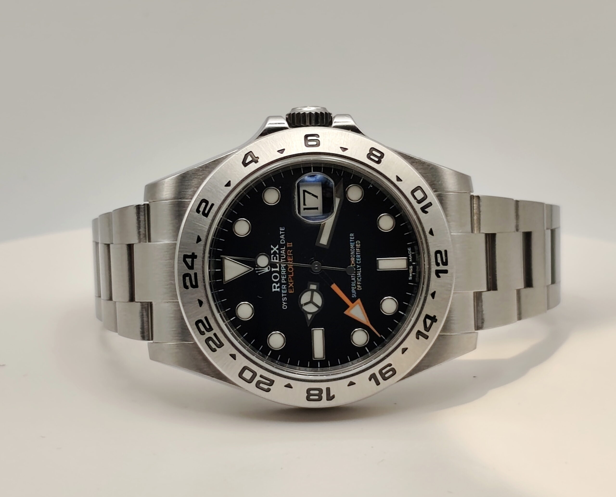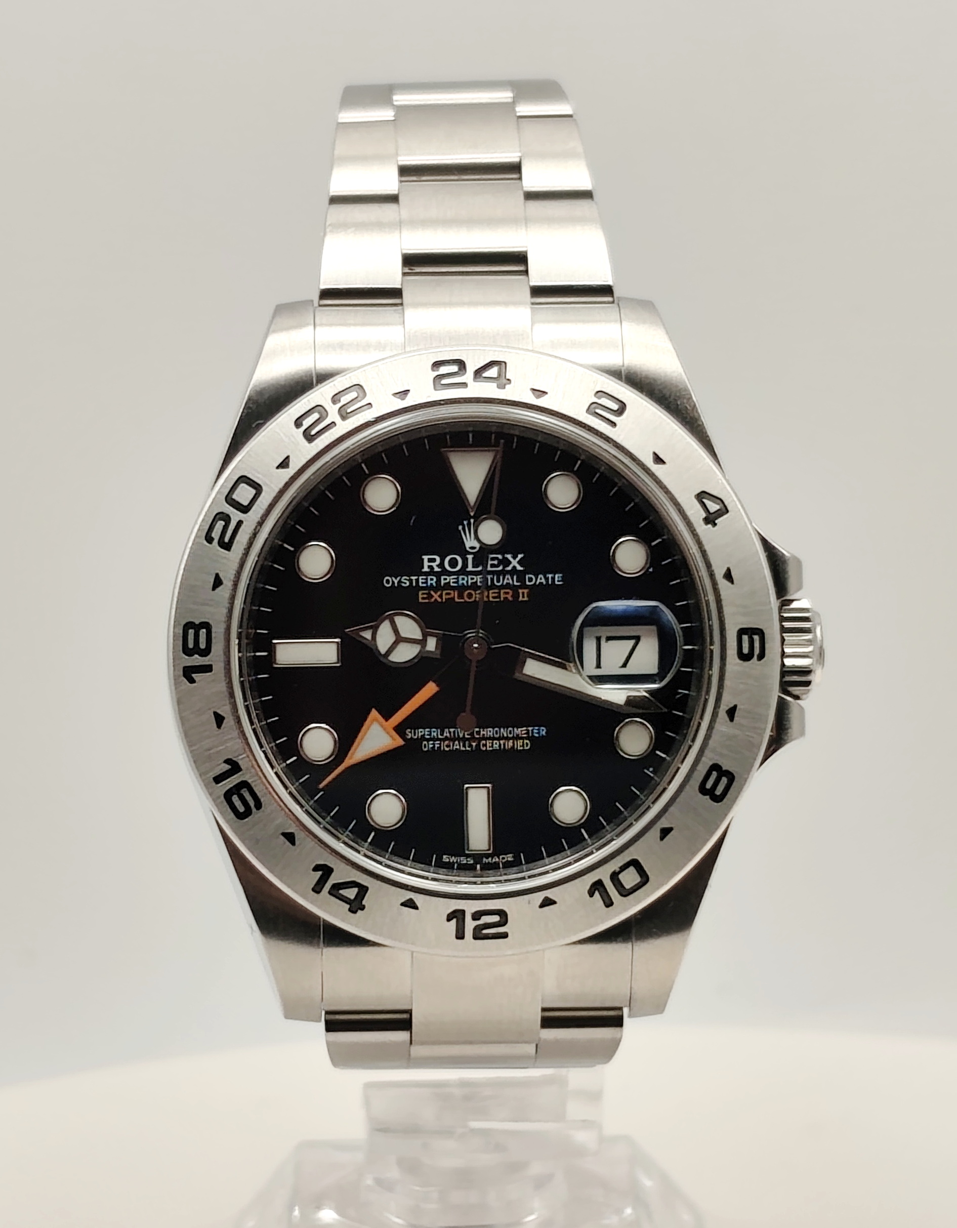 Rolex Explorer II, prodotto nel 2017, è un orologio automatico con funzione GMT e datario. La cassa è in acciaio da 42 mm, impermeabile fino a 100 metri, con lunetta in acciaio e vetro zaffiro. Il quadrante nero presenta indici a bicchierino, mentre il cinturino è in acciaio con chiusura deployante. È alimentato dal calibro 3187 e si trova in ottimo stato di conservazione, con garanzia originale. Datario ad ore ‘3’ e funzione GMT.