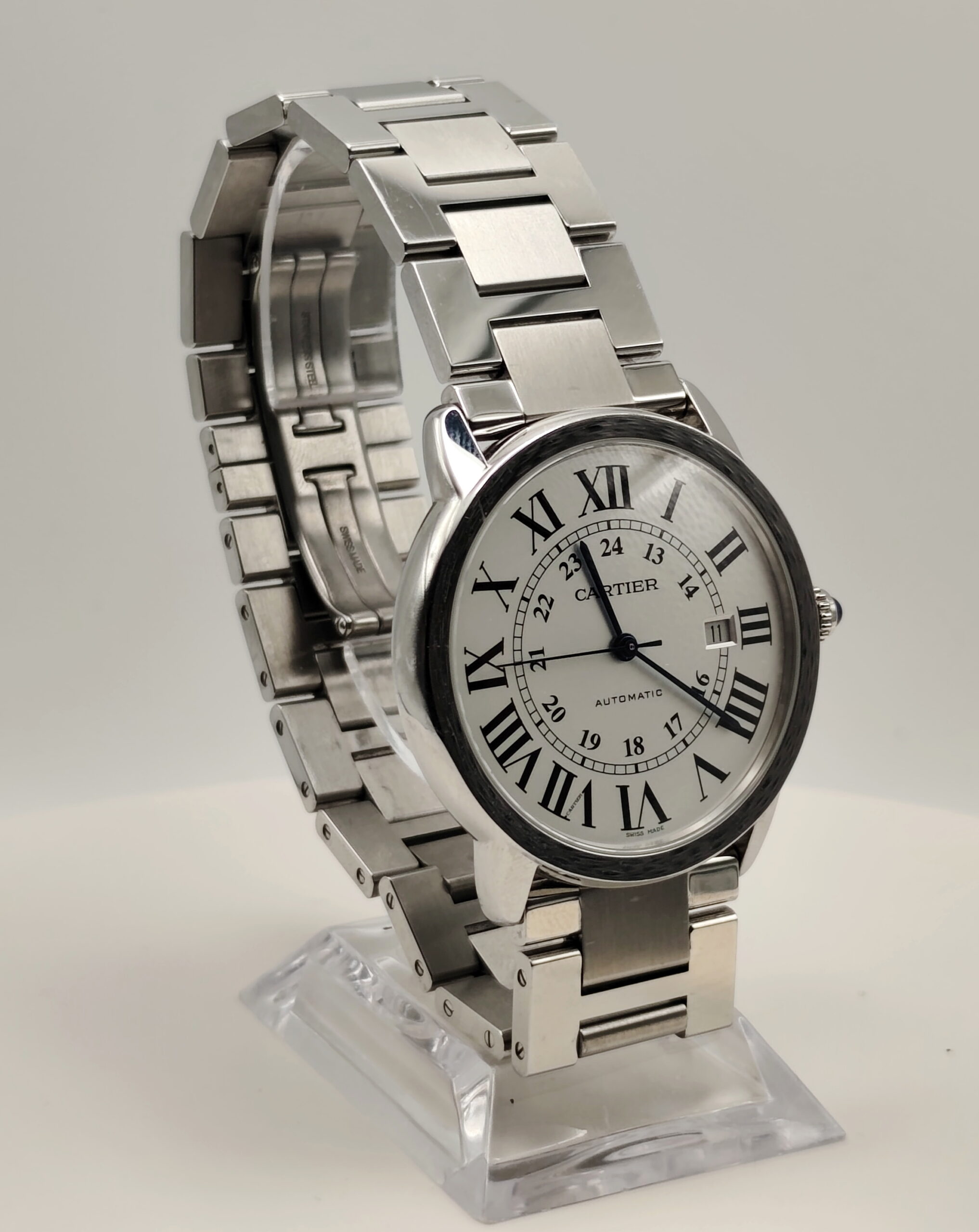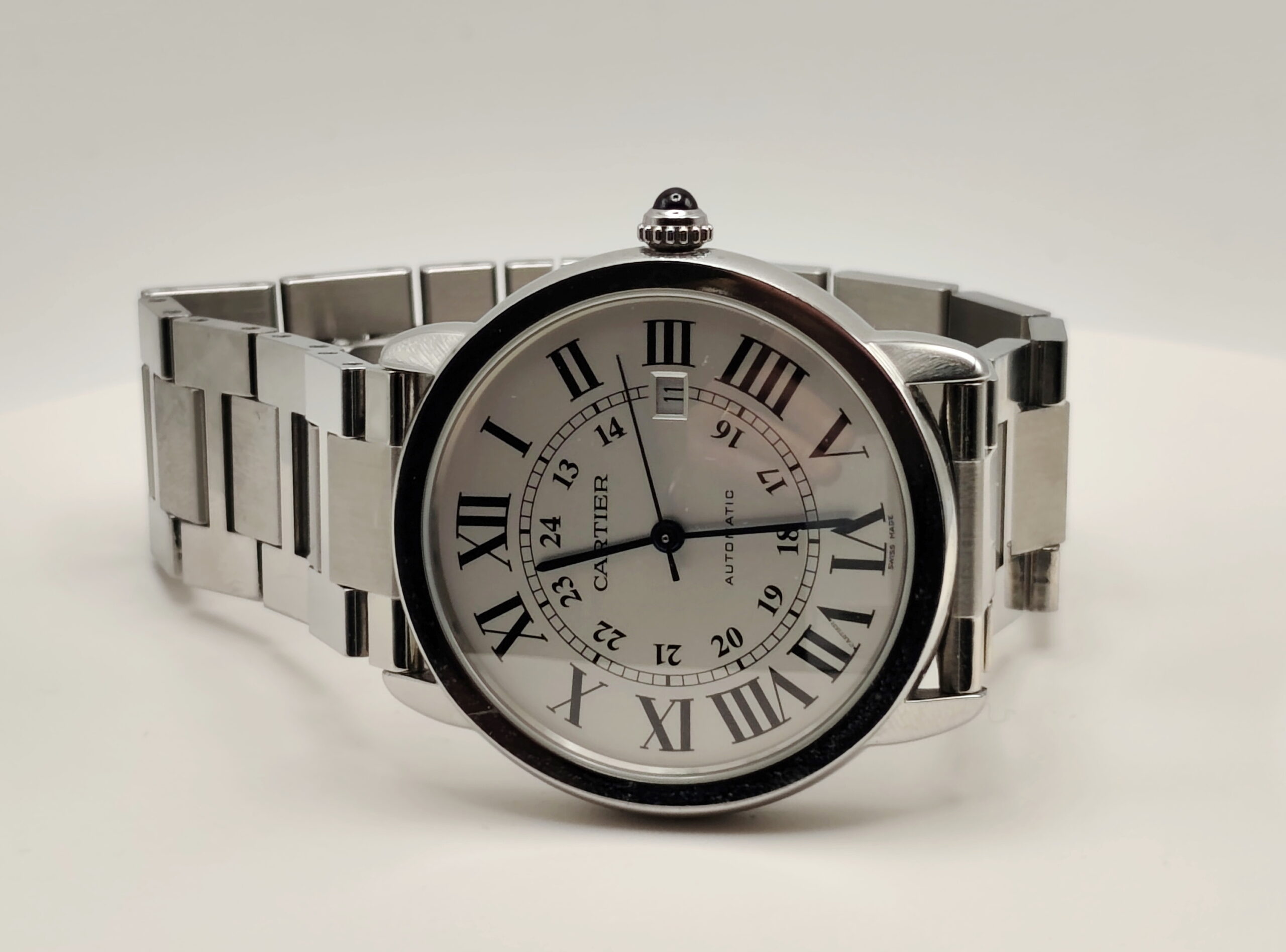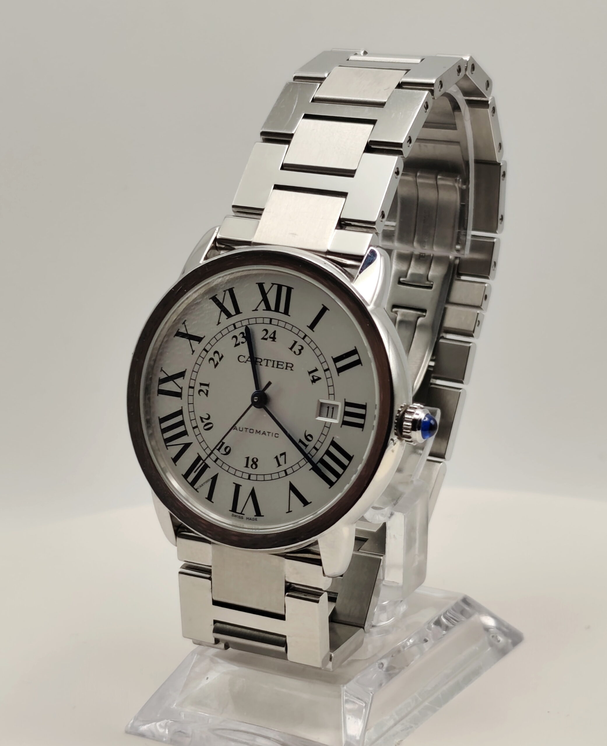 Rolex Ronde, del 2020, è un automatico con doppio fuso orario. Cassa in acciaio da 42 mm, vetro zaffiro, quadrante bianco con numeri romani (ore 12) e arabi (ore 24). Cinturino in acciaio con deployante a scomparsa. In ottimo stato, full set. Datario ad ore ‘3’.
