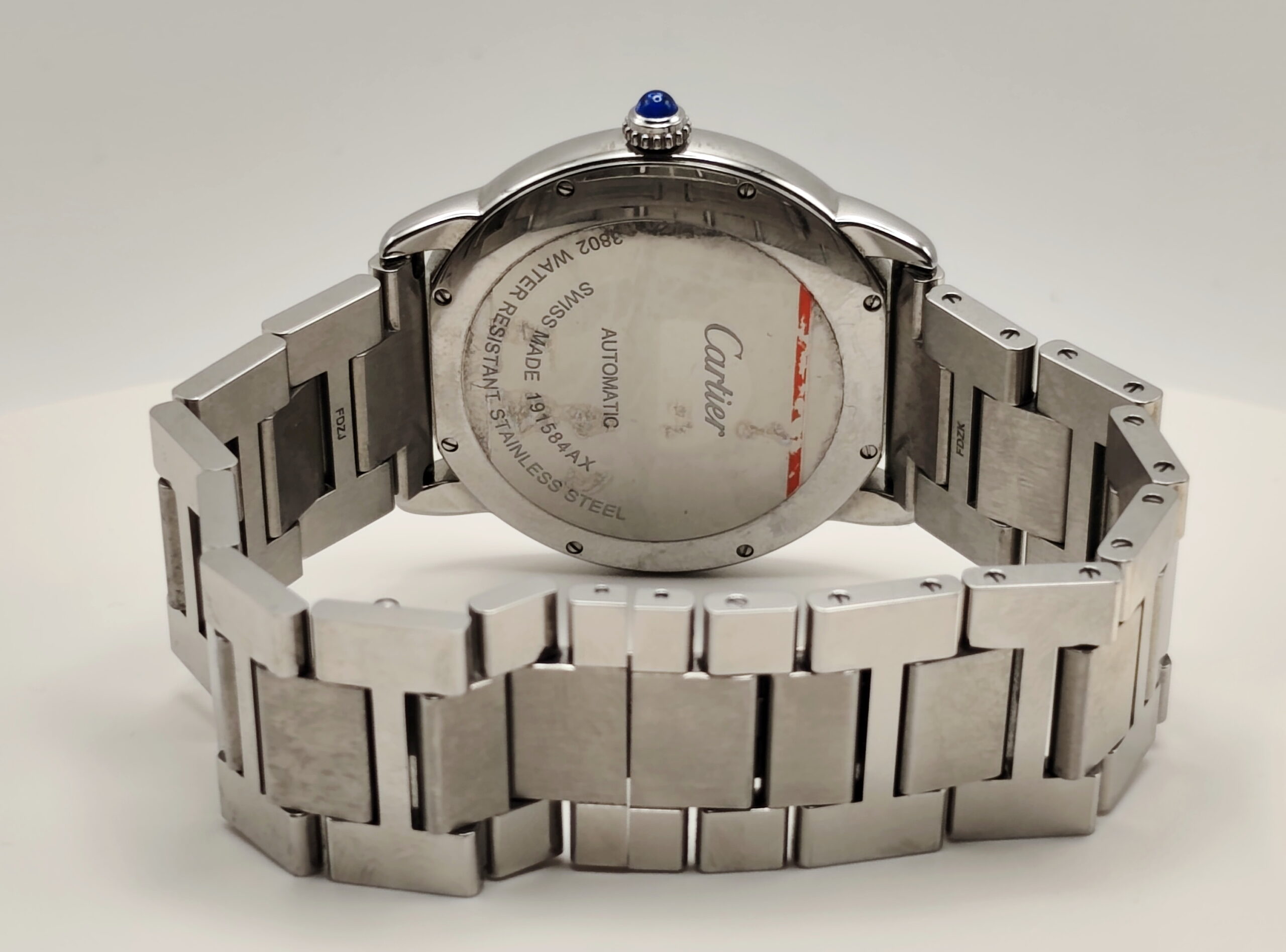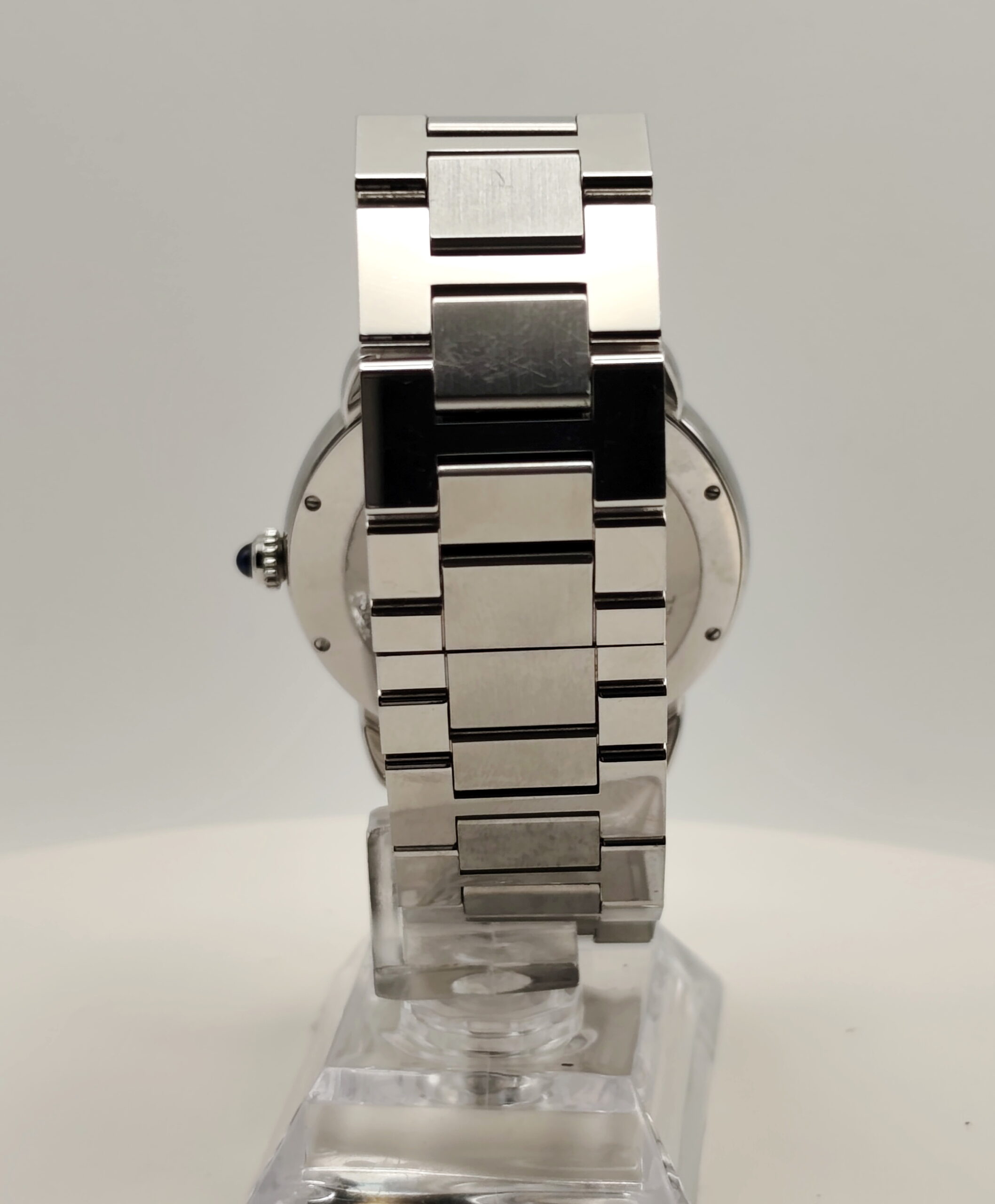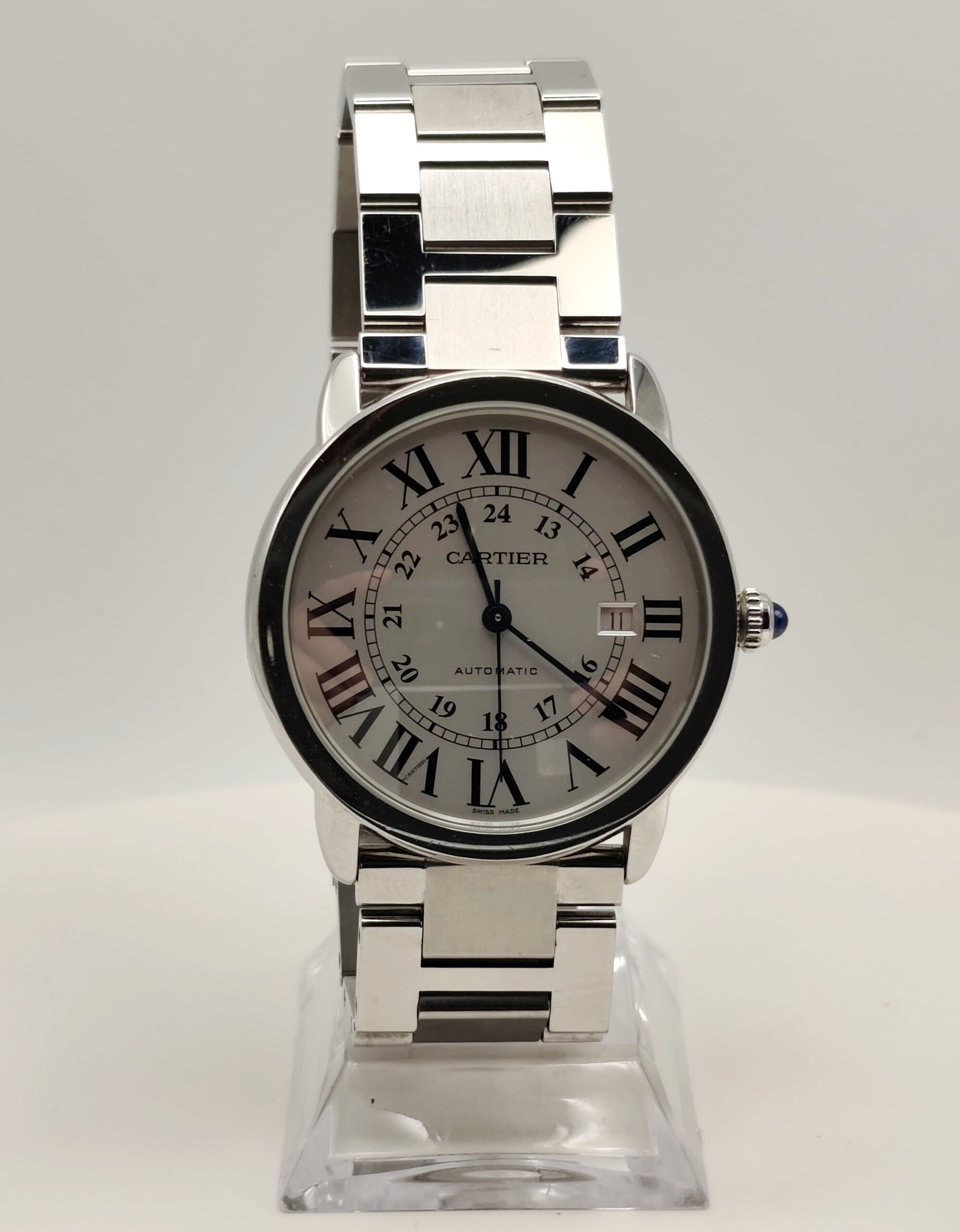 Rolex Ronde, del 2020, è un automatico con doppio fuso orario. Cassa in acciaio da 42 mm, vetro zaffiro, quadrante bianco con numeri romani (ore 12) e arabi (ore 24). Cinturino in acciaio con deployante a scomparsa. In ottimo stato, full set. Datario ad ore ‘3’.