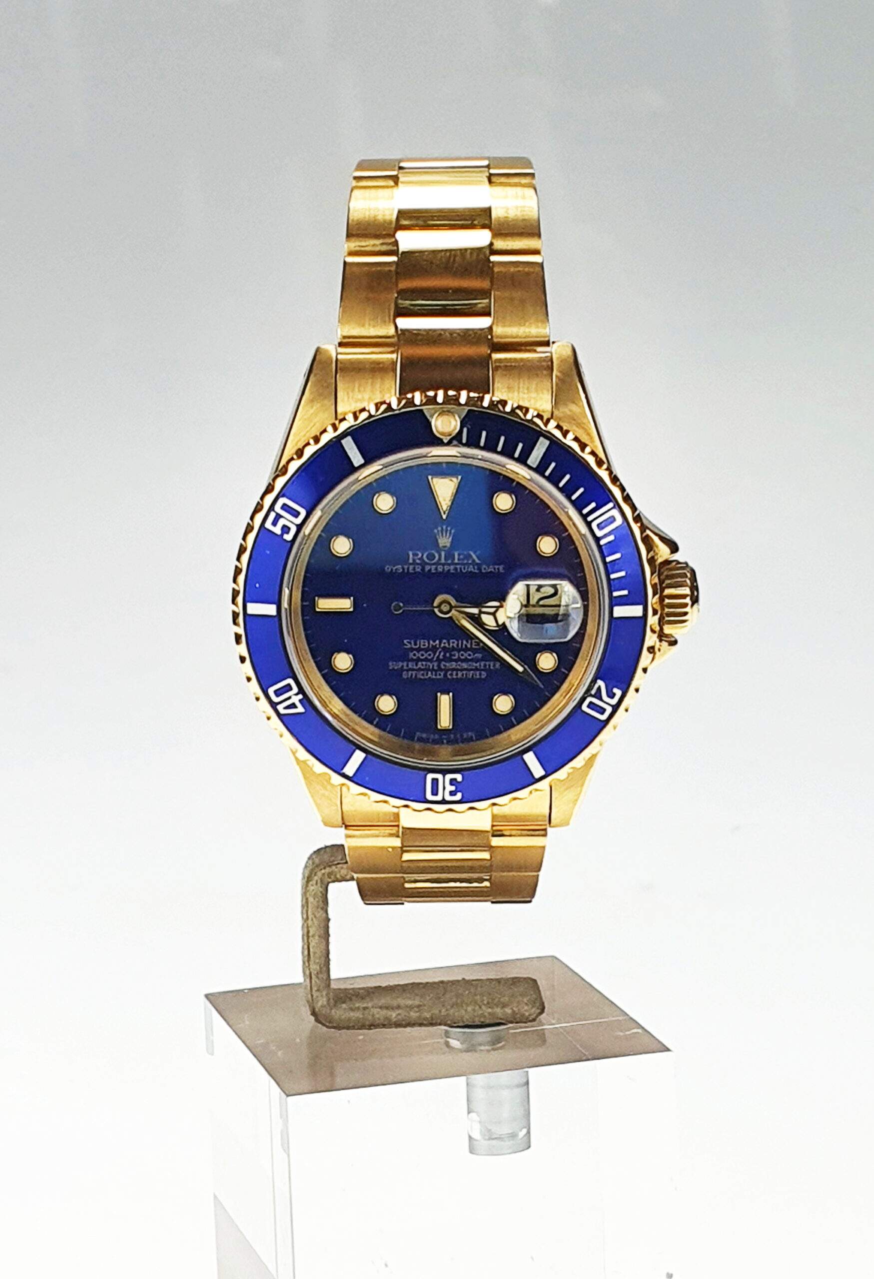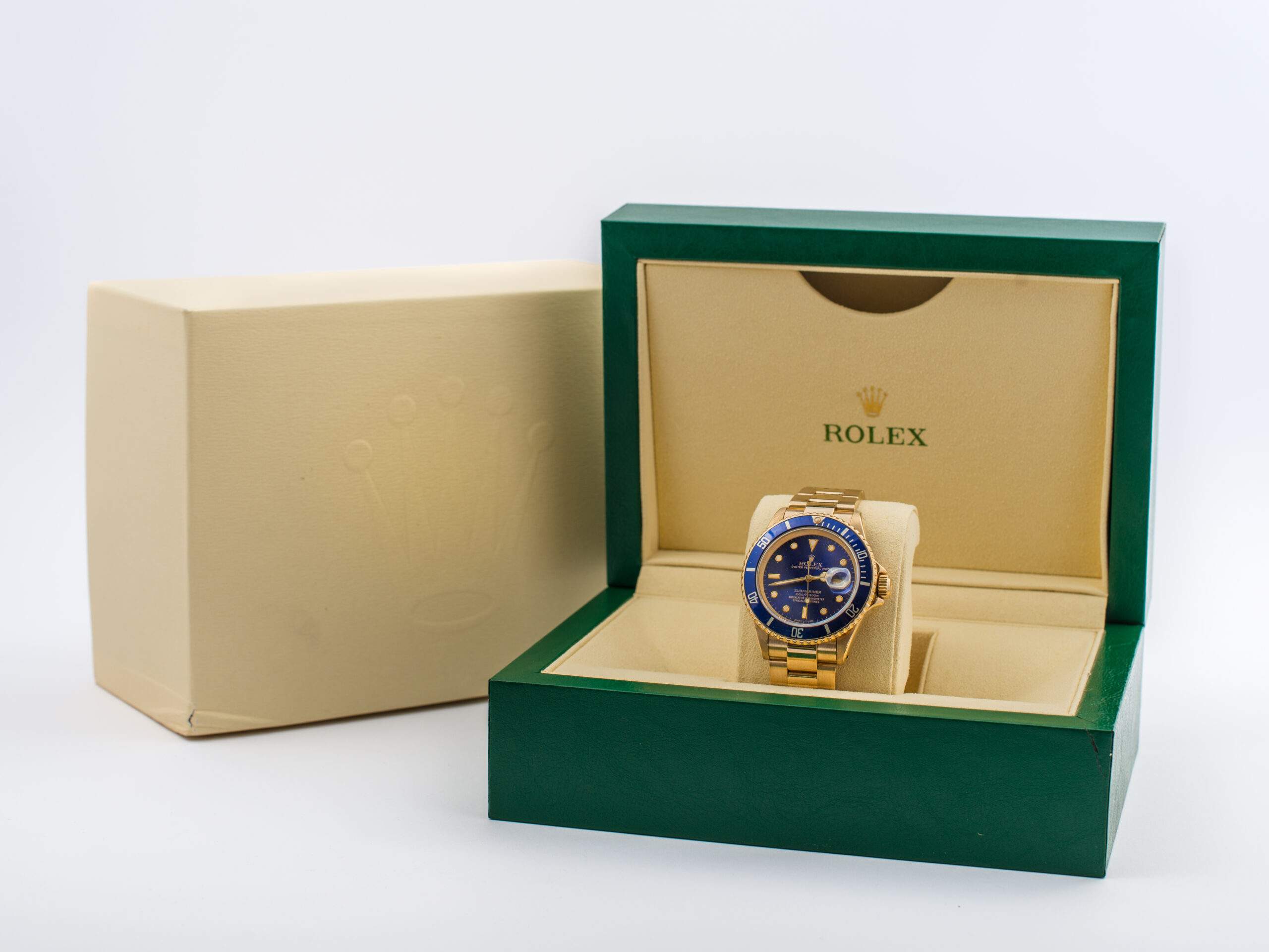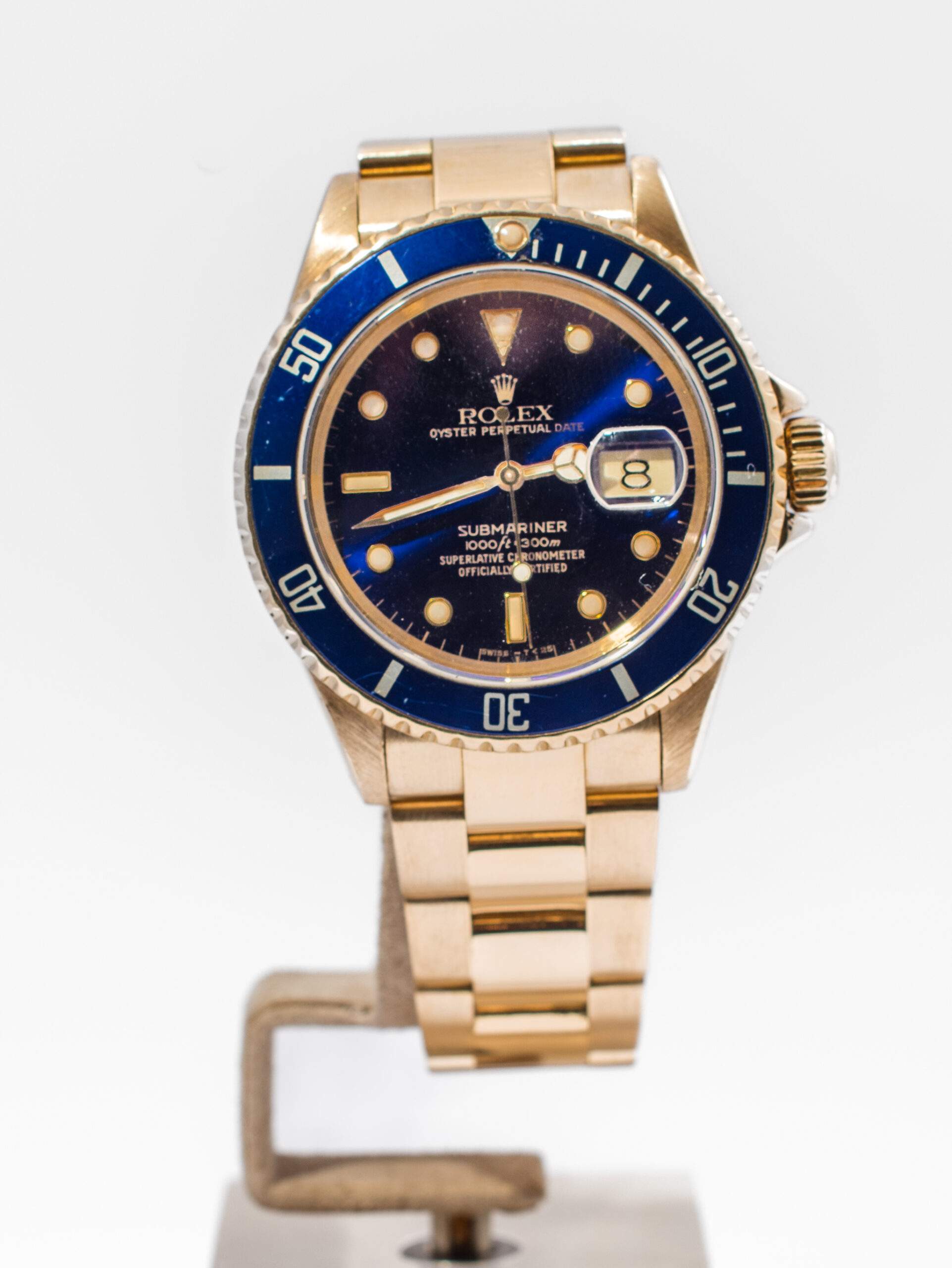 Il Rolex Submariner Date degli anni ’90 è un orologio subacqueo con cassa in oro giallo da 40 mm, lunetta in oro con inserti smaltati e quadrante blu. È dotato di un movimento automatico con calibro 3135 e una riserva di carica di 48 ore. Impermeabile fino a 300 metri, viene fornito con scatola originale.