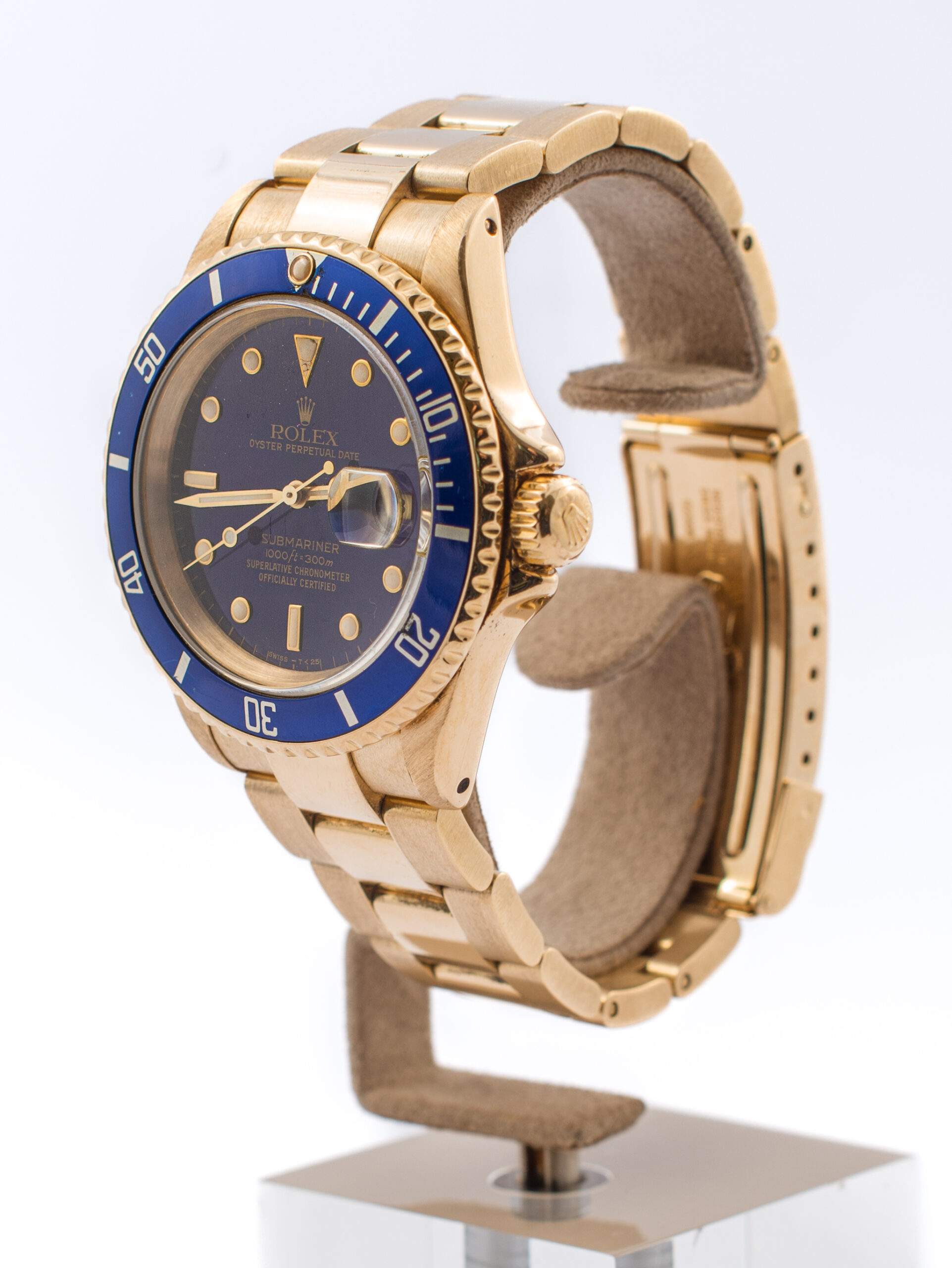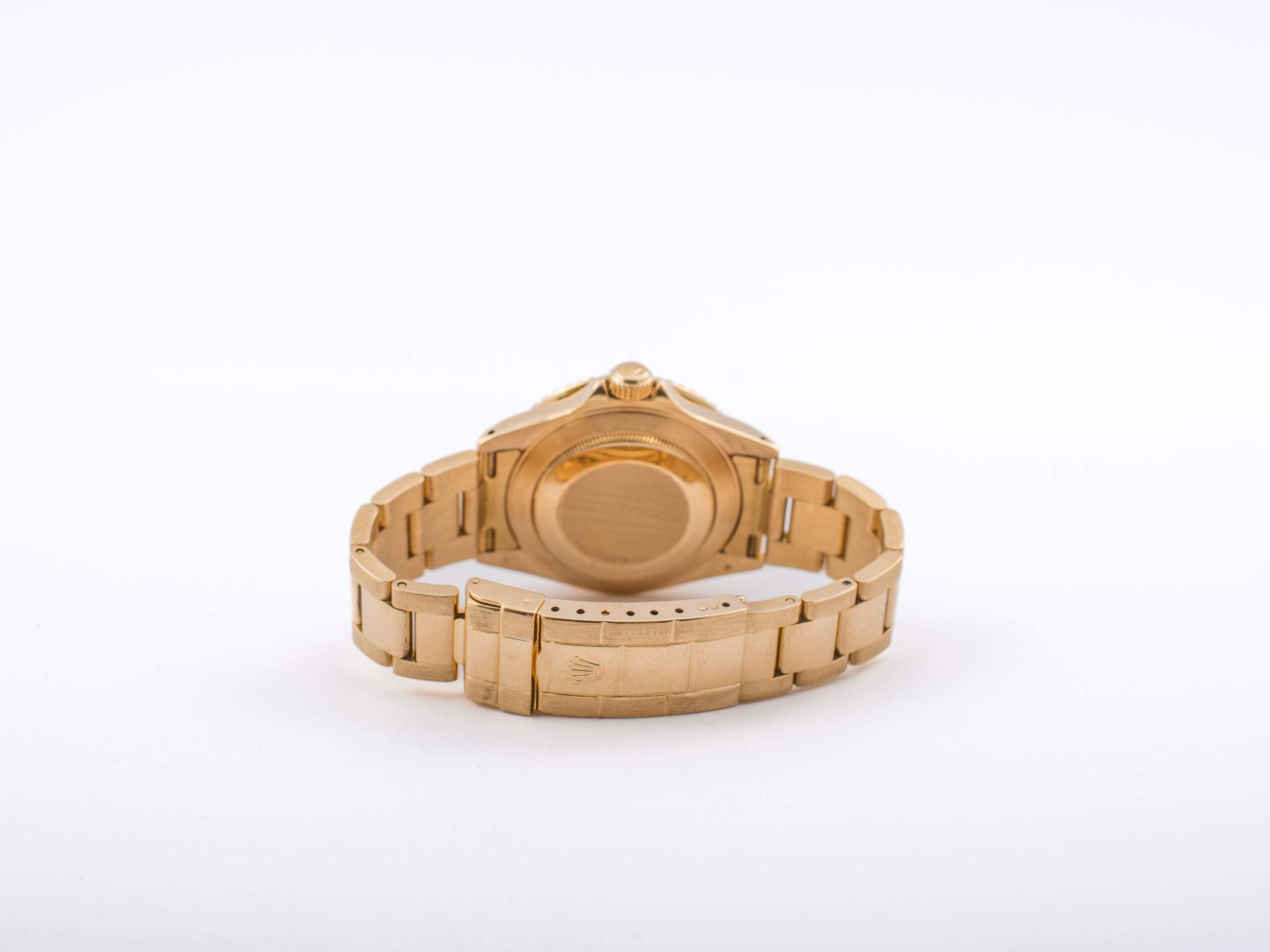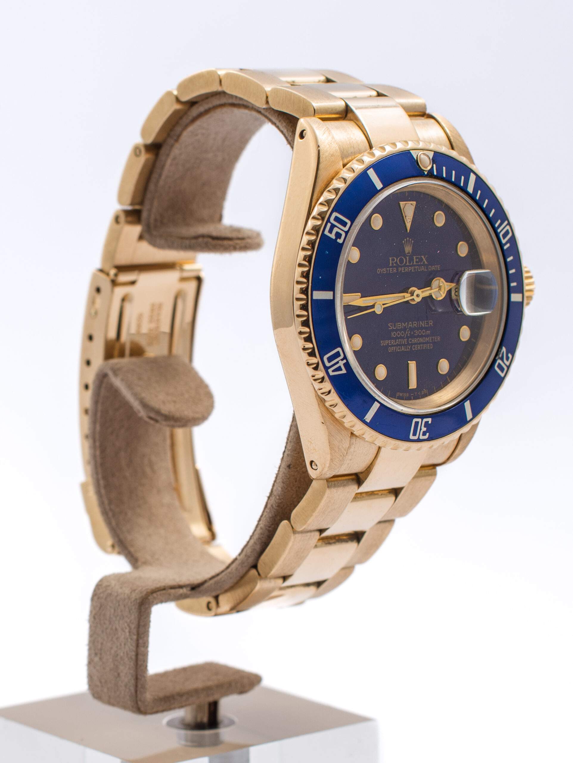 Il Rolex Submariner Date degli anni ’90 è un orologio subacqueo con cassa in oro giallo da 40 mm, lunetta in oro con inserti smaltati e quadrante blu. È dotato di un movimento automatico con calibro 3135 e una riserva di carica di 48 ore. Impermeabile fino a 300 metri, viene fornito con scatola originale.