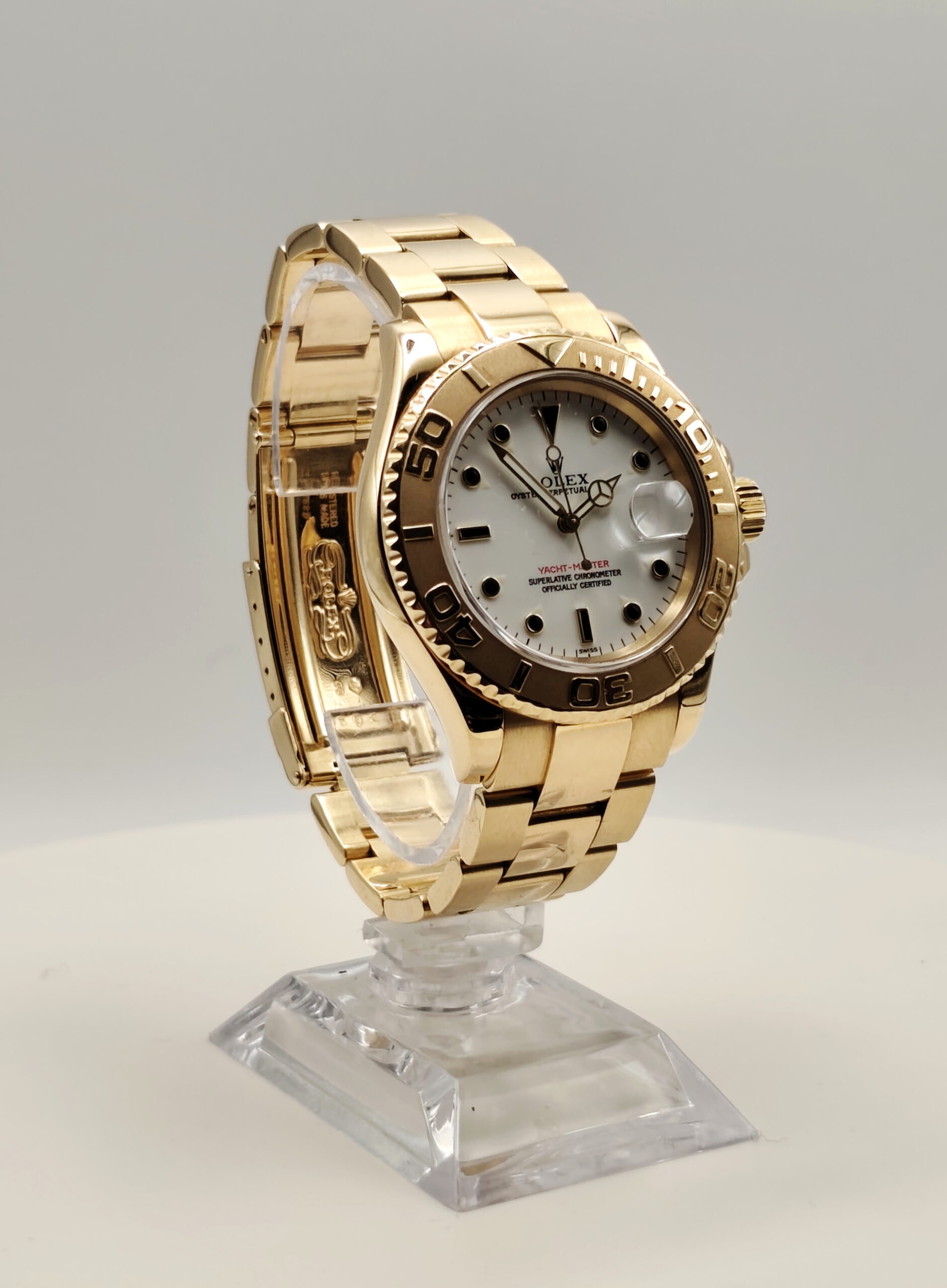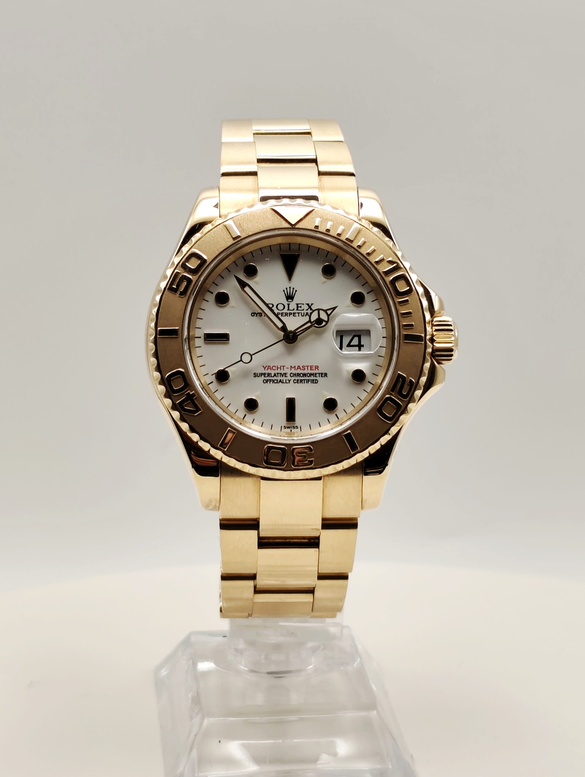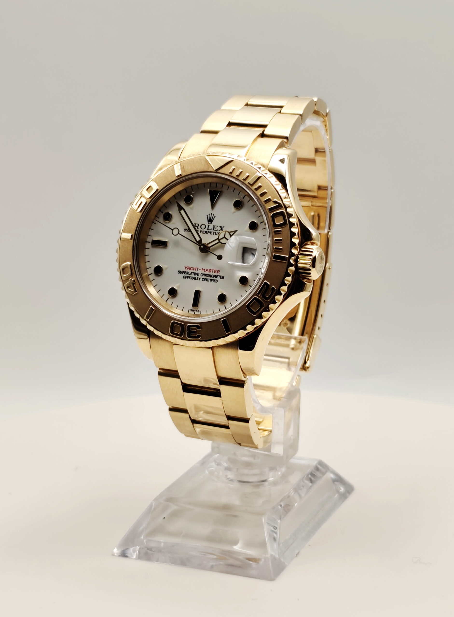 Rolex Yacht-Master, 1998, è un automatico con datario ad ore 3. Cassa in oro giallo, vetro zaffiro, quadrante bianco con indici bicchierino. Bracciale in oro giallo, chiusura deployante. In ottimo stato di conservazione.
