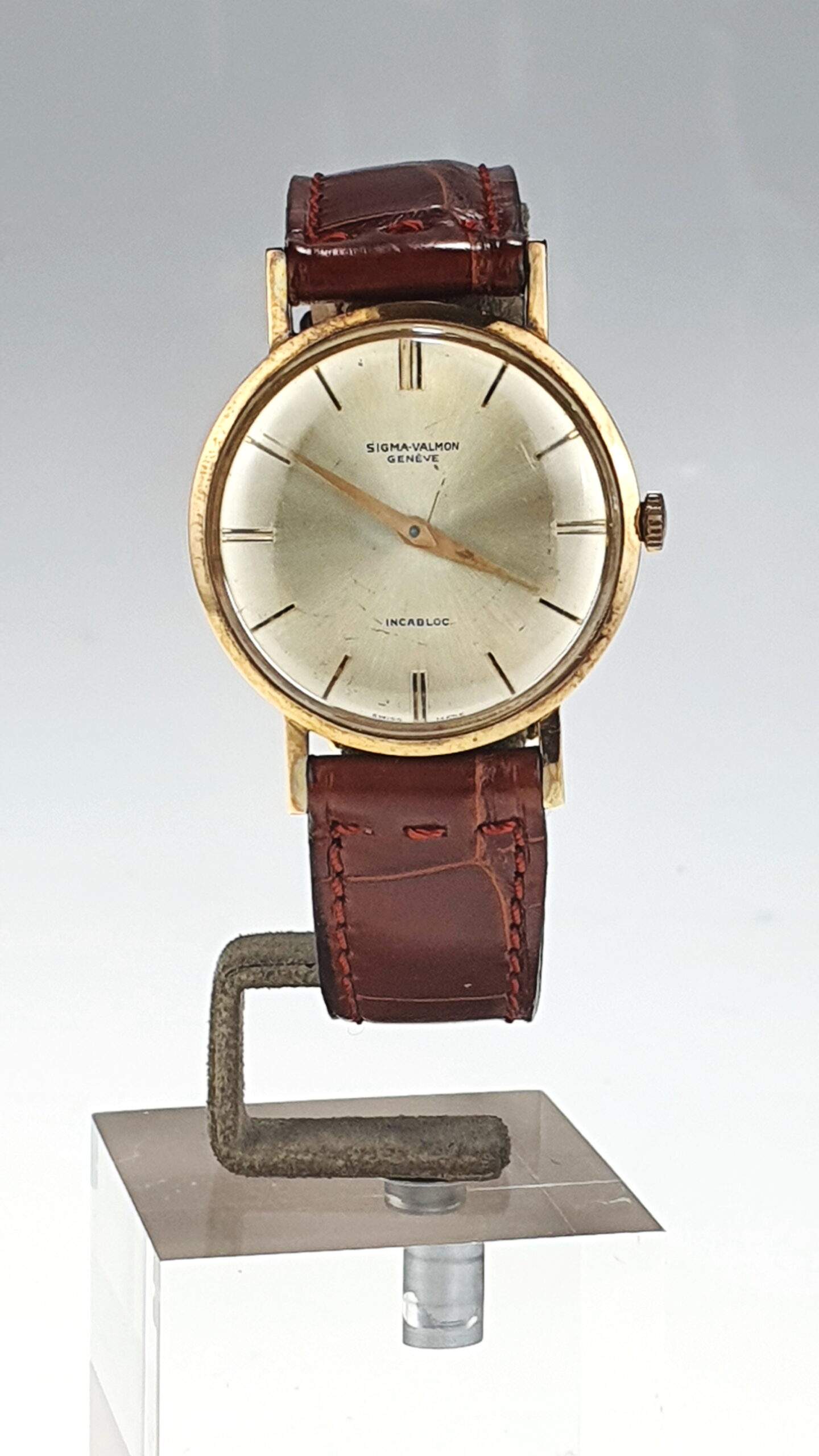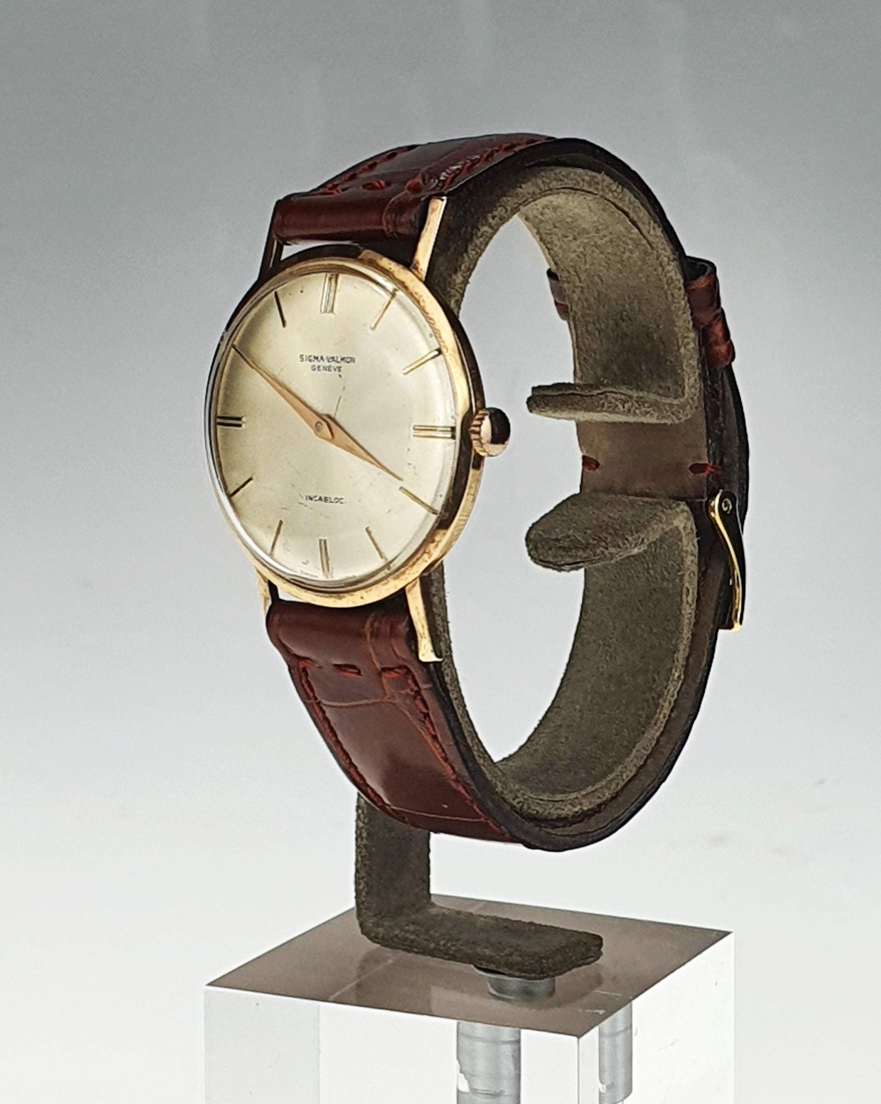 Il Sigma Valmon Vintage è un orologio degli anni ’60 con una cassa in oro giallo da 33 mm, vetro Esalite e quadrante dorato con indici a bastone. Dotato di movimento a carica manuale Incabloc, è un classico orologio da polso elegante e raffinato, con cinturino in pelle marrone e chiusura ad ardiglione in metallo placcato. Perfetto per collezionisti e amanti dell’orologeria d’epoca.