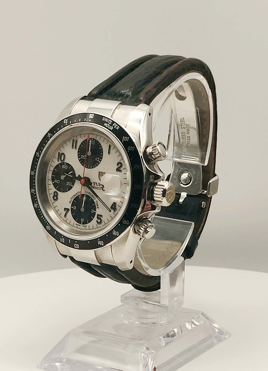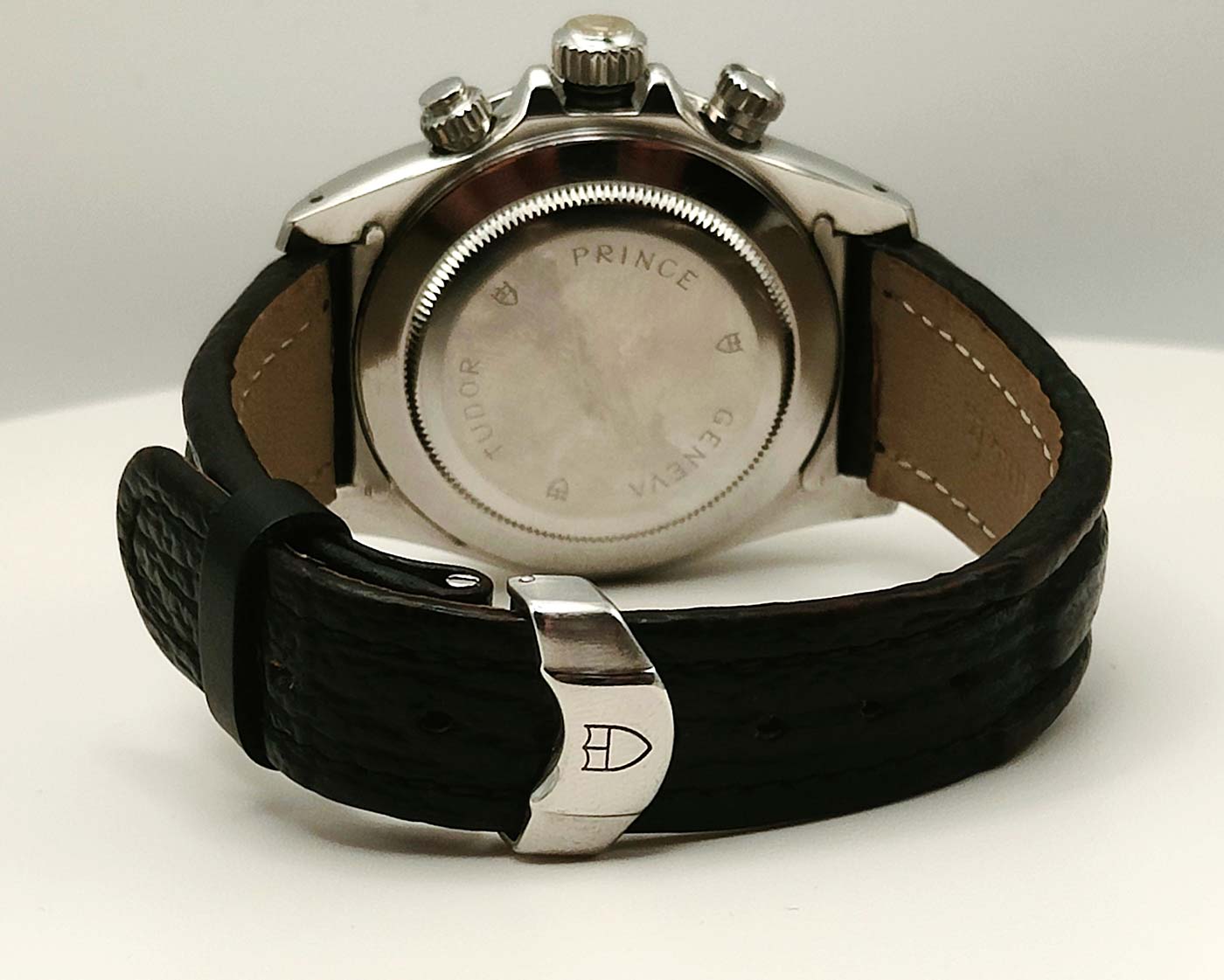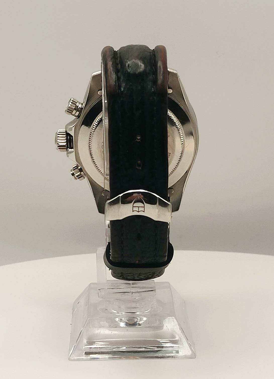 Cronografo con triplo contatore, tasti crono sopra e sotto la corona di carica
