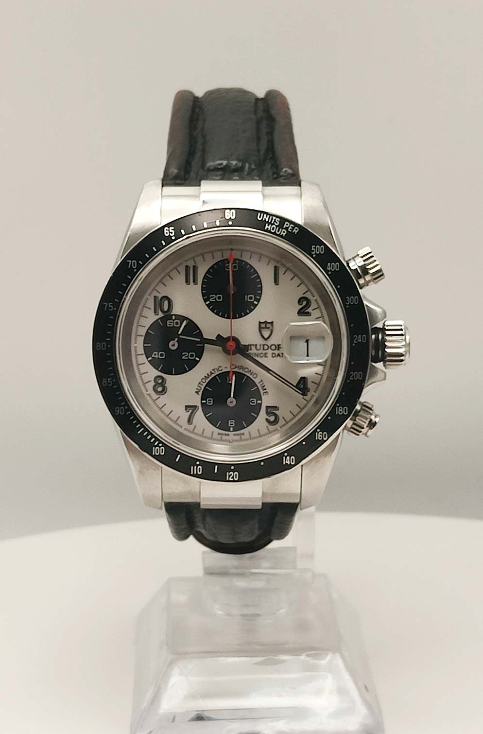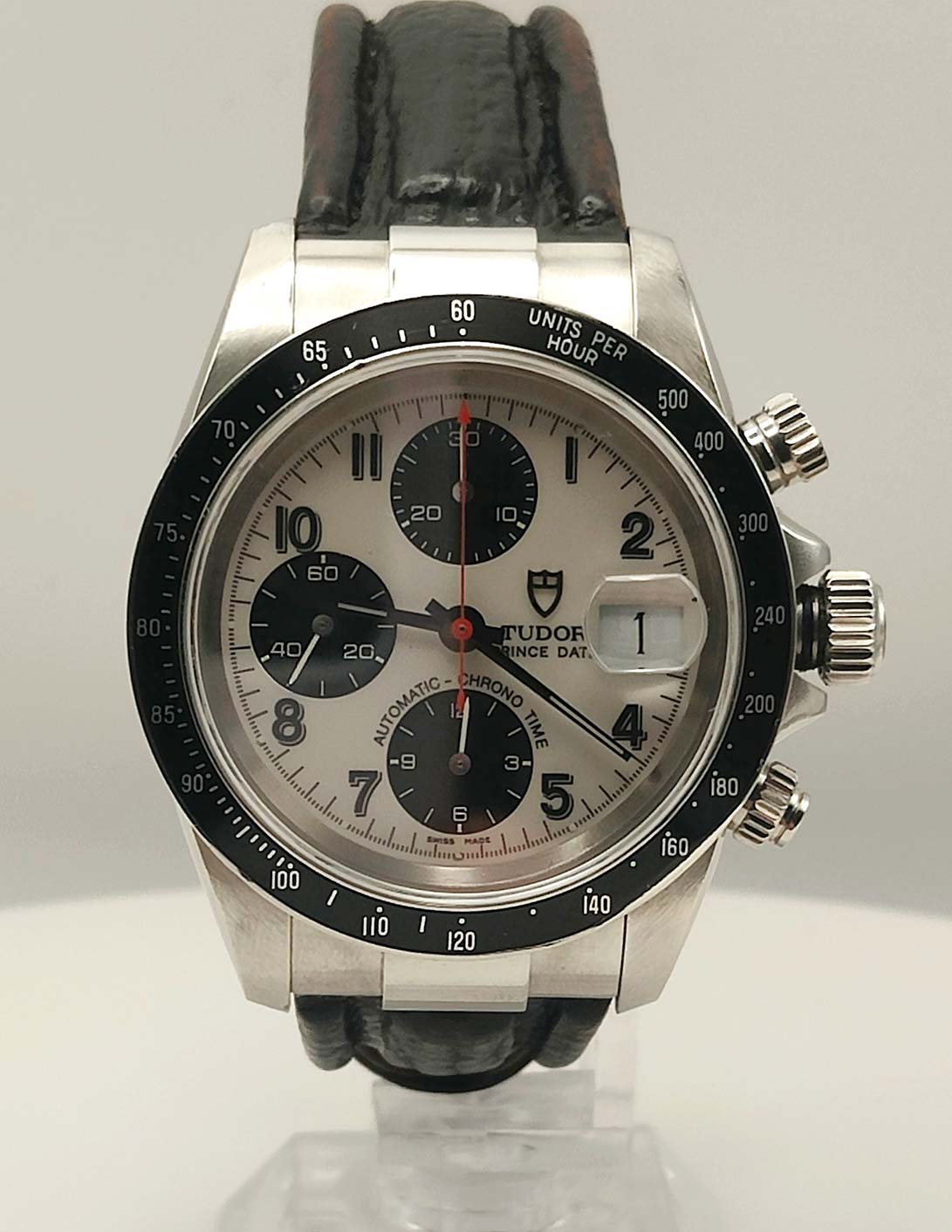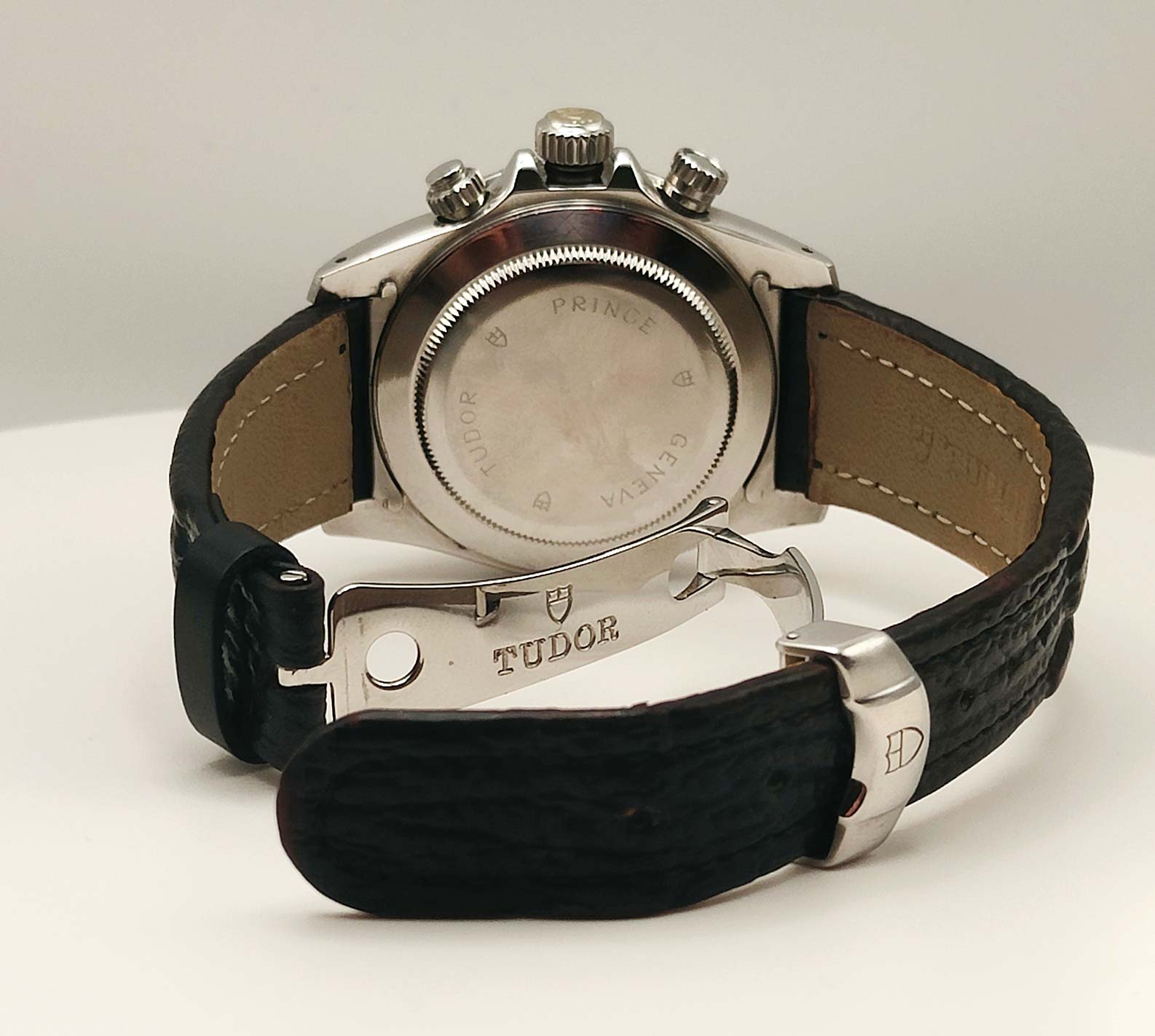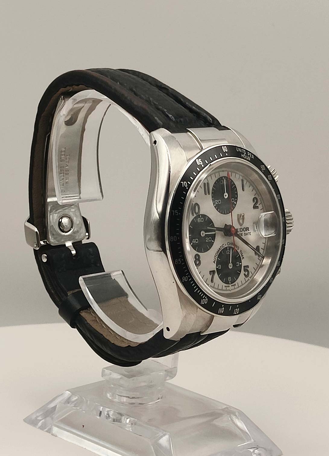Cronografo con triplo contatore, tasti crono sopra e sotto la corona di carica