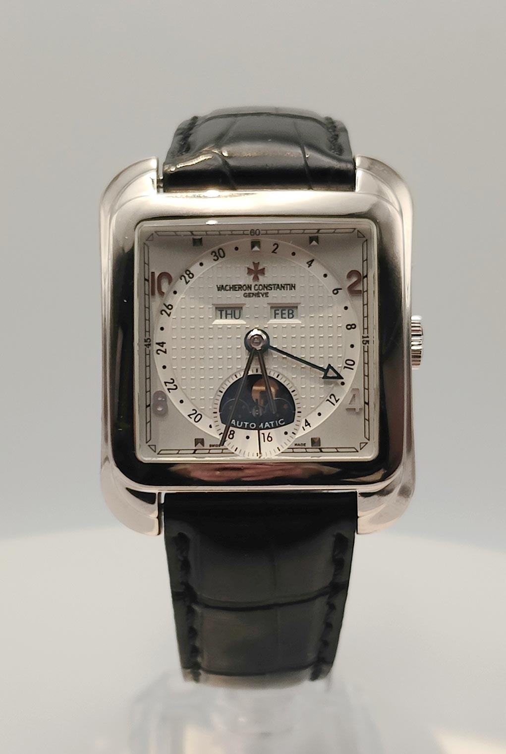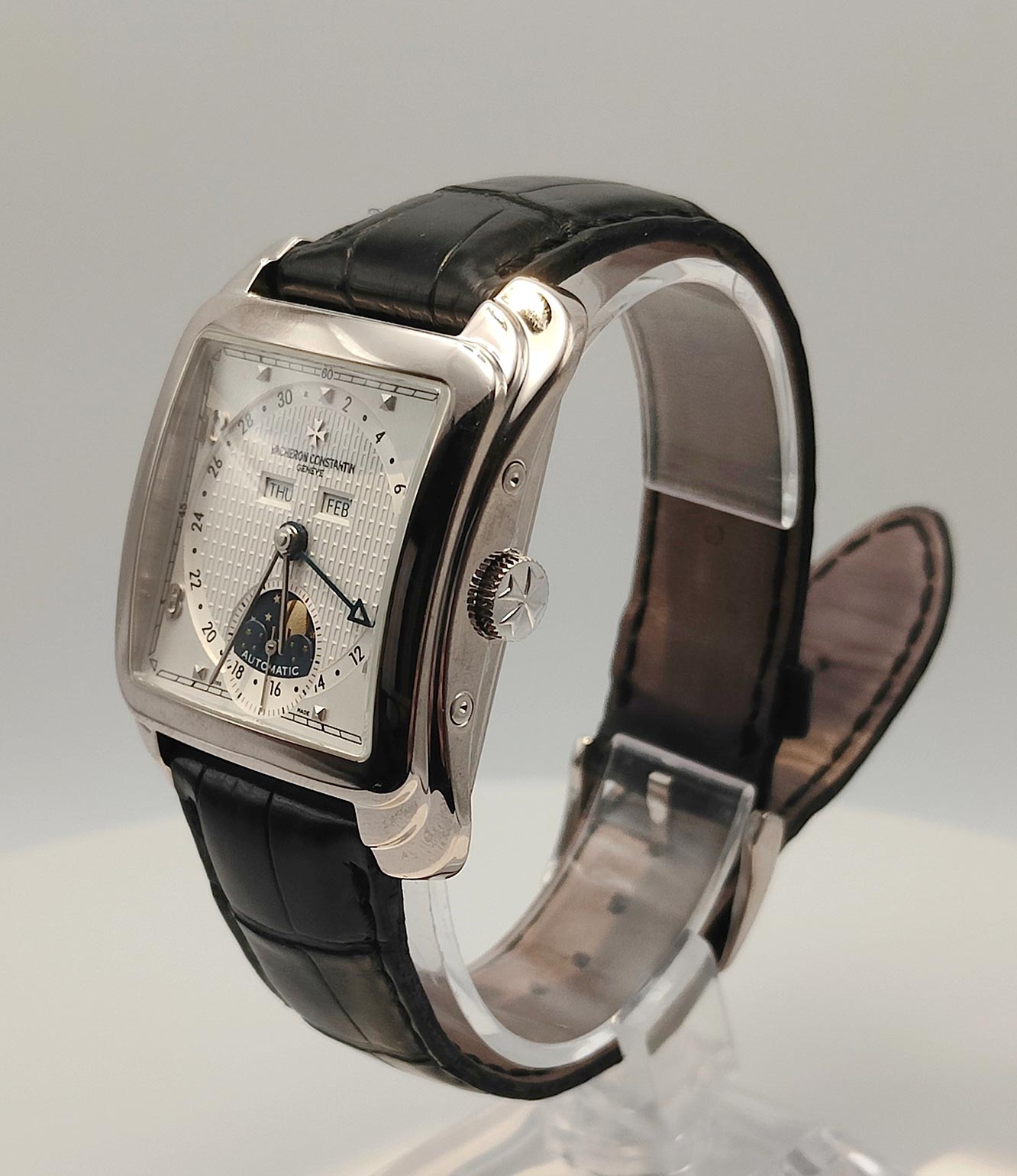 Un capolavoro di alta orologeria che fonde il fascino del design “Cioccolatone” degli anni ’50 con la precisione meccanica moderna. Questo Vacheron Constantin Toledo Historiques del 2006 è la quintessenza dell’eleganza geometrica e della raffinatezza tecnica. L’orologio non è solo un esercizio di stile, ma un sofisticato strumento di misurazione del tempo. Dispone di un calendario completo e delle fasi lunari, gestibili tramite il pennino di regolazione incluso: